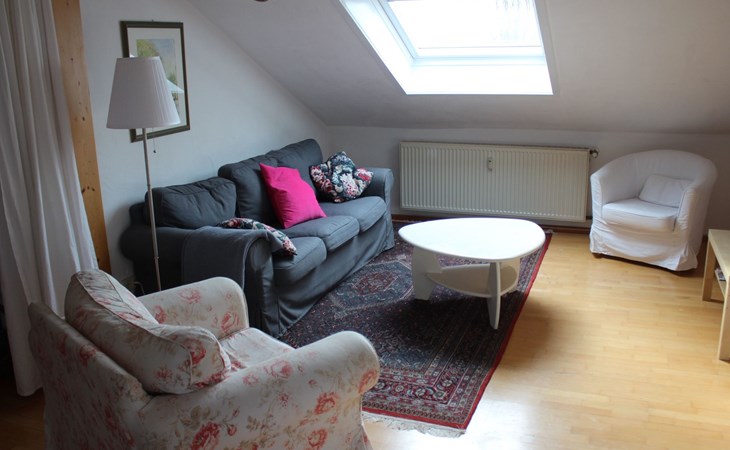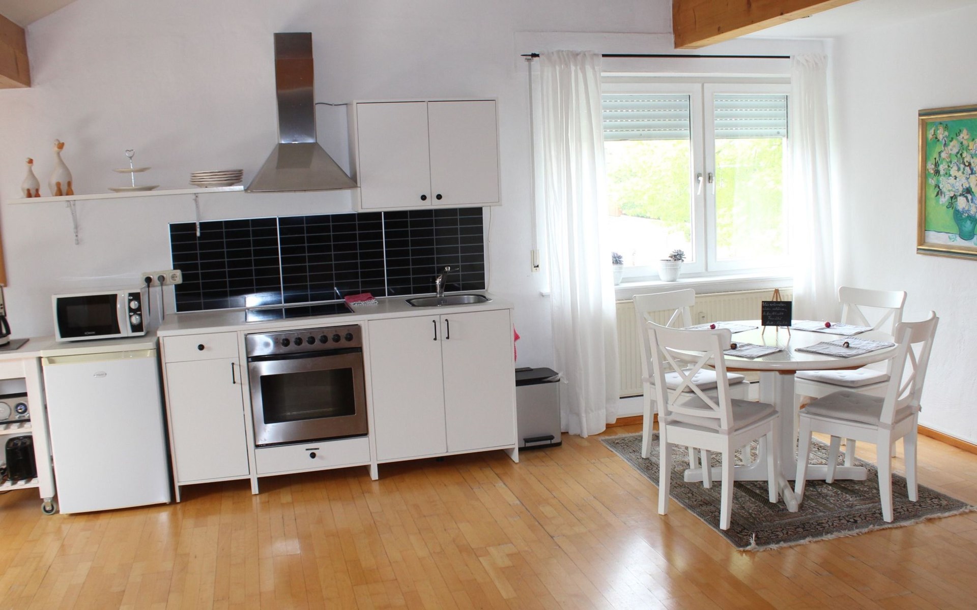 Im Inneren der Wohnung werden Sie von einem großzügigen, hellen Wohn- und Schlafraum im Erdgeschoss begrüßt, der mit Parkettboden, einem LCD-Farbfernseher und einer Küchenzeile - ausgestattet mit einem 4-Plattenherd (Ceranfeld) und Backofen, einem Kühlschrank inklusive 4 Sterne Gefrierfach, einer Mikrowelle, einem Wasserkocher, einem Toaster und einer Kaffeemaschine - für Ihren Komfort sorgt. Für gemütliche Mahlzeiten steht ein runder Esstisch mit vier Stühlen bereit. Ein schönes Bad mit Wannendusche sowie ein Schlafzimmer mit einem komfortablen Doppelbett (2m x 2m) runden die Ausstattung auf dieser Ebene ab. Über eine Holz-Wendeltreppe gelangen Sie in das zweite Schlafzimmer mit einem 1,60 m x 2,00 m großen Bett sowie zur Galerie, womit die Wohnung ideal für 1-4 Personen geeignet ist. Bettwäsche und Handtücher werden gestellt. WLAN ist vorhanden.