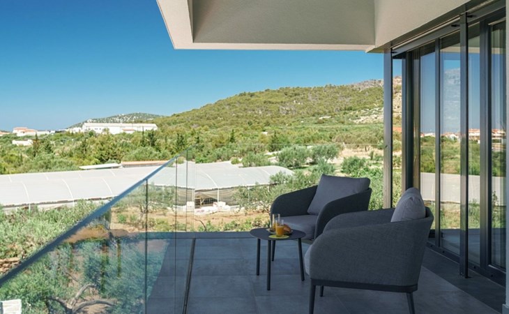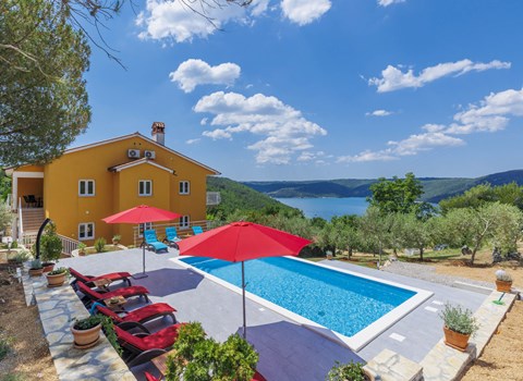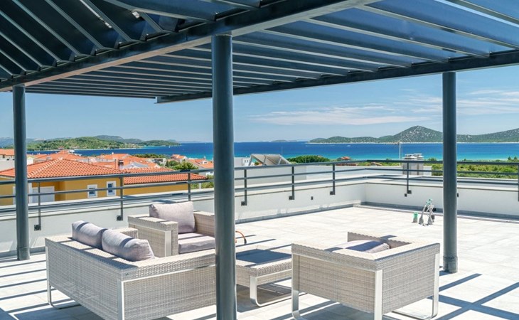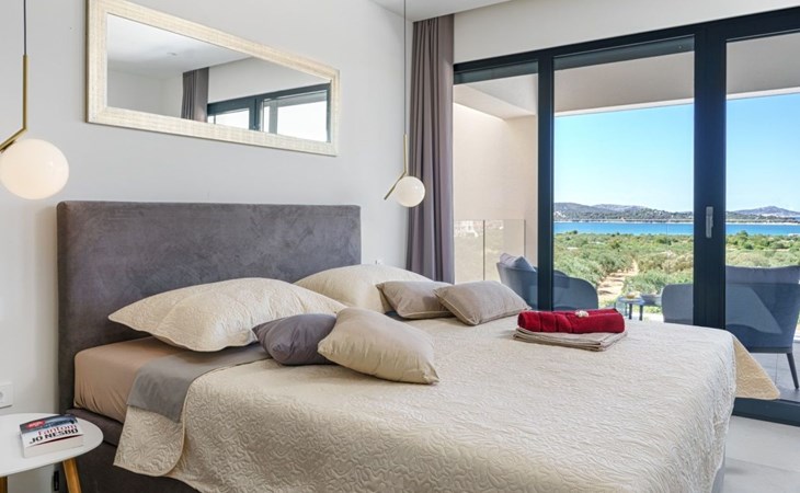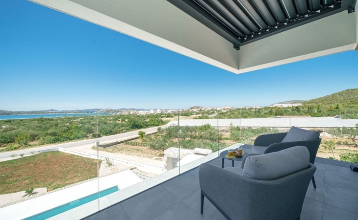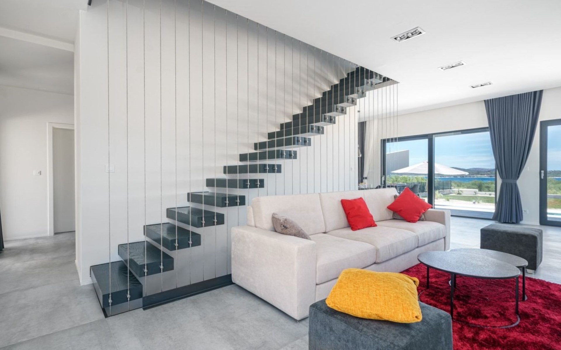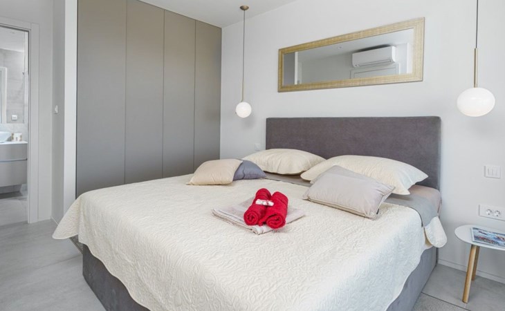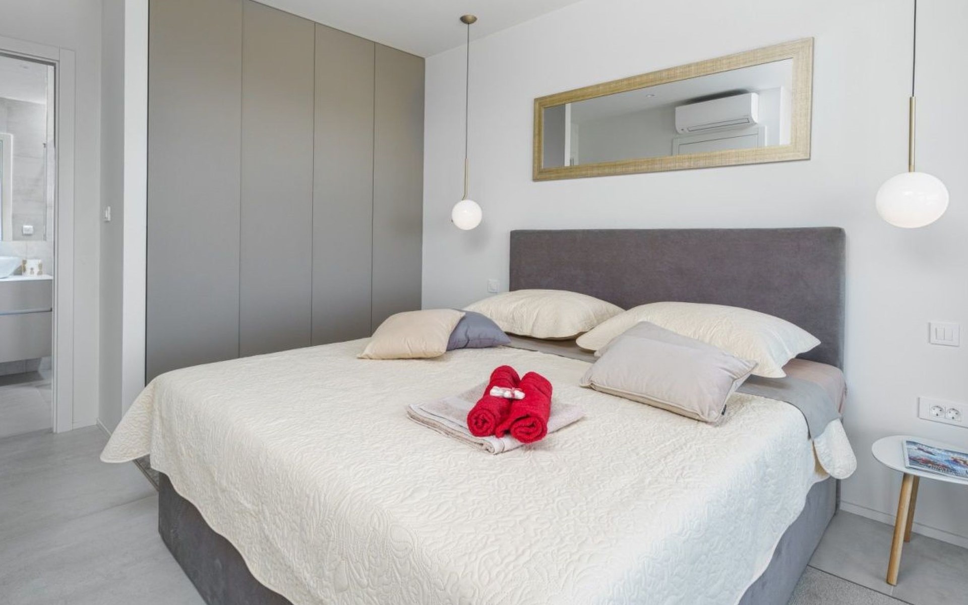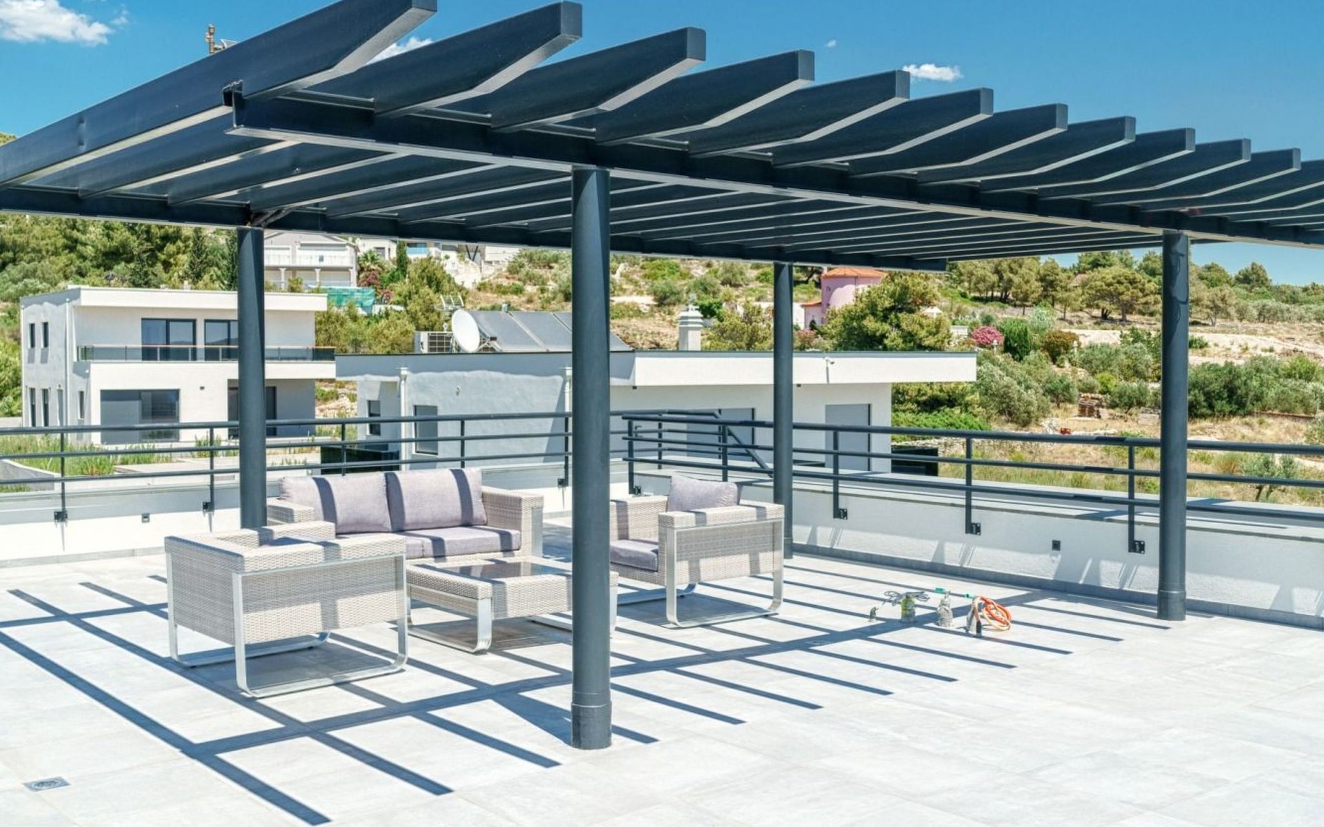 Der Außenbereich dieses Ferienhauses ist so gestaltet, dass er Ihnen eine ruhige und private Oase bietet. Das Highlight ist zweifelsohne der große 55 m² große Pool, der an warmen Sommertagen und -nächten für Abkühlung sorgt. Rund um den Pool bietet der gepflegte Garten, der nur Ihnen zur Verfügung steht, eine üppige Kulisse und zusätzlichen Raum zum Entspannen. Die Villa verfügt über Terrassen auf beiden Etagen und eine weitere auf dem Dach, die alle mit bequemen Loungemöbeln ausgestattet sind. Diese Terrassen sind ideal, um die frische Luft zu genießen, den Panoramablick auf das Meer und die Insel zu genießen oder einfach Zeit mit Ihren Lieben zu verbringen.