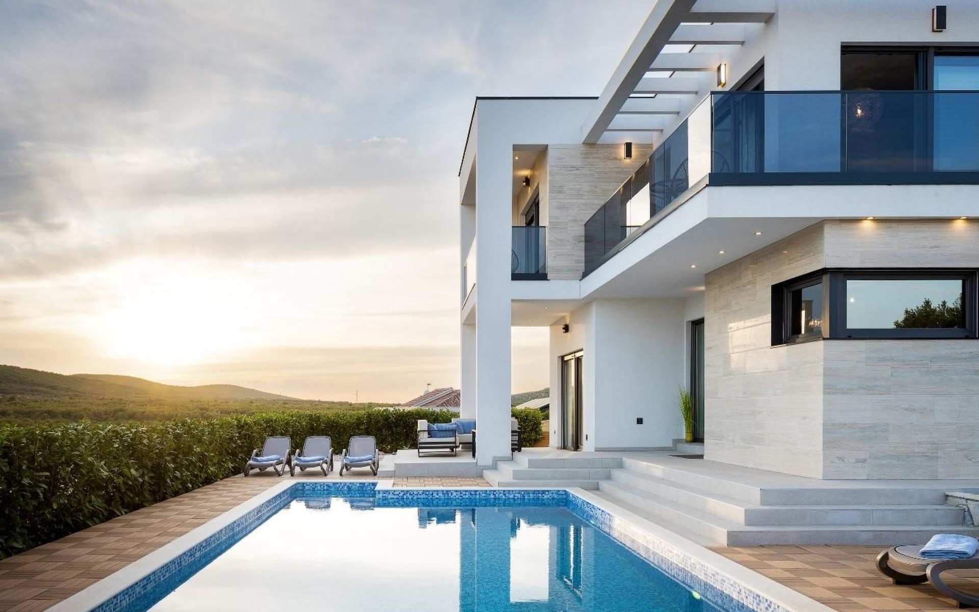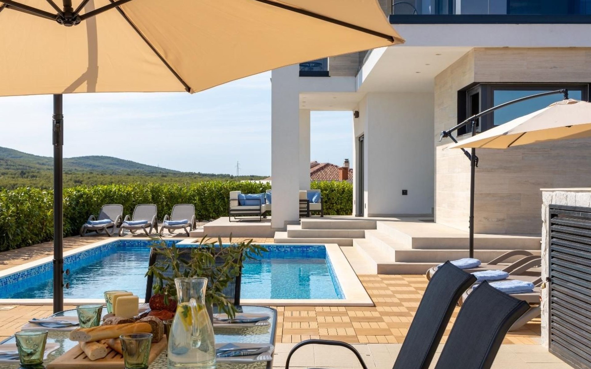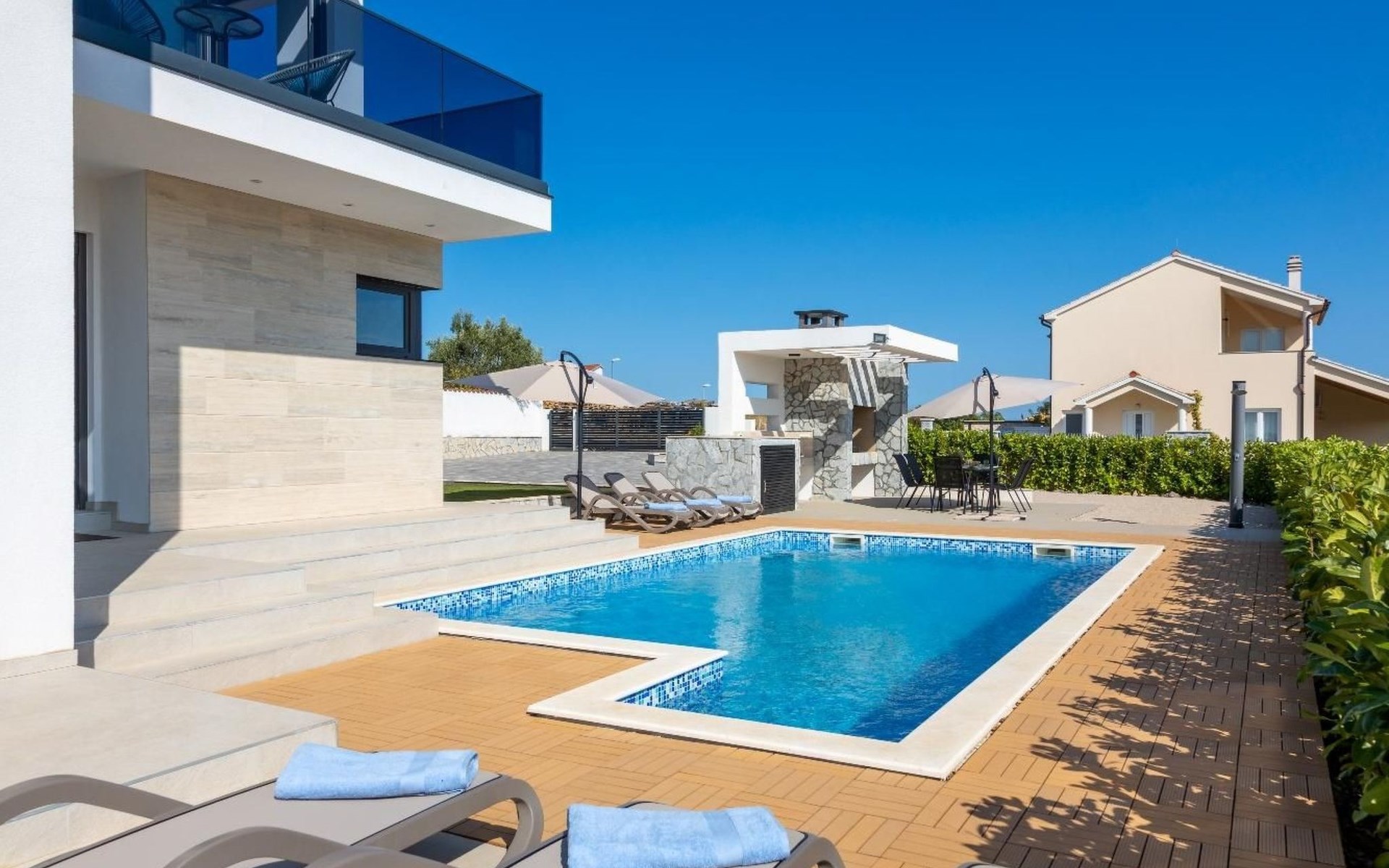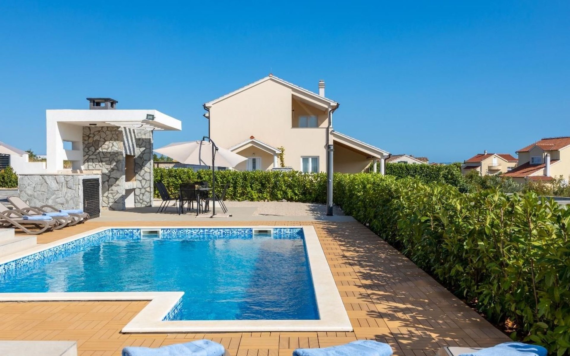Der Außenbereich des Hauses ist ebenso beeindruckend mit seinem vollständig privaten Garten und einem großzügigen Pool, der an warmen Sommertagen zur Abkühlung einlädt. Die Sonnenliegen laden zu entspannten Momenten in der Sonne ein. Für diejenigen, die gerne im Freien kochen und speisen, bieten die Außenküche und der Essbereich den perfekten Ort, um an lauen Abenden gegrillte Mahlzeiten mit den Liebsten zu genießen.