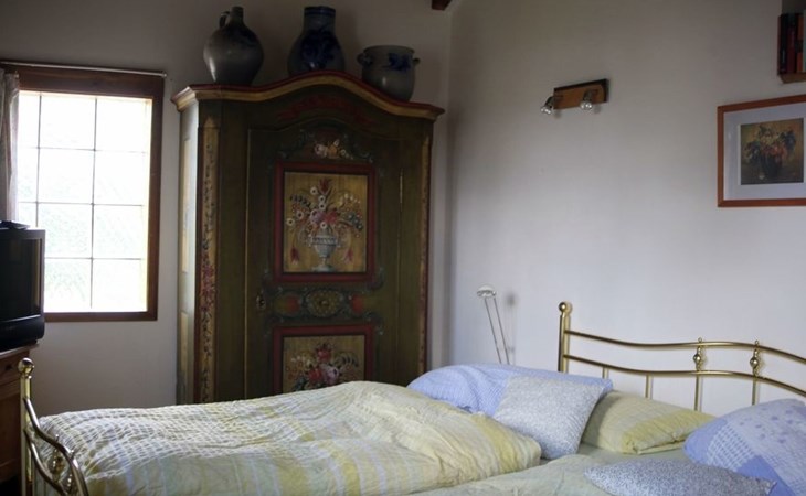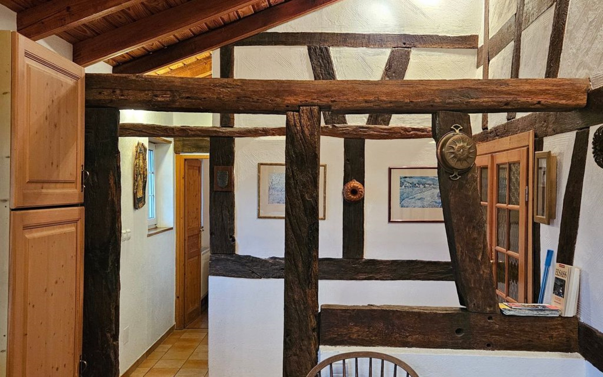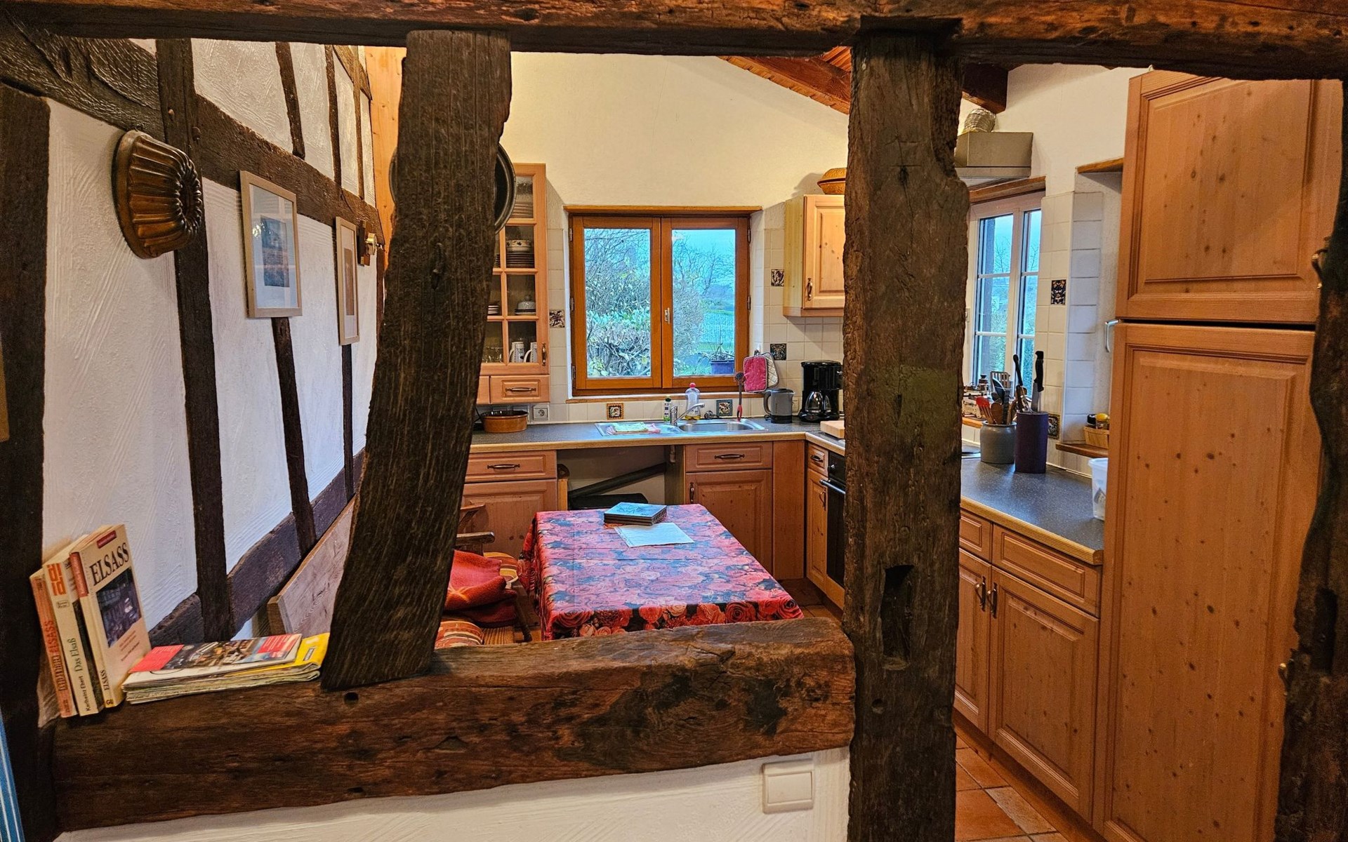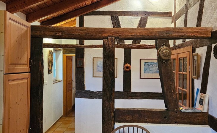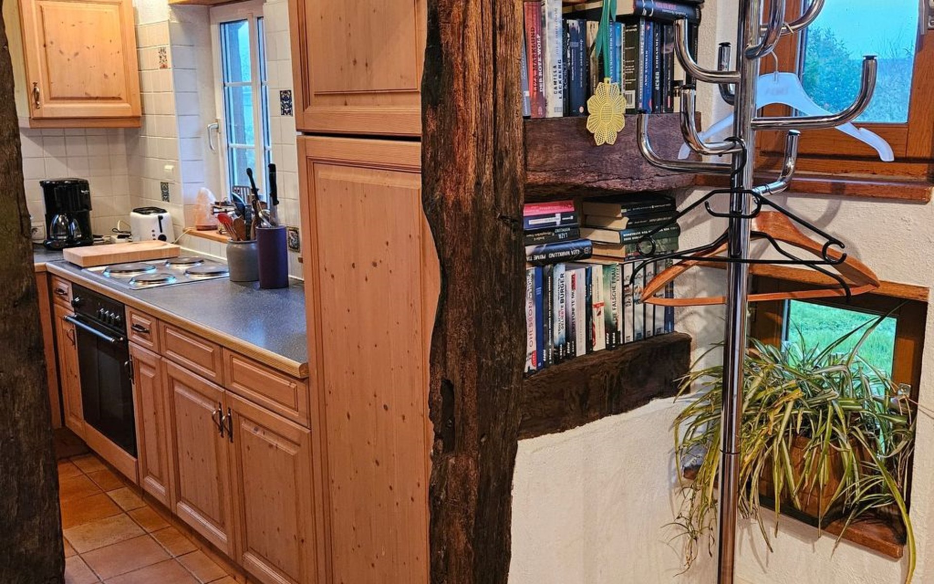 Durch die Renovierung wurde der ursprüngliche Charakter des Fachwerks mit Lehmwänden bewahrt, wobei gleichzeitig mit modernen biologischen Materialien erreicht wurde, dass die Räumlichkeiten allen Komfort bieten, den man in der heutigen Zeit benötigt. Die im Erdgeschoss gelegene Ferienwohnung ist ca. 35m² groß und verfügt über eine gut ausgestattete Wohnküche. Neben allen wichtigen Küchenutensilien finden Sie weiterhin einen vier-Plattenherd, einen Kühlschrank, einen Backofen, eine Mikrowelle und eine Kaffeemaschine vor. Ein Tisch mit einer Bank und zwei Stühlen lädt zum gemeinsamen Speisen ein. Im kleinen Bad erwartet Sie ein Waschbecken, ein WC und eine Dusche. Im separaten Schlafzimmer finden Sie ein großes Doppelbett (200cm x 200cm) und einen SAT-TV vor. Für den Hund finden Sie einen kleinen Vorraum vor der Wohnküche vor, wo er/sie auf seiner Decke schlafen kann.