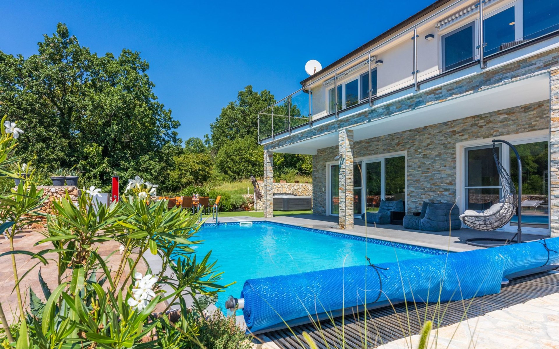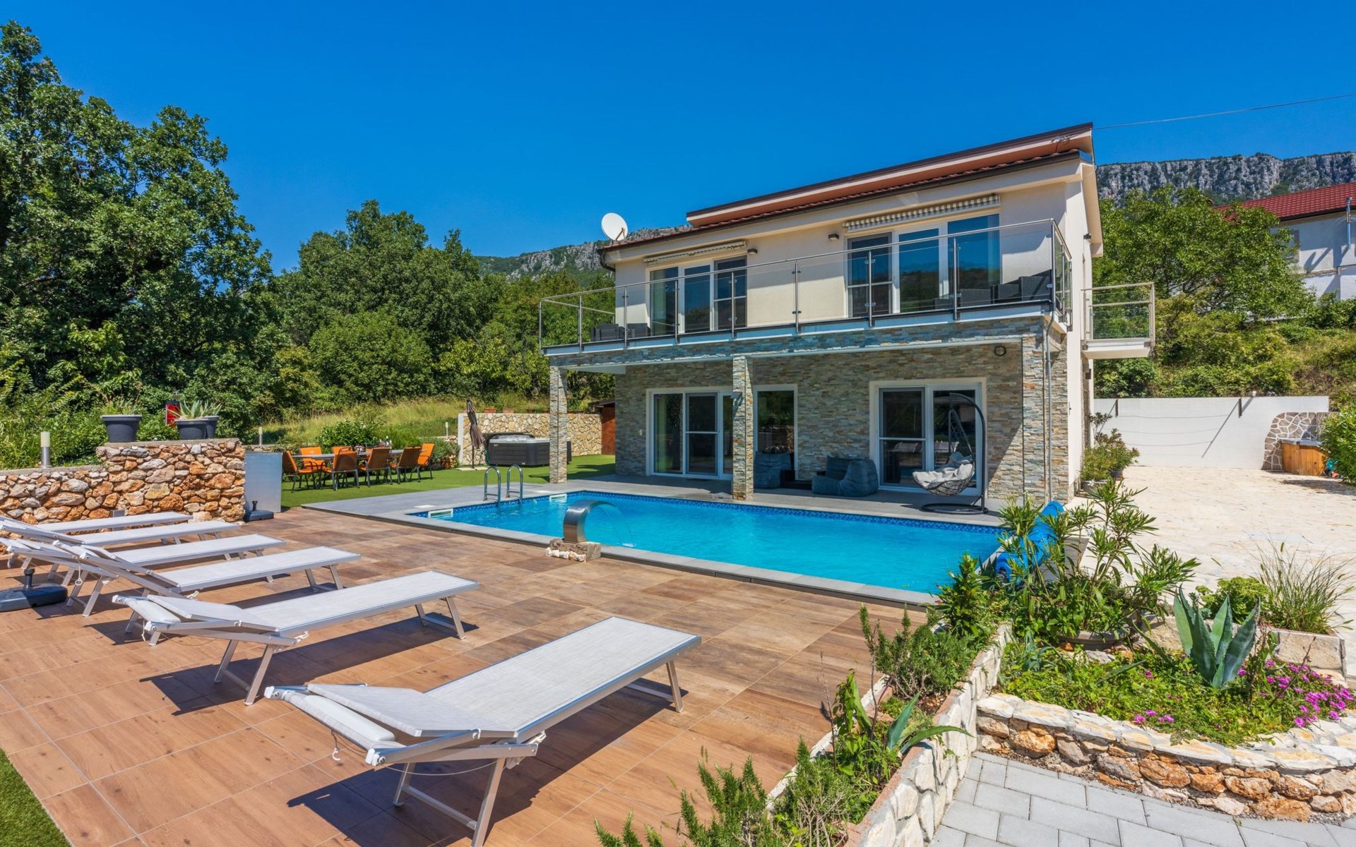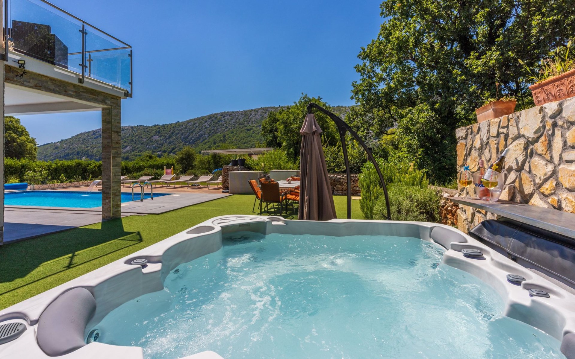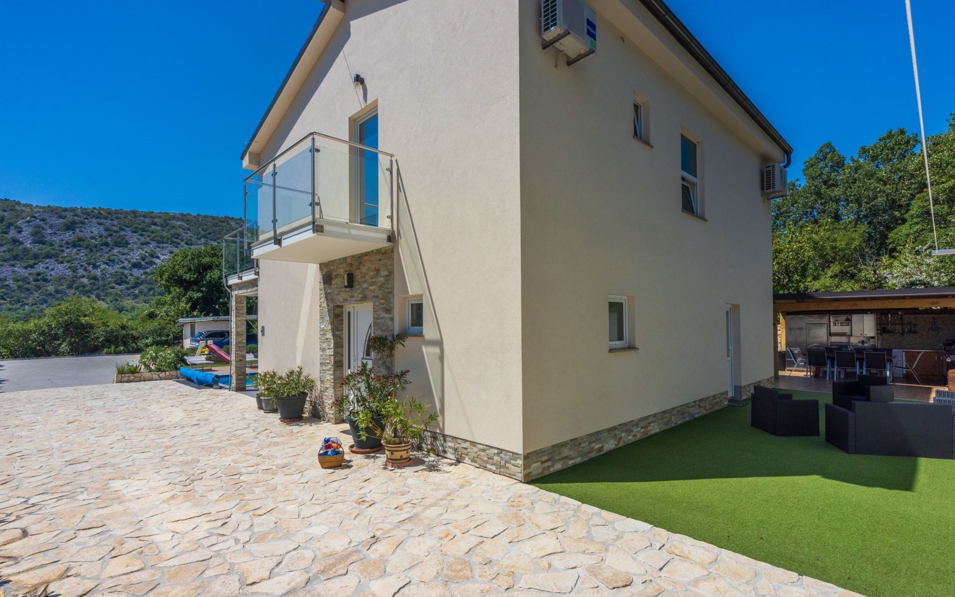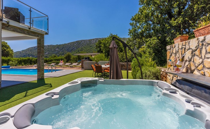 Außen: Balkon; Garten vorhanden; Gartenmöbel; Grill; Parkplatz vorhanden; Privater Pool; Privatparkplatz; Spielplatz; Terrasse; Whirlpool