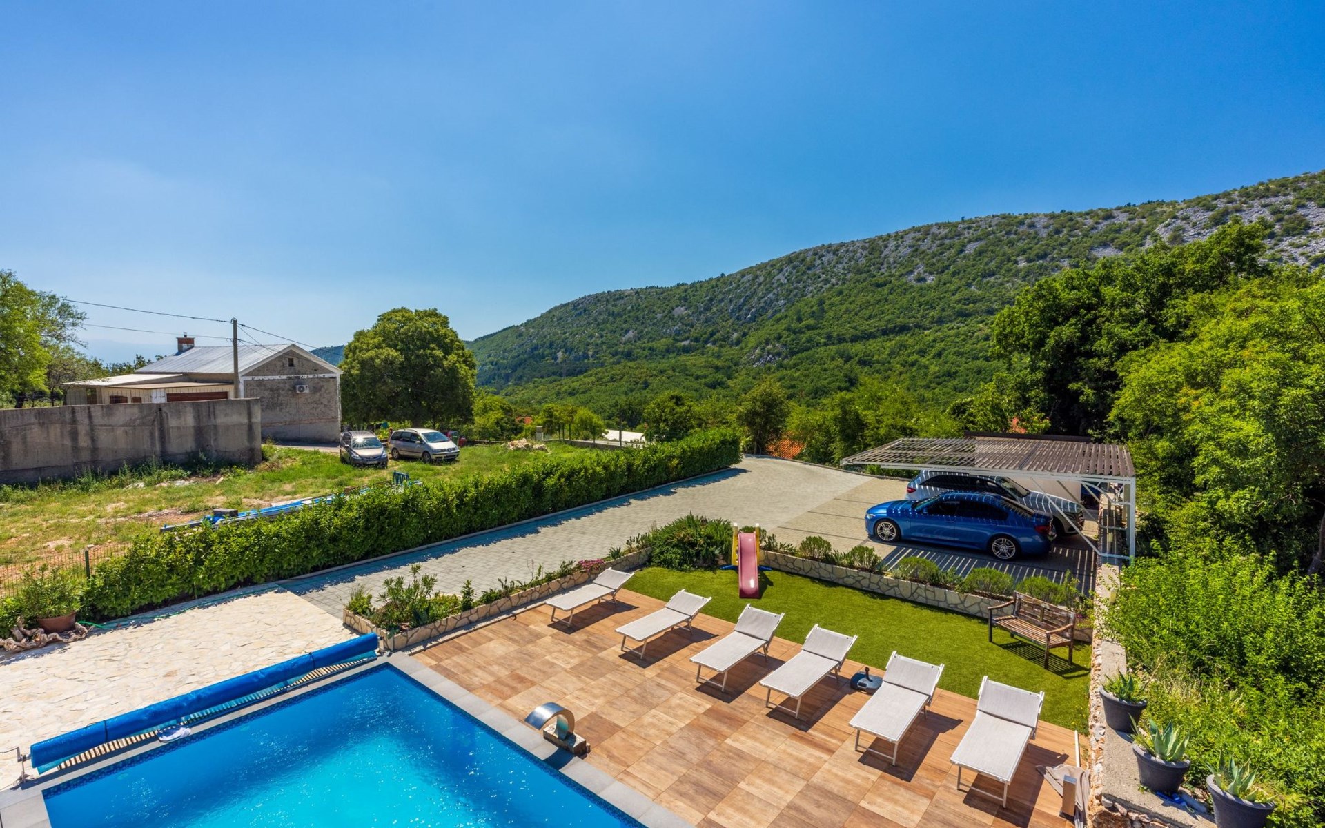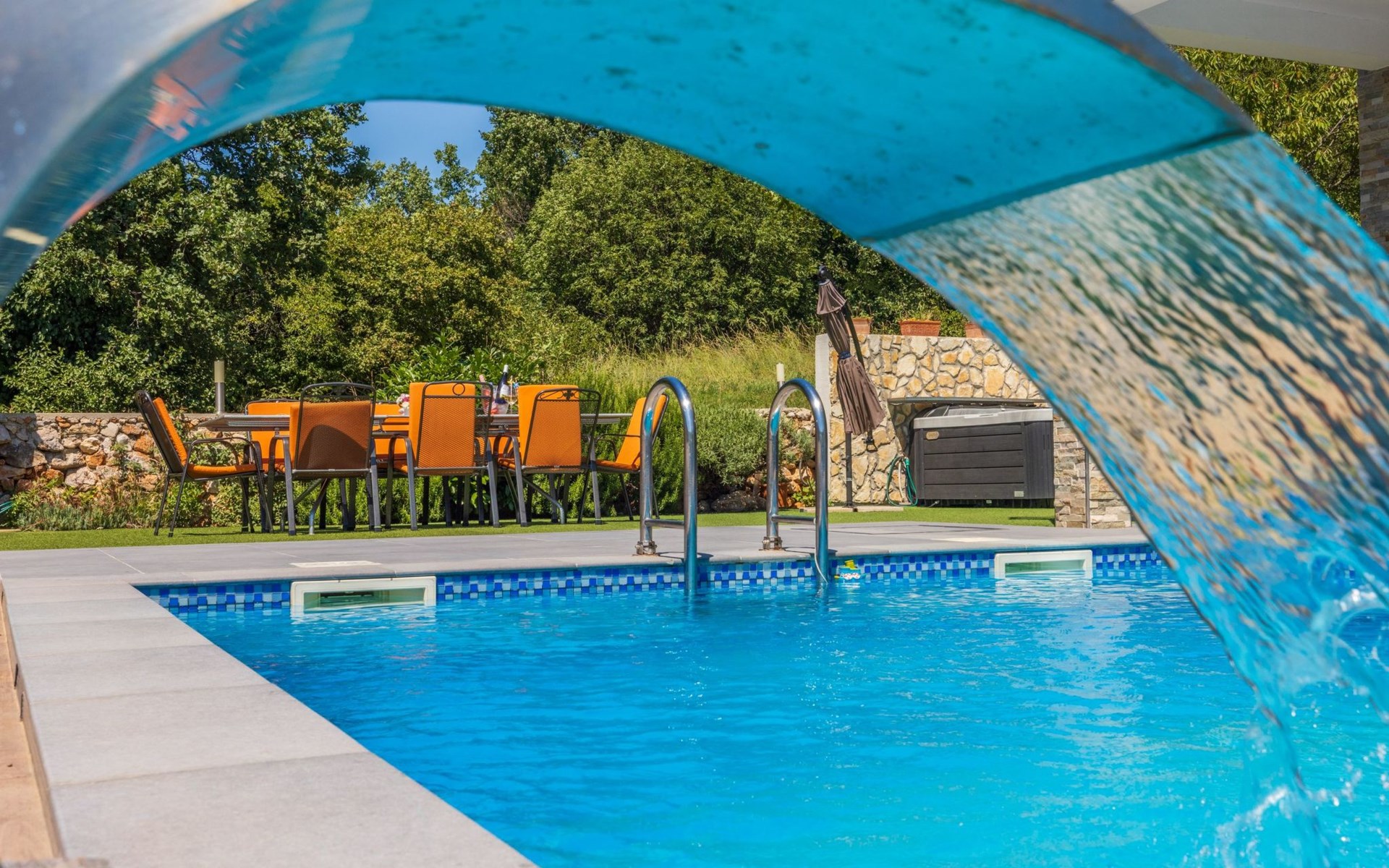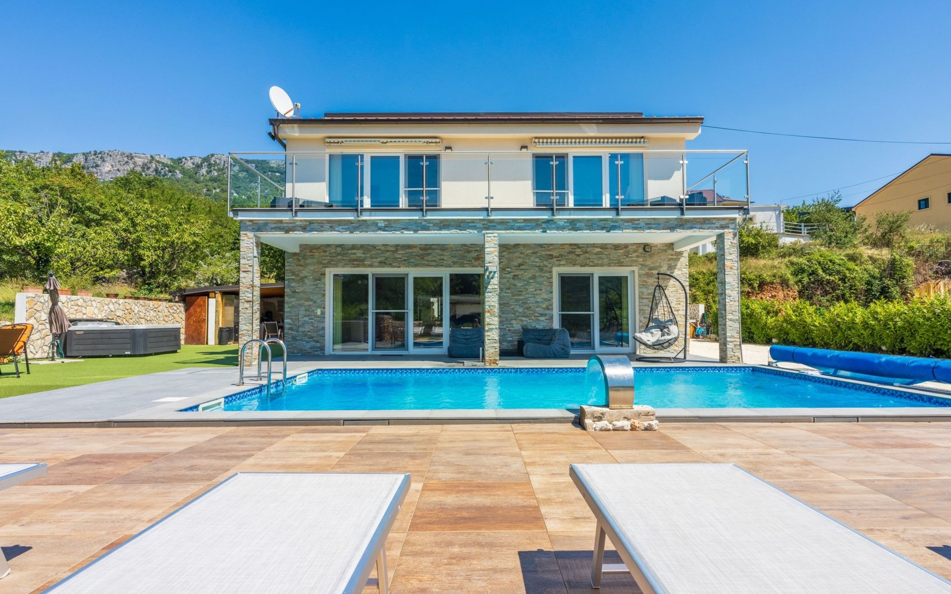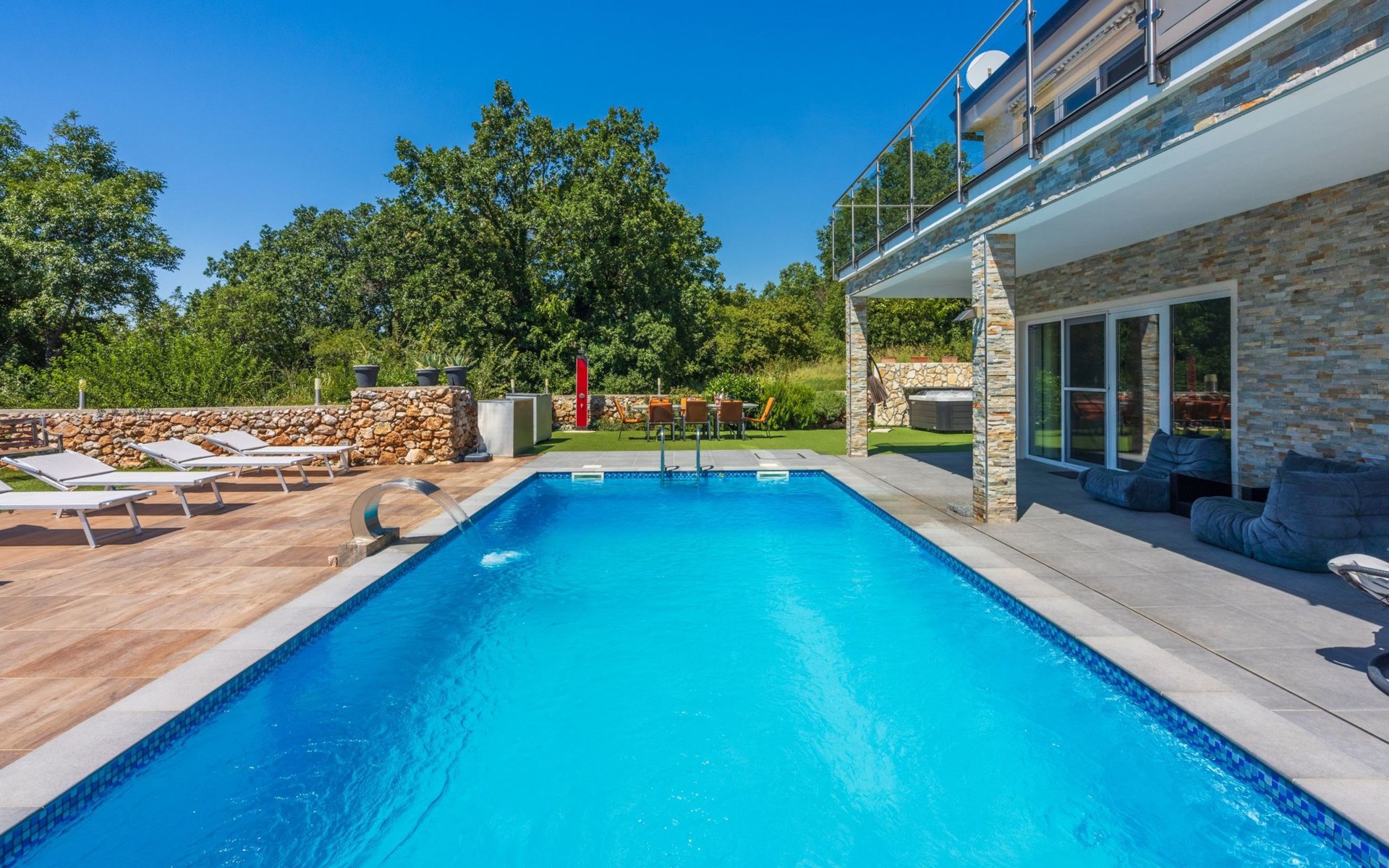 Außen: Balkon; Garten vorhanden; Gartenmöbel; Grill; Parkplatz vorhanden; Privater Pool; Privatparkplatz; Spielplatz; Terrasse; Whirlpool