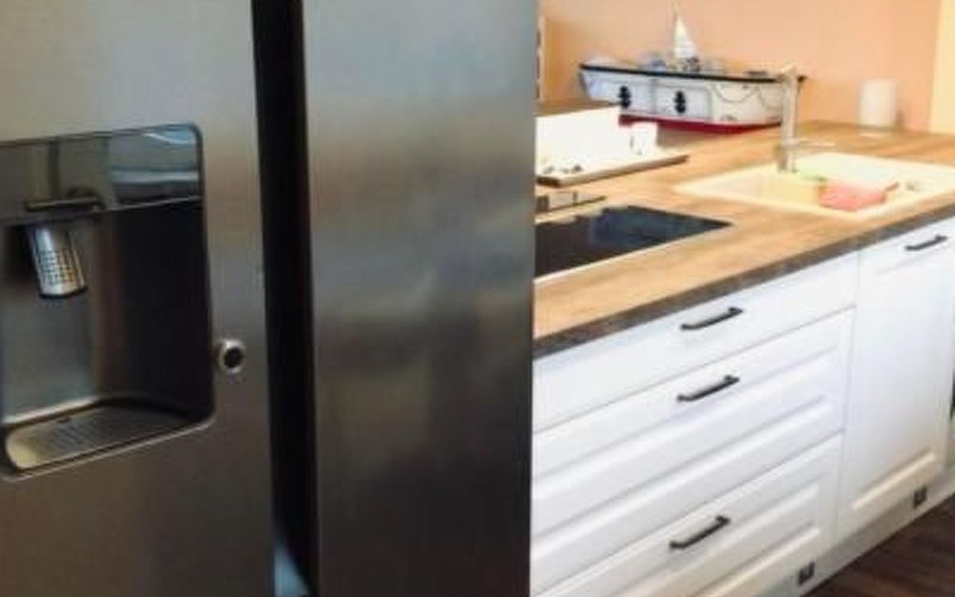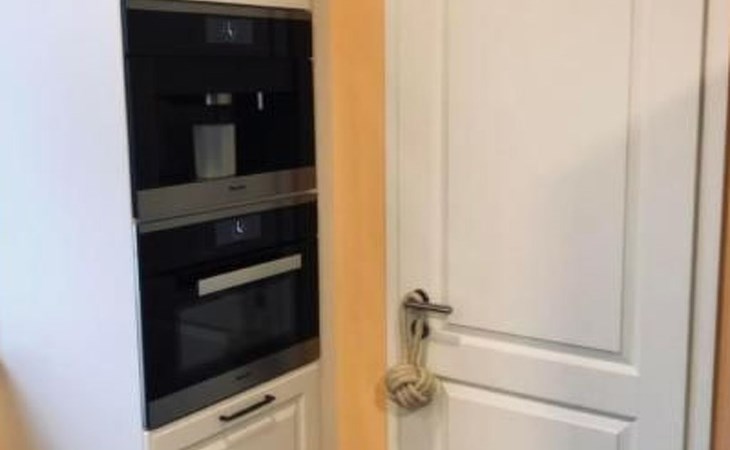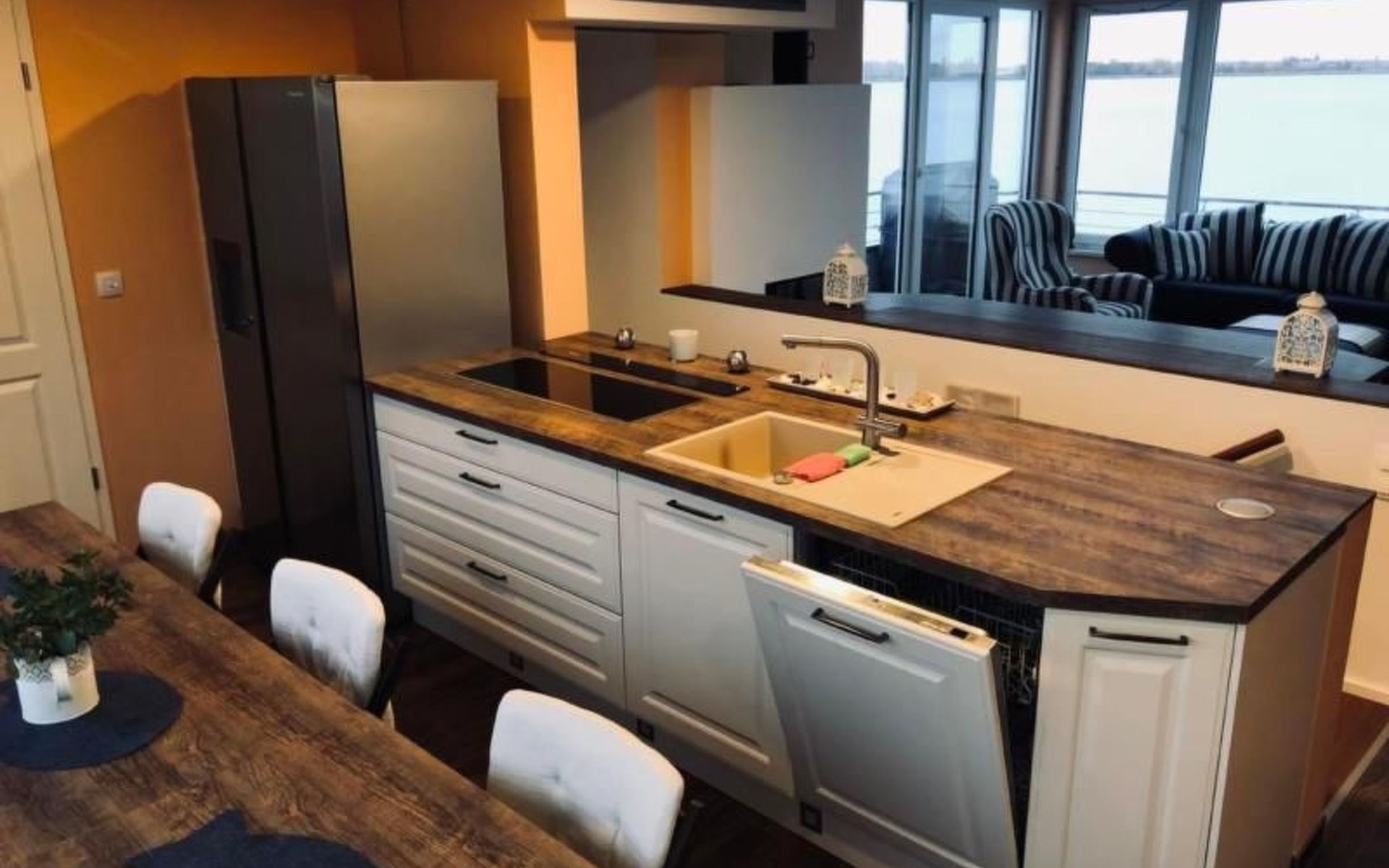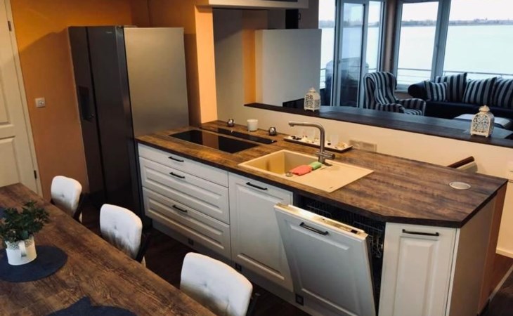 Auf der gleichen Ebene schließt sich die großzügig geschnittene Wohnküche mit reichlich Stauraum an. Im großen Doppeltüren-Kühlschrank ist ausreichend Platz für Proviant. Zudem verfügt er über einen integrierten Eiswürfel, Crusheis & Wasserspender. Induktionsherd, Mikrowellenofen, Spülmaschine und Kaffemaschine sind selbstverständlich vorhanden. Der große 3-teilige Esstisch bietet reichlich Platz und lässt sich nach belieben auch auseinander stellen.