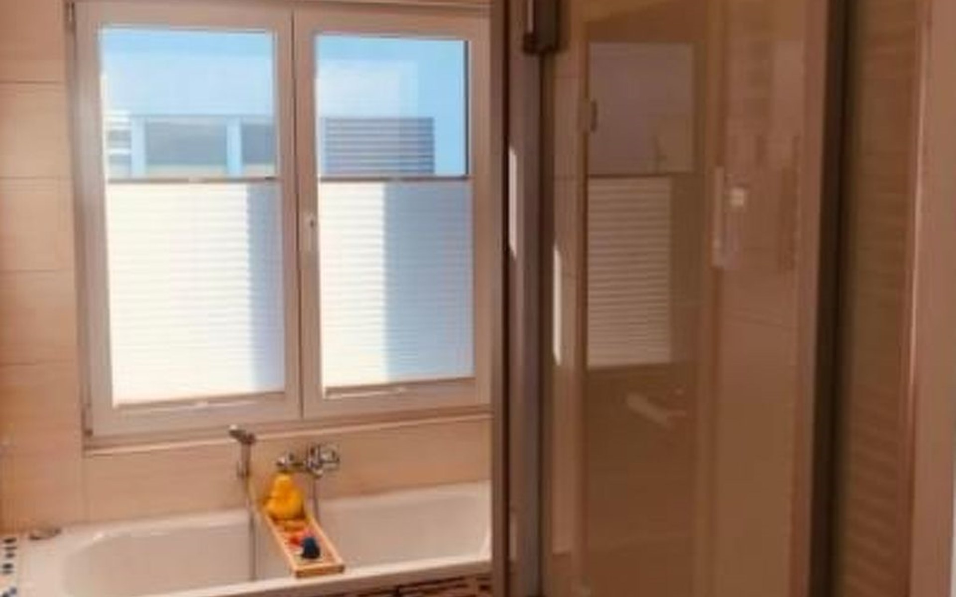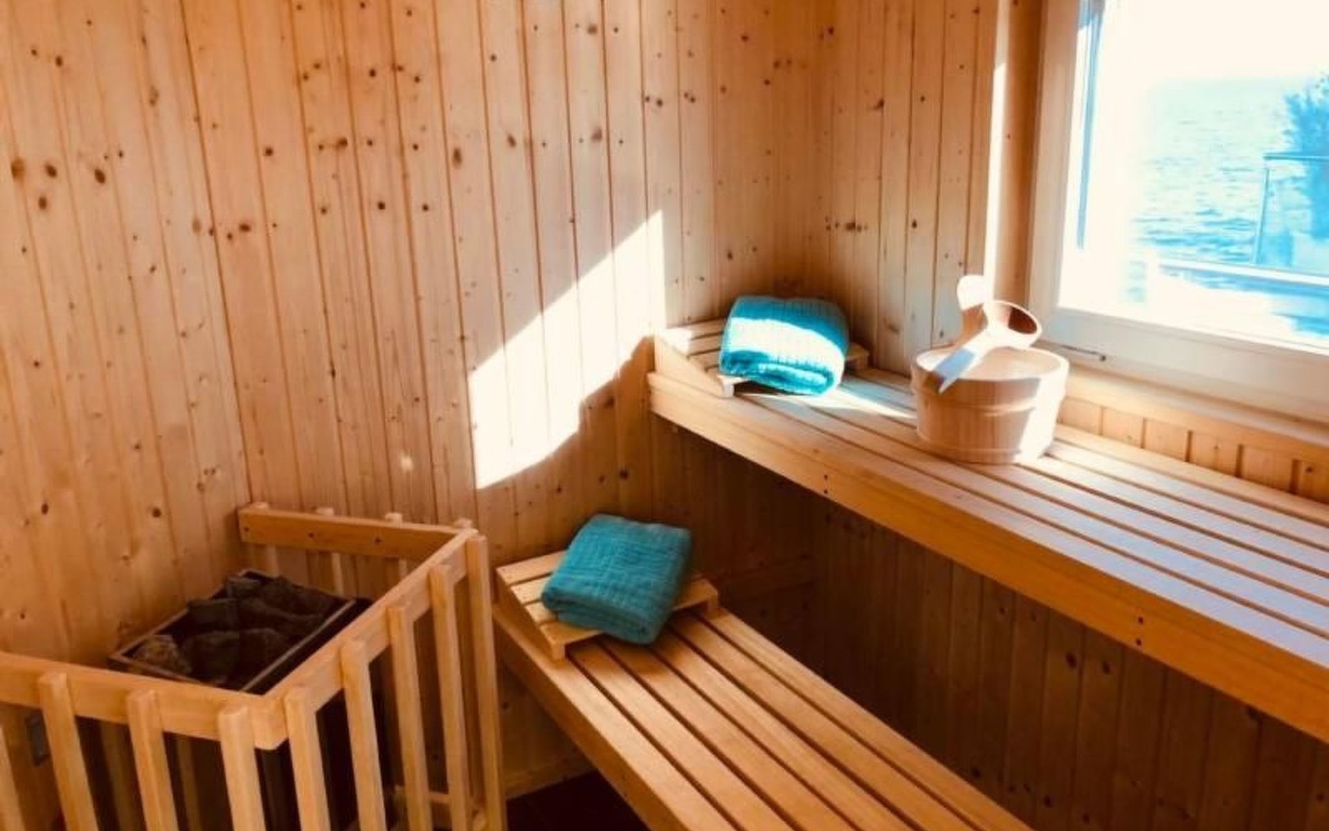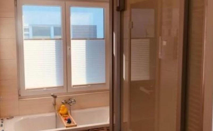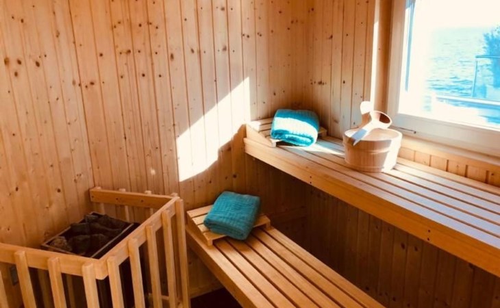 Das große, modern geflieste Bad mit XL- Duschkabine, Wanne mit Blick auf den See, Waschtisch und separater WC-Kabine bietet jeden erdenklichen Komfort. Die Finnische Sauna hat ein nach außen verspiegeltes Fenster mit herrlichem Blick auf das Wasser.