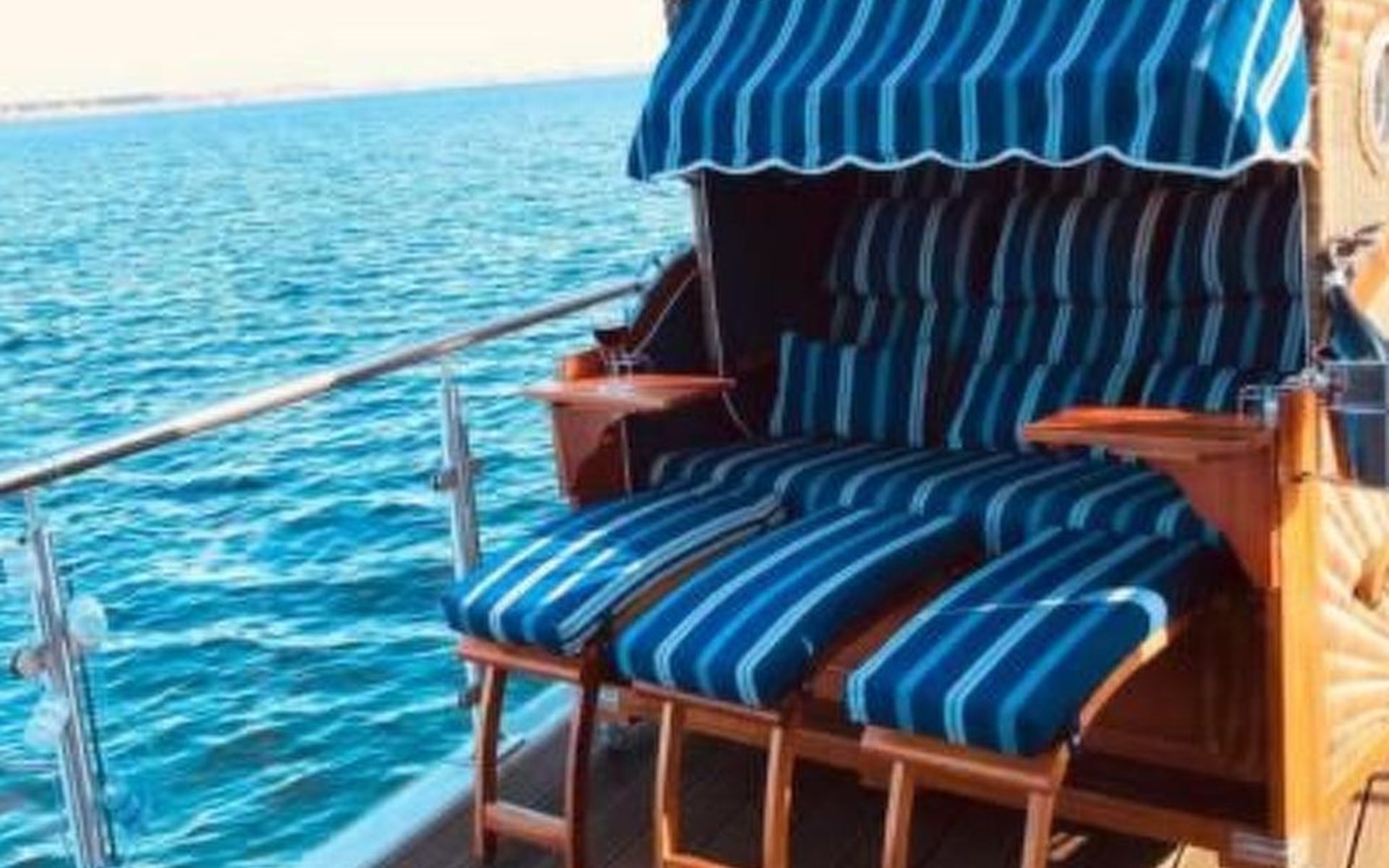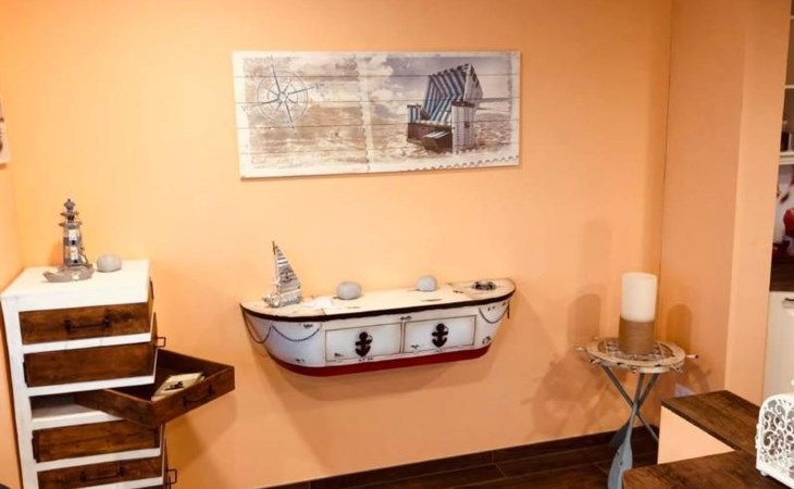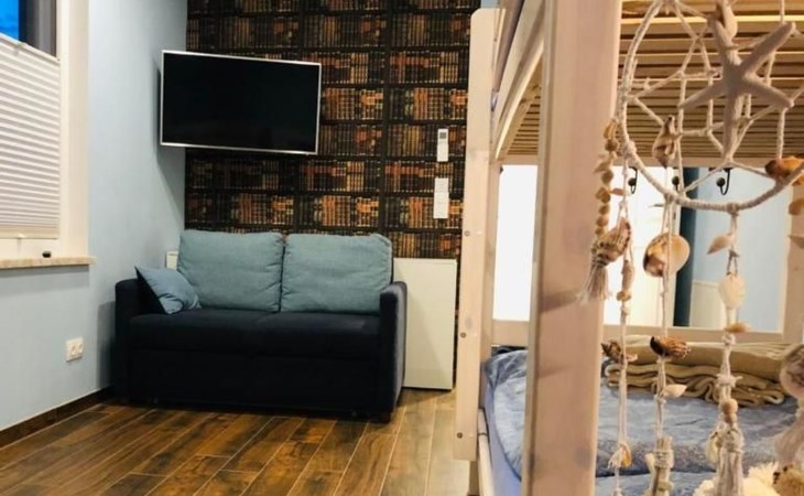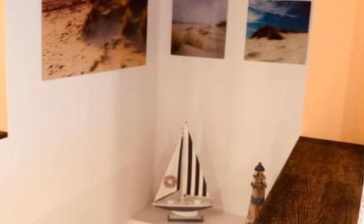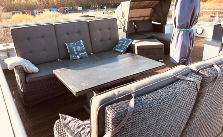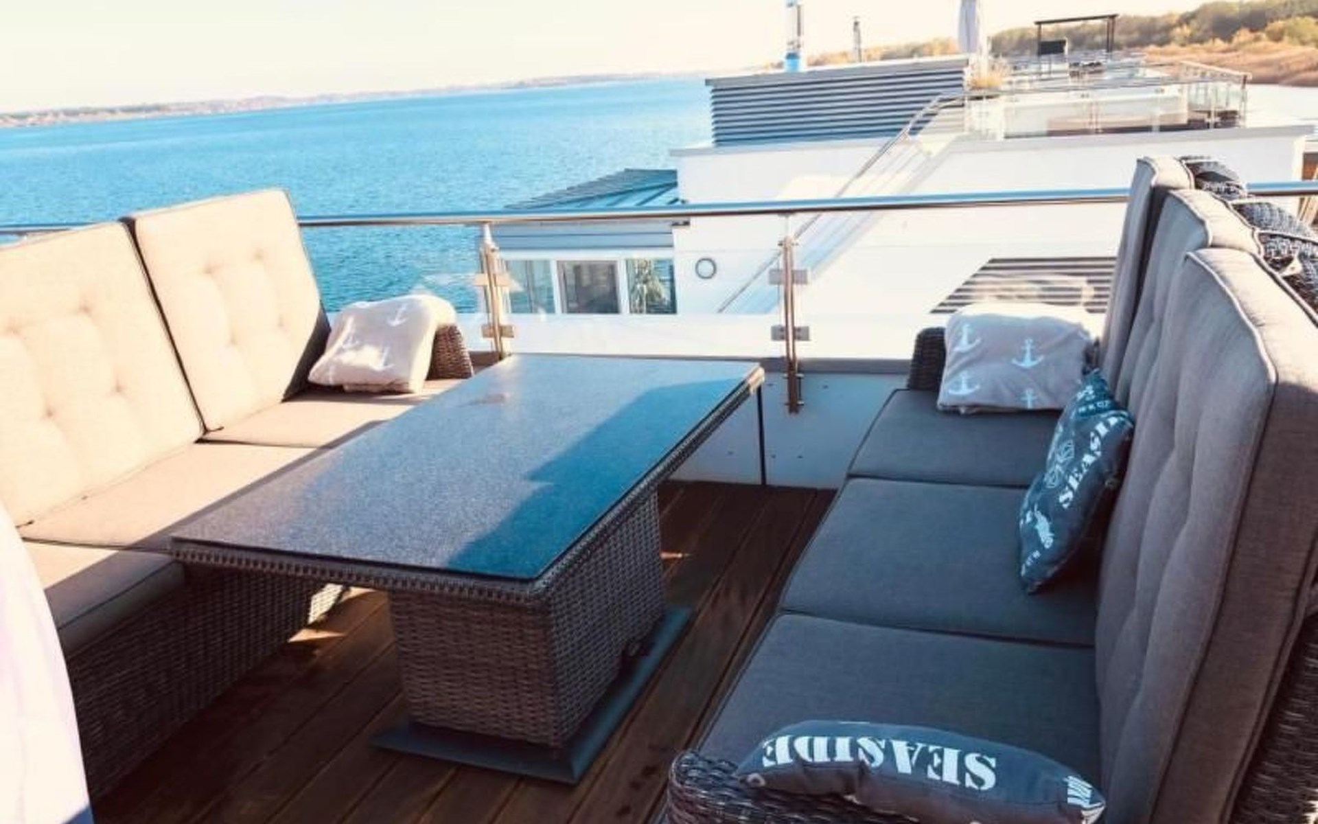 Das geräumige Wohnzimmer in der ersten Etage, bietet den vollen 180 Grad Panoramablick auf den Goitzschesee. Stilvolle moderne Sofas & Möbel im maritimen Kapitänsflair, bieten komfortablen Raum für 6 Personen. Der Eck-Kamin bringt gerade in den kühlen Jahreszeiten das wohlige Gefühl der Ruhe und Entspannung. Natürlich gibt es auch einen großen Flatscreen TV, welcher raffiniert in einem Schrank versteckt ist und per Fernbedienung herausgefahren wird. Das ganze Haus hat W-LAN Versorgung und jeder Raum eine LAN Steckdose für kostenfreies Internet. Über die Außentreppe gelangt man auf das Sonnendeck auf dem Dach.