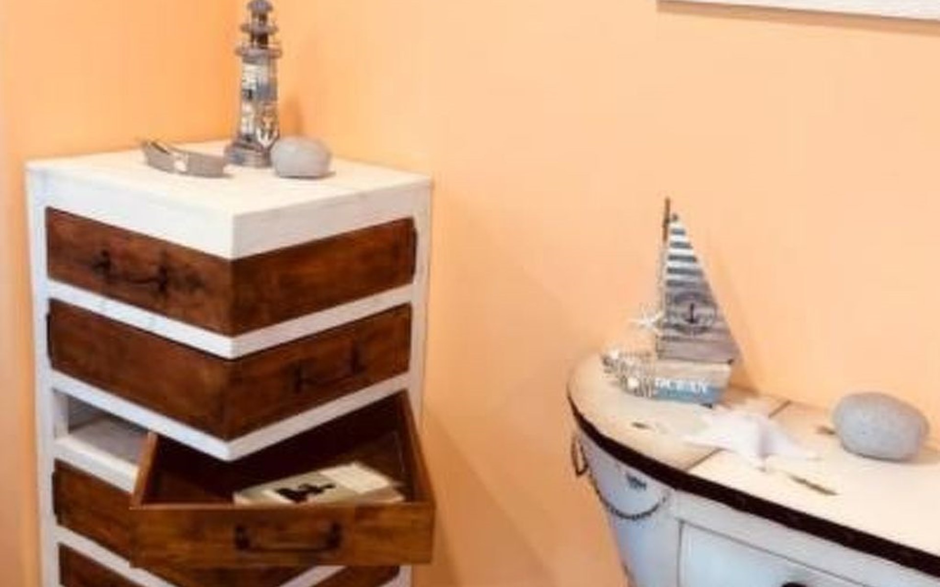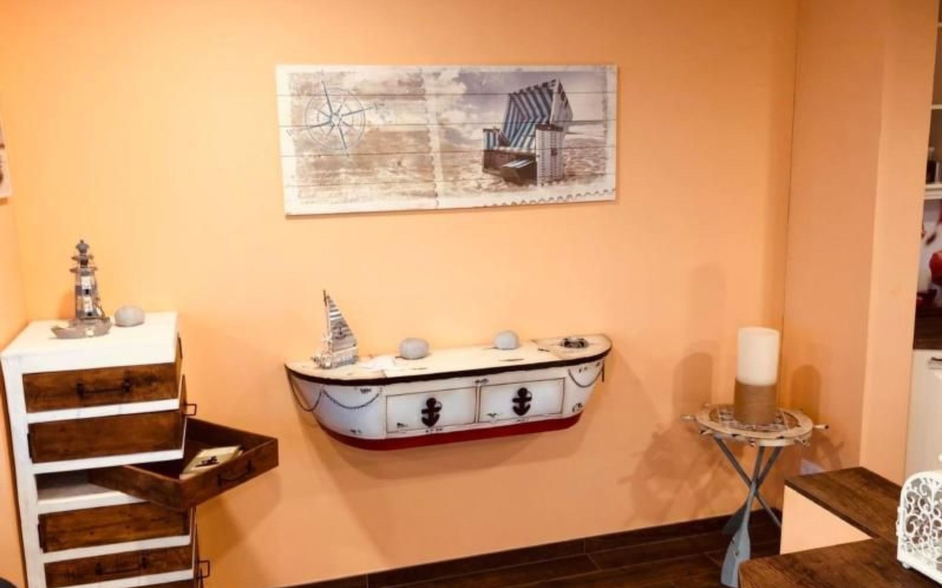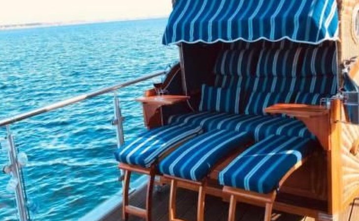 Das geräumige Wohnzimmer in der ersten Etage, bietet den vollen 180 Grad Panoramablick auf den Goitzschesee. Stilvolle moderne Sofas & Möbel im maritimen Kapitänsflair, bieten komfortablen Raum für 6 Personen. Der Eck-Kamin bringt gerade in den kühlen Jahreszeiten das wohlige Gefühl der Ruhe und Entspannung. Natürlich gibt es auch einen großen Flatscreen TV, welcher raffiniert in einem Schrank versteckt ist und per Fernbedienung herausgefahren wird. Das ganze Haus hat W-LAN Versorgung und jeder Raum eine LAN Steckdose für kostenfreies Internet. Über die Außentreppe gelangt man auf das Sonnendeck auf dem Dach.