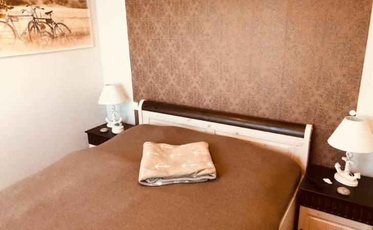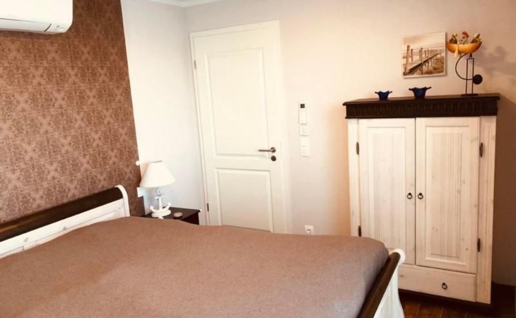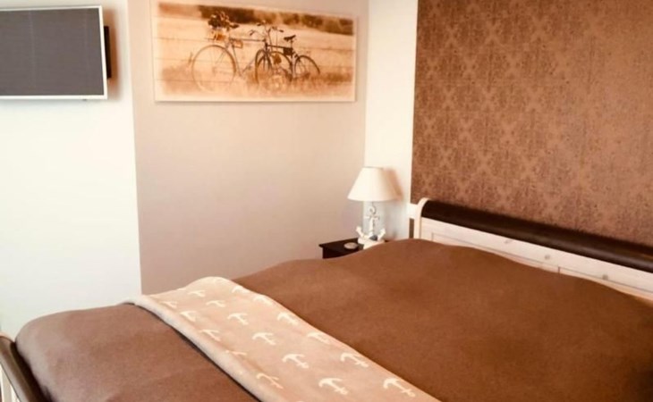 Die 2 Schlafräume sowie das große Bad erwarten Sie im Erdgeschoß. Das Elternschlafzimmer mit Doppelbett und ausreichend Möbeln zum Verstauen hat einen sensationellen Panoramablick auf den See und den direkten Zugang zur umlaufenden Terrasse, dem XXL-Strandkorb und zum Wasser. Auch hier gibt es einen TV und freies W-LAN.