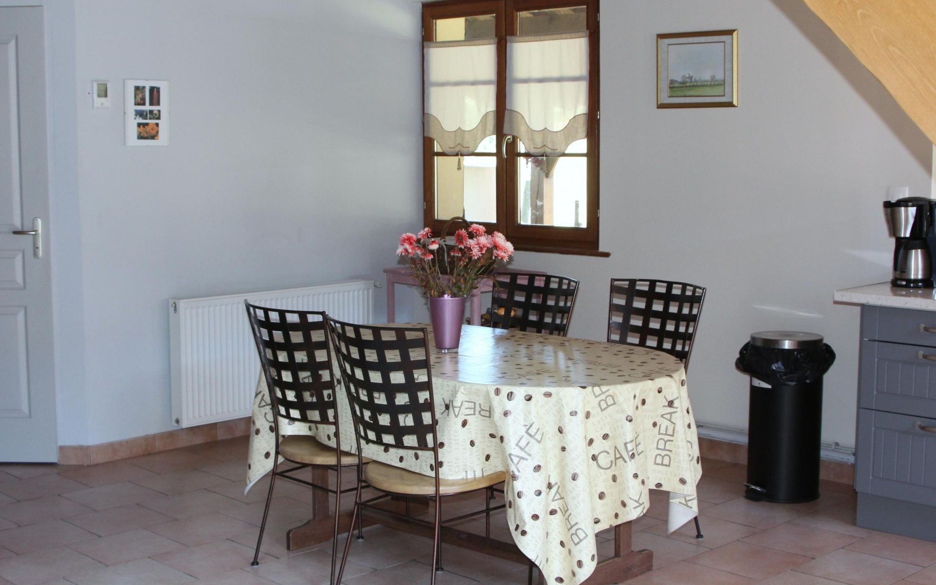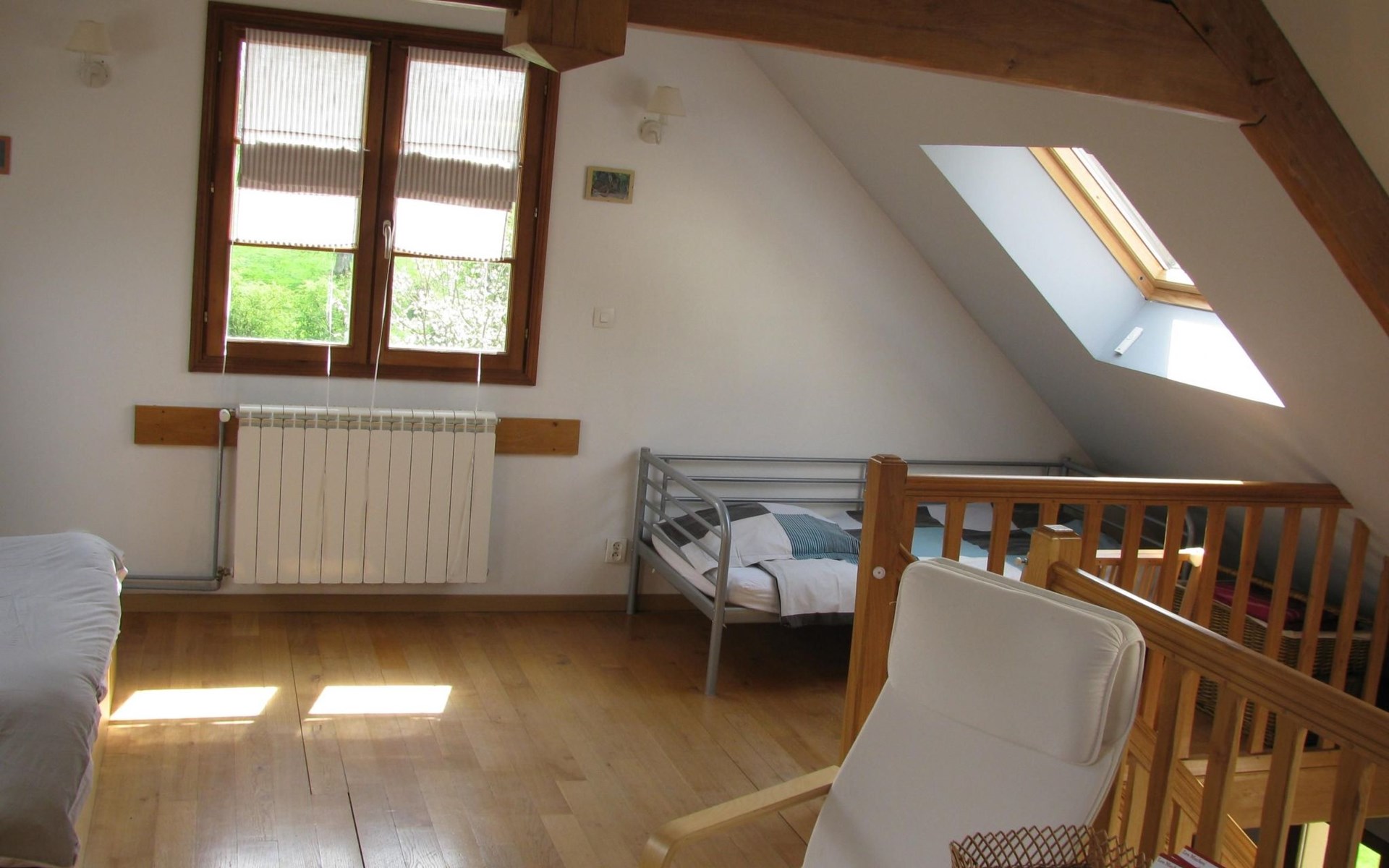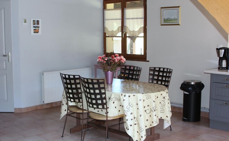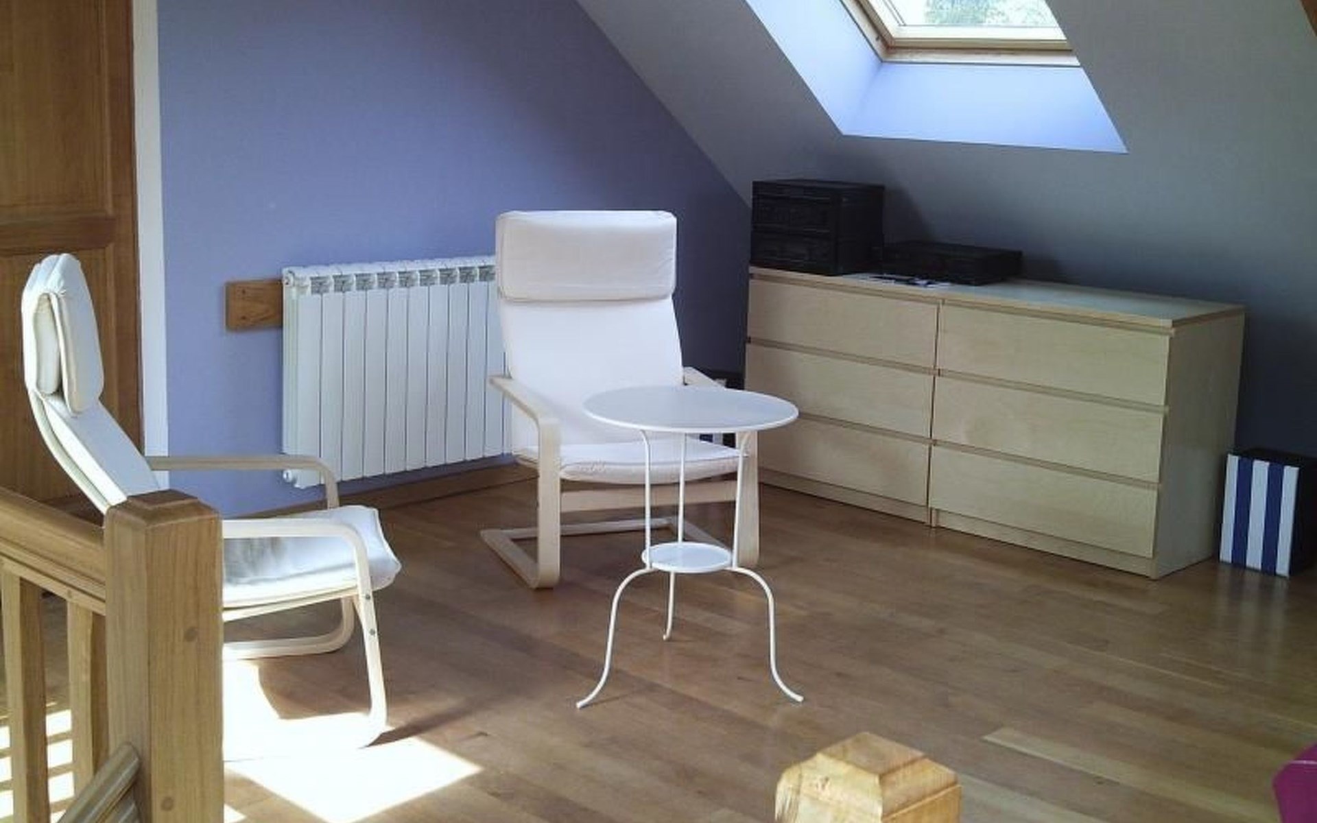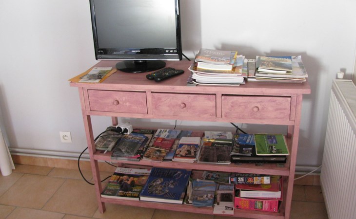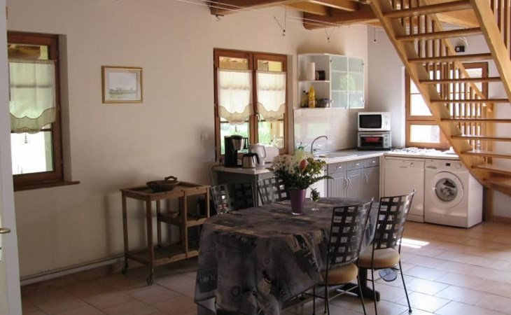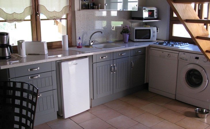Offene Küche mit Kühlschrank, Gasherd, Geschirrspüler und Waschmaschine, Mini-Backofen, Mikrowelle, Toaster, Kaffeemaschine, Wohn-/Esszimmer, Schlafsofa (140/190), Fernseher (europäische DVB-T-Kanäle), DVD-Player, Holzfeuer, Badezimmer mit WC. Im Obergeschoss (von 35 m²) ein Zimmer im Zwischengeschoss mit einem Bett (140/200) und einem Bett (90/200), Wifi-Zugang auf Anfrage.
