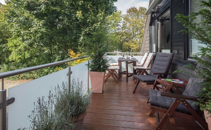 Der Außenbereich besticht durch einen großzügigen Balkon, der Platz für bis zu 6 Personen bietet. Ausgestattet mit einer elektrischen Markise und einem dreiflammigen Gasgrill, lädt dieser Bereich zum Entspannen und gemeinsamen Genießen im Freien ein.