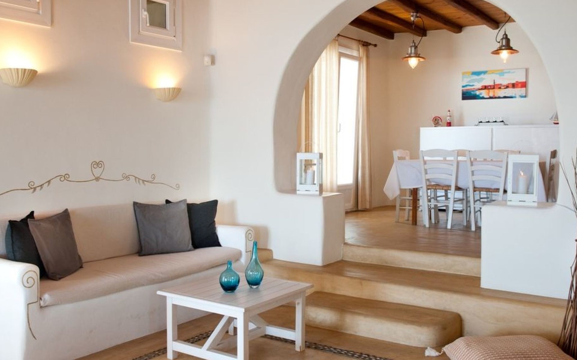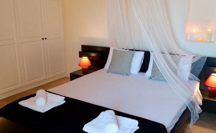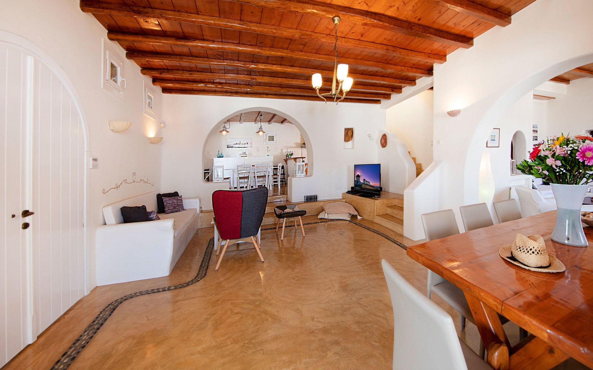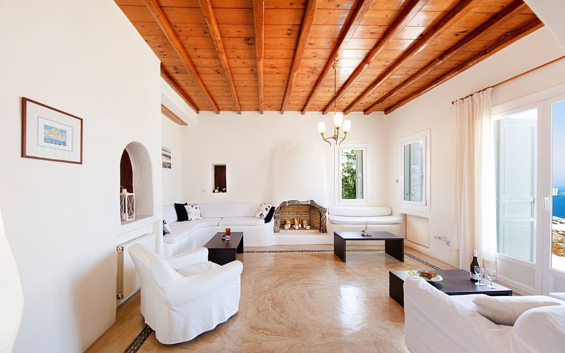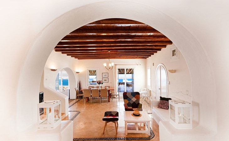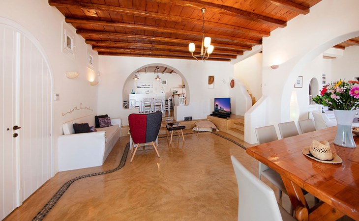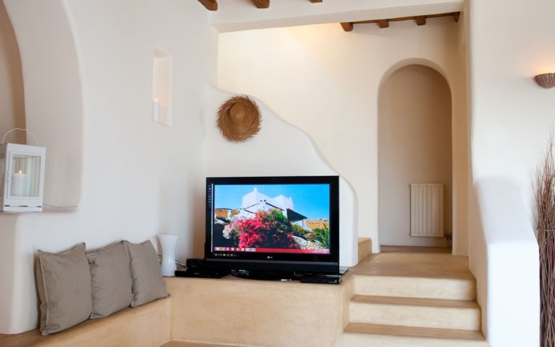 Der Stil dieser Villa ist exquisit: die glattkantige Architektur verleiht dem Äußeren des Gebäudes ein reines Aussehen, während das Innere nüchtern und mit Flair verschönert ist. Das Innere des Hauses ist komplett eingerichtet und besteht aus drei Ebenen. Auf der mittleren Ebene befinden sich ein sehr komfortables Wohnzimmer und eine große Küche mit offenem, informellem Esszimmer, sehr funktionell und schön gestaltet. Dort befindet sich auch das Hauptschlafzimmer mit seinem Badezimmer. Auf der oberen Ebene befinden sich drei Schlafzimmer (zwei Schlafzimmer mit Doppelbett und ein Schlafzimmer mit zwei Einzelbetten), die hell und geräumig sind und einen spektakulären Blick auf das Meer haben. Die untere Ebene der Villa hat einen separaten Eingang und umfasst ein Schlafzimmer mit einem Stein-Doppelbett, ein Schlafzimmer mit einem halben Doppelbett, ein Wohnzimmer mit einem Stein-Einzel-Bett, eine kleine Küche und ein Badezimmer.