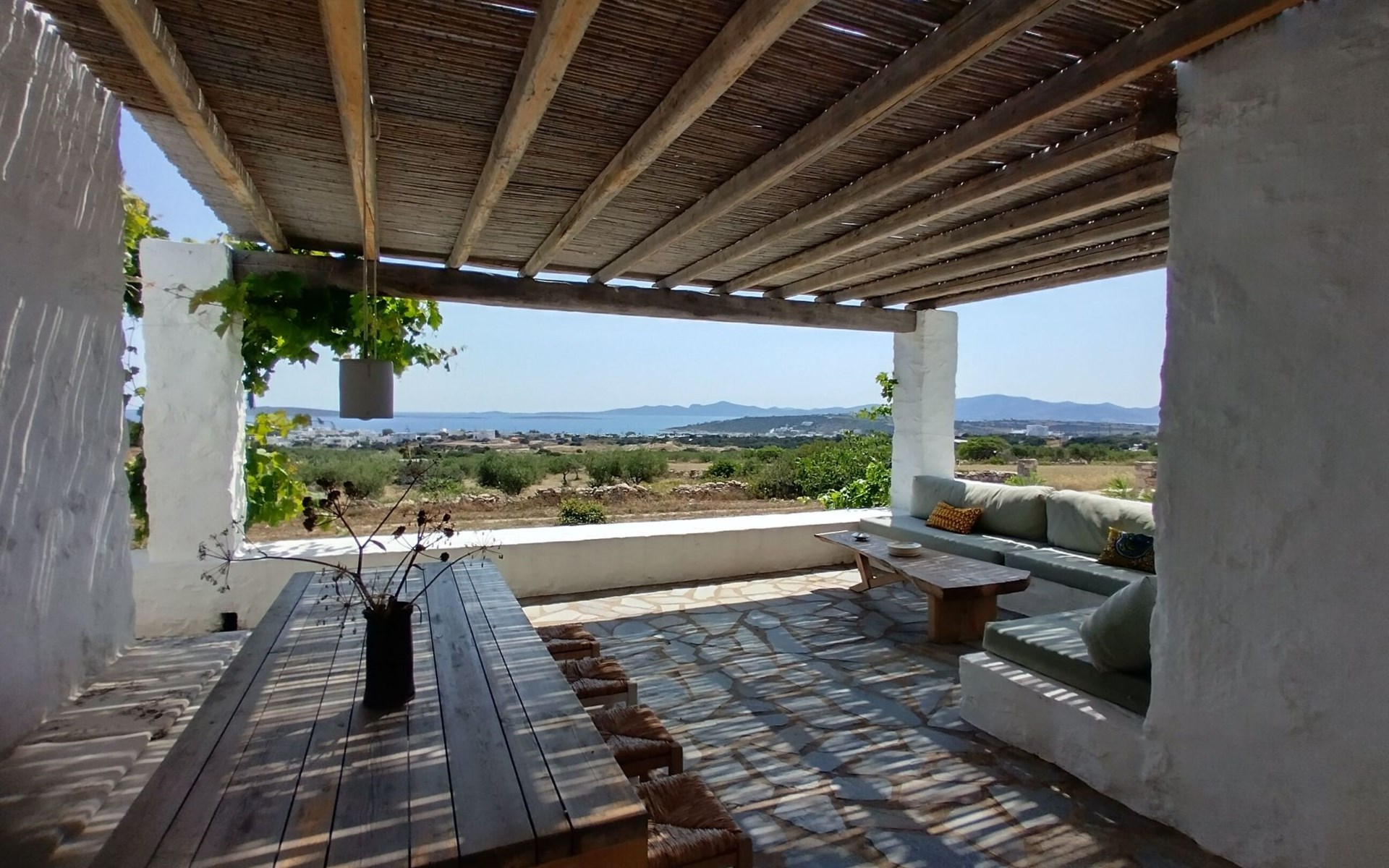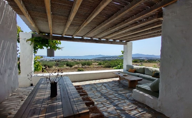 Im Inneren der Villa Stamata wird die Schönheit der lokalen Handwerkskunst durch die Verwendung von parischem Stein, Marmor, Holz und handgefertigten Einrichtungsgegenständen zelebriert, die zusammen eine warme und einladende Atmosphäre schaffen. Die Innenräume wurden sorgfältig renoviert, um den höchsten Ansprüchen an Komfort und Stil gerecht zu werden und eine perfekte Umgebung für Entspannung und Erholung zu schaffen. Die Villa erstreckt sich über zwei Etagen mit vier Schlafzimmern - jedes mit eigenem Bad -, einem harmonisch gestalteten Wohn- und Küchenbereich, der traditionelle Ästhetik und modernen Luxus nahtlos miteinander verbindet, und einer Terrasse, die als Erweiterung des Innenraums fungiert und unter einer mit Weinreben behangenen Pergola reichlich Möglichkeiten zum Essen und Entspannen im Freien bietet.