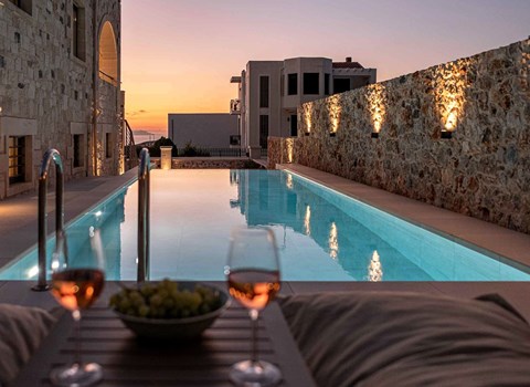 Der eigenwillige, organisch geformte Pool liegt etwas zurückgesetzt vom Haus und ist durch eine Trockenmauer, Olivenbäume und Zypressen geschützt. Ein perfekter Ort zum Entspannen und Sonnenbaden, und wenn es zu heiß wird, spendet eine Holzpergola Schatten. Ein in den Fels gehauener, versenkter Tisch und Sitzbereich am Pool ist der perfekte Ort für Erfrischungen.
