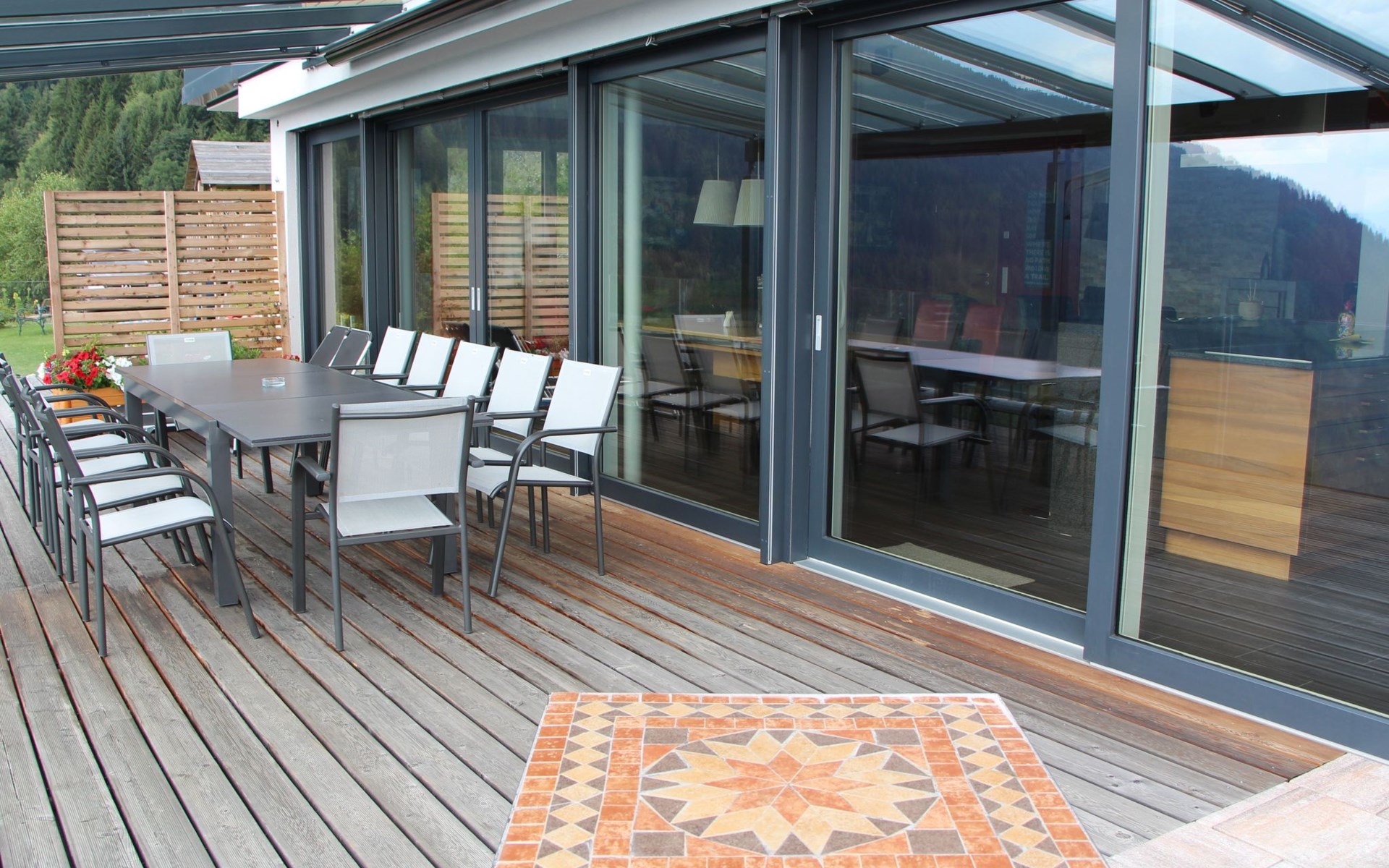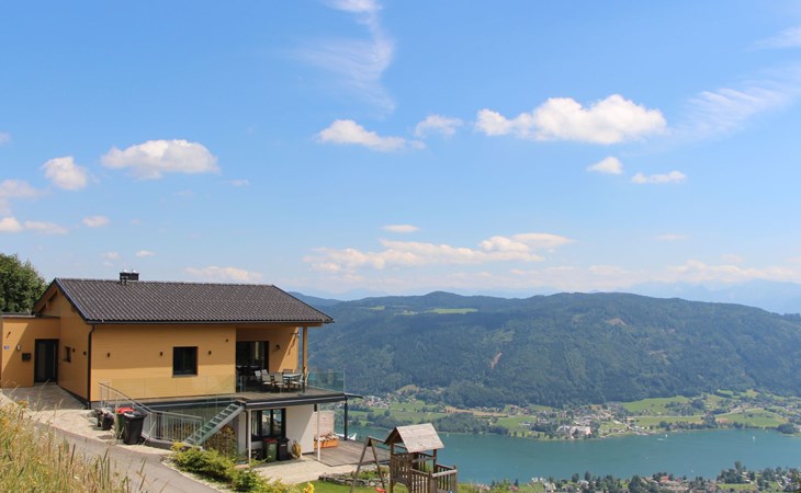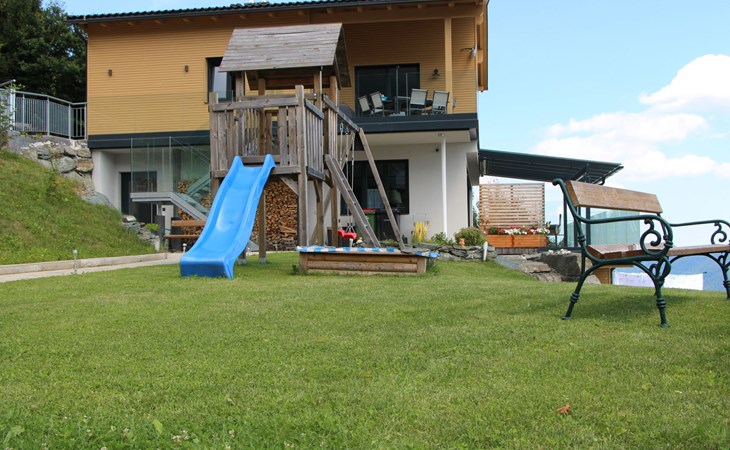 Der großzügige Garten ist mit Gartenmöbeln und Spielgeräten ausgestattet und steht Ihnen zur exklusiven Nutzung zur Verfügung. Hier können Sie entspannen, sich erholen und ein Buch lesen oder gemütliche Abende mit Freunden oder mit der Familie verbringen. Von dem Wohnraum des Appartements, das sich im Erdgeschoss befindet, gelangt man auf die 100 m²große Terrasse, die in Südrichtung gelegen ist. Diese ist mit einem Tisch und 12 Stühlen sowie mit einem Grill ausgestattet und bietet Ihnen einen atemberaubenden Blick auf die Berge und auf den Ossiachersee. Das Appartement auf der ersten Etage verfügt über zwei Balkone. Einer der Balkone ist ebenfalls mit einem Grill, einem Esstisch und Stühlen ausgestattet. Durch die Lage der Ferienunterkunft erleben Sie einen herrlichen Panoramablick, den Sie tagsüber mit einem Tee oder abends bei einem gemütlichen Abendessen genießen können. Ob im Frühling, Sommer, Herbst oder Winter – zu jeder Jahreszeit hat diese Aussicht in die Natur einen ganz besonderen Charme. Es stehen Ihnen fünf Parkplätze zur Verfügung.
