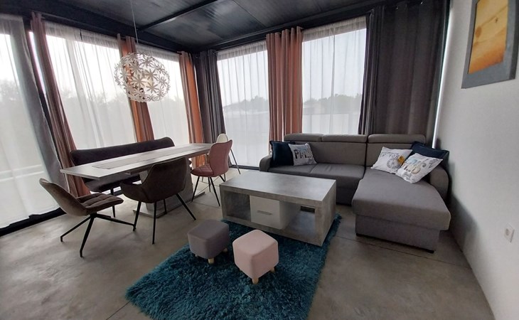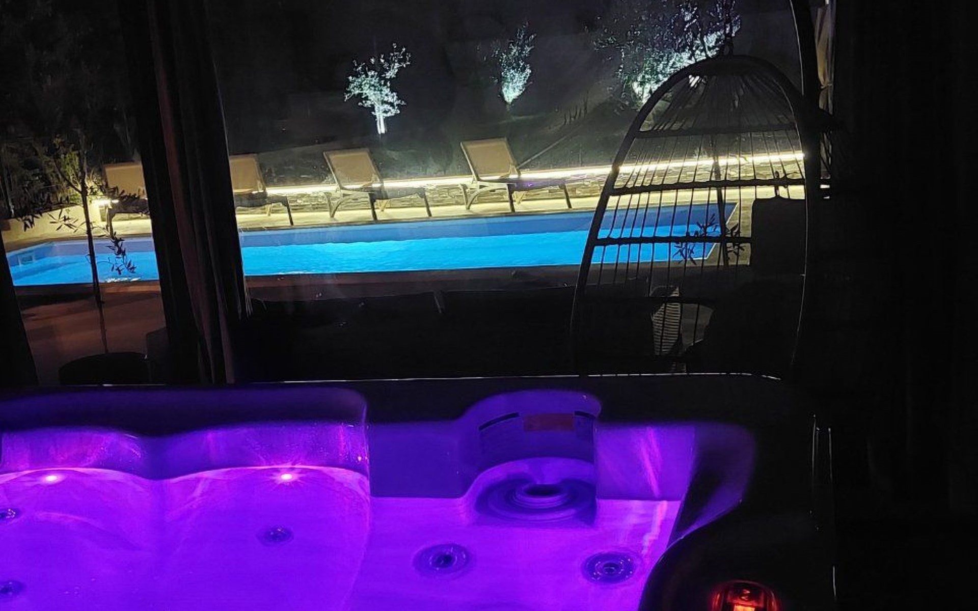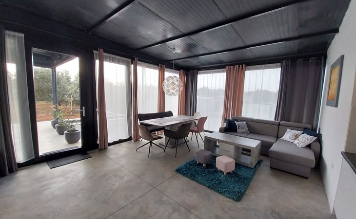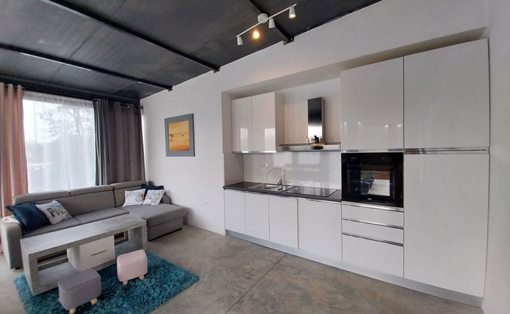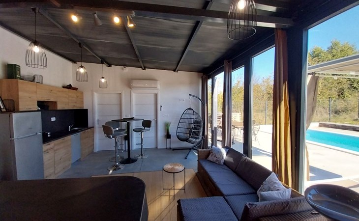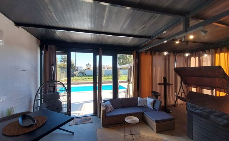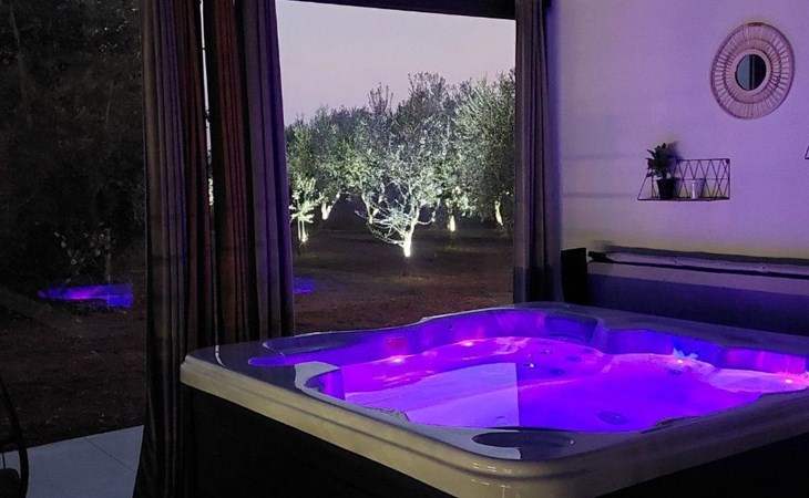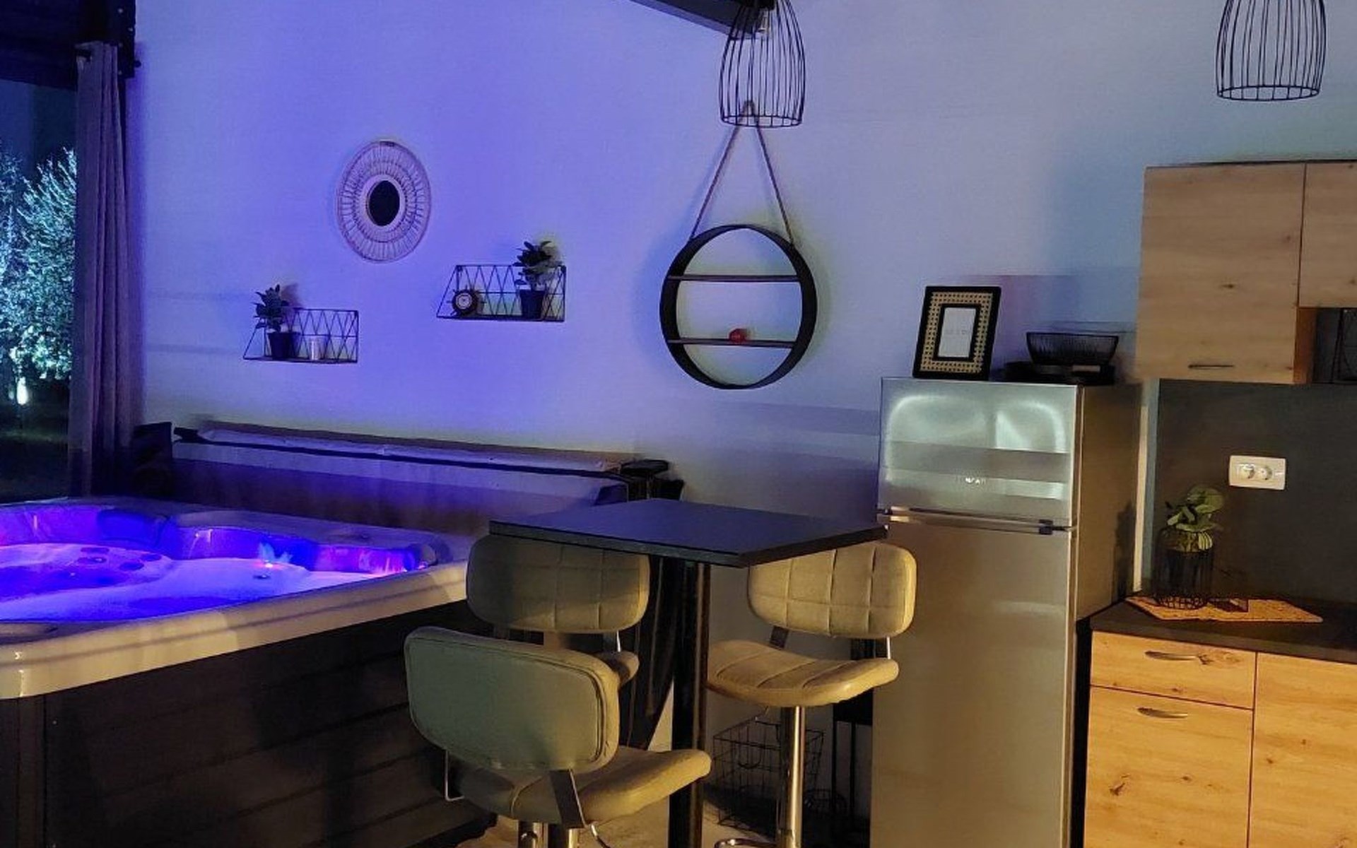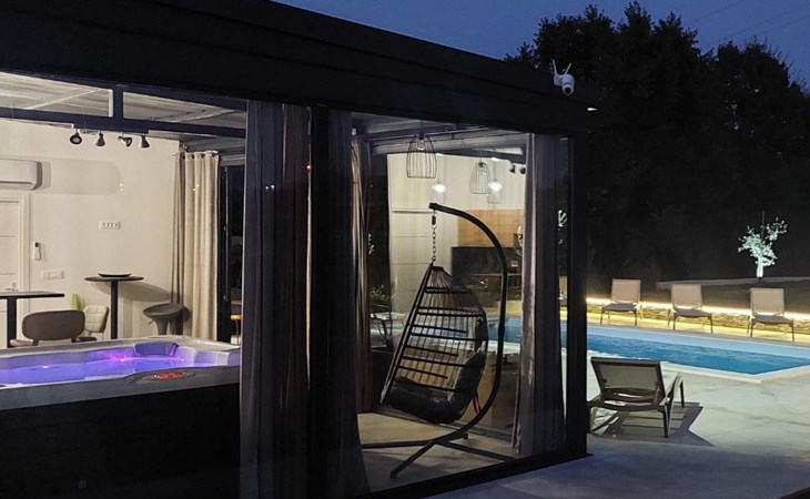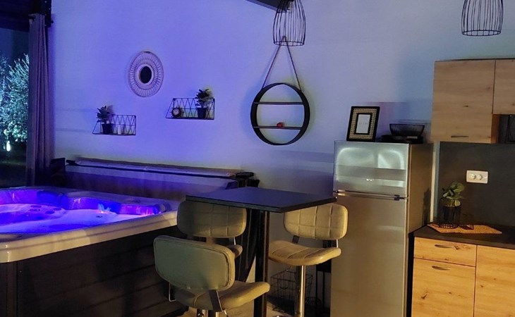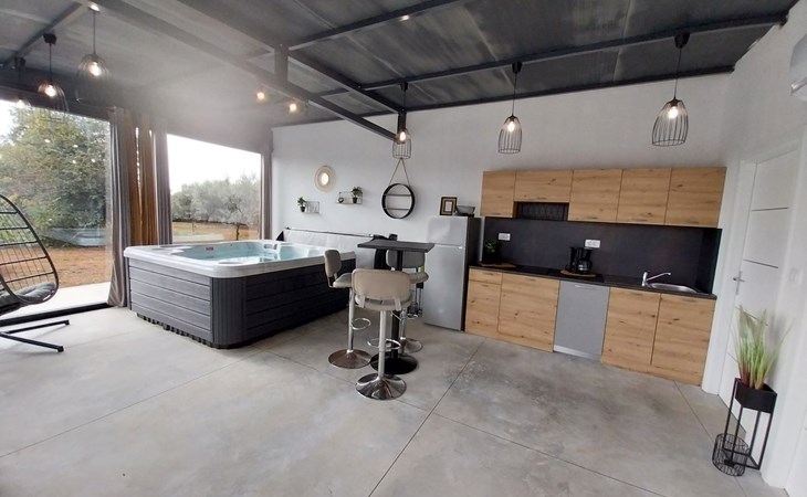 Die zweite Einheit bietet zusätzliche Privatsphäre und Komfort mit einem eigenen Wohnzimmer mit Whirlpool und Massagetisch, einer Küche, einem Schlafzimmer und einem Badezimmer. Dieser Bereich ist ideal für Paare oder Gäste, die Ruhe und Entspannung während ihres Aufenthalts suchen.
