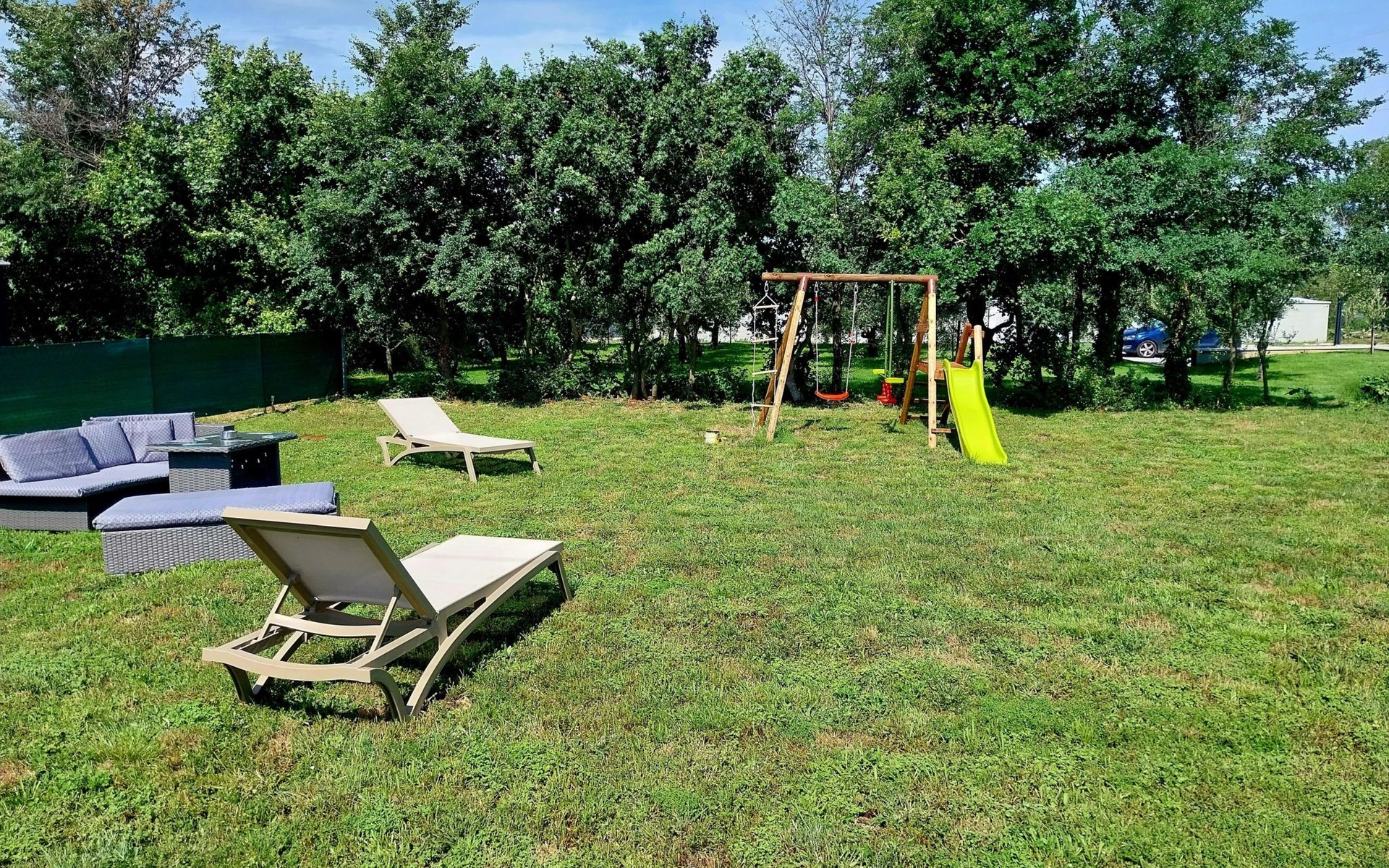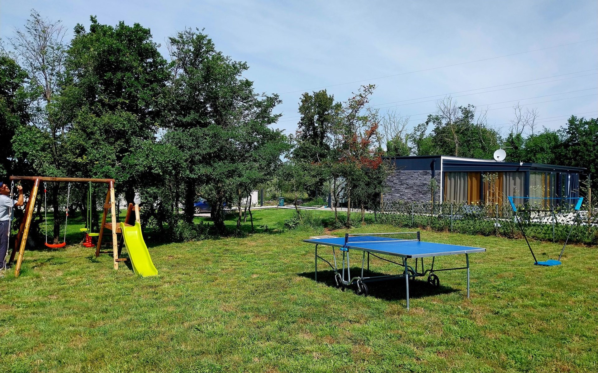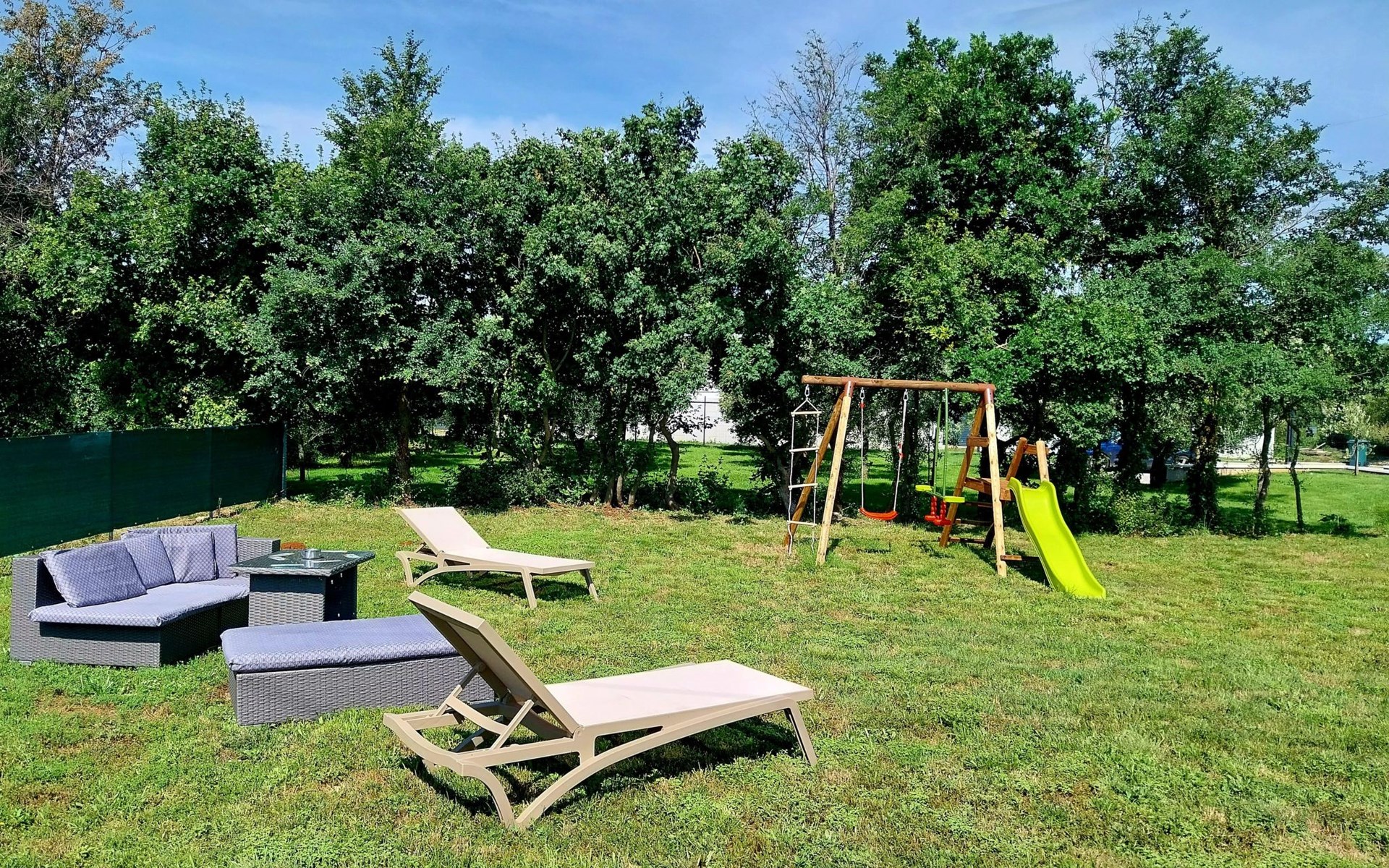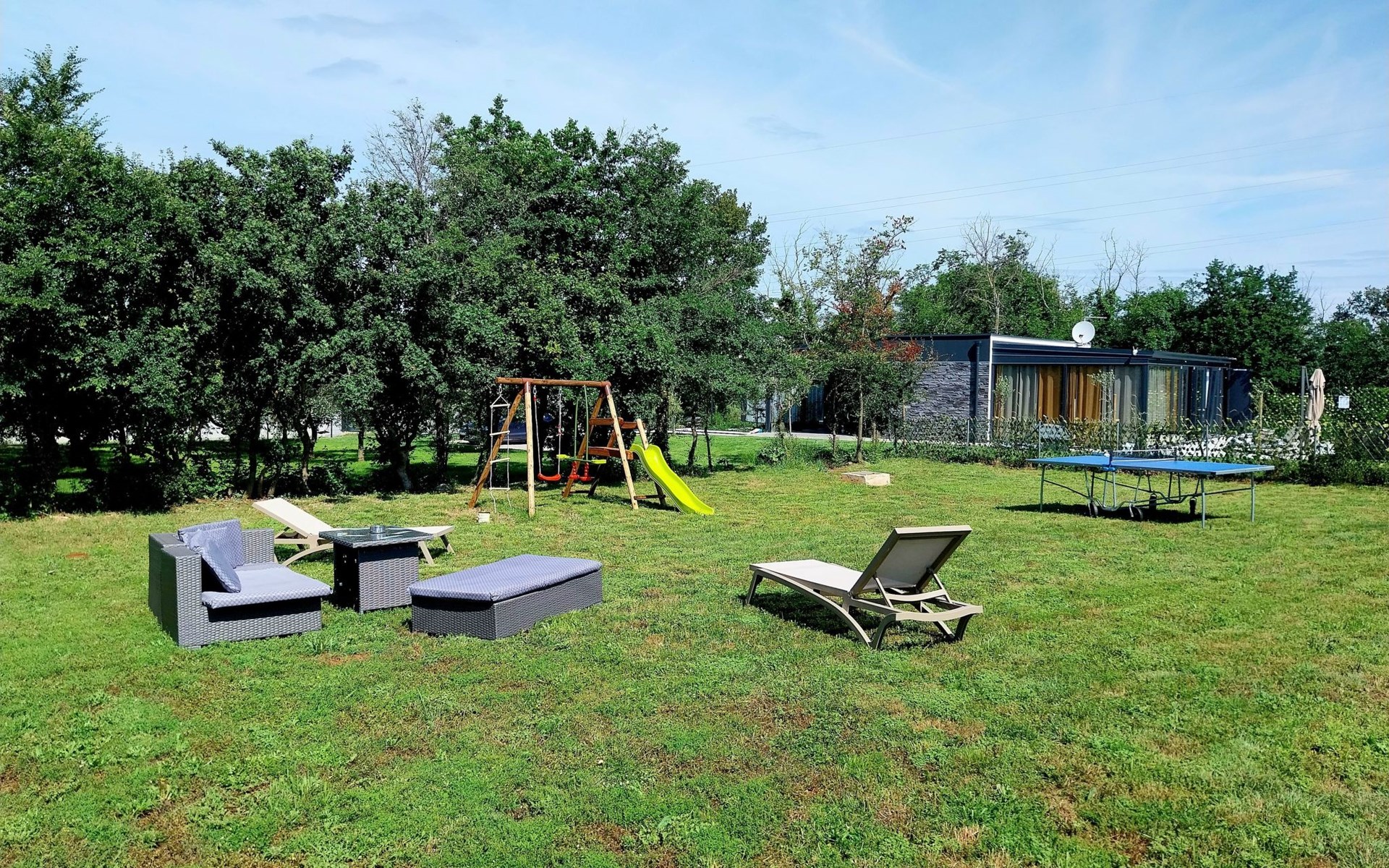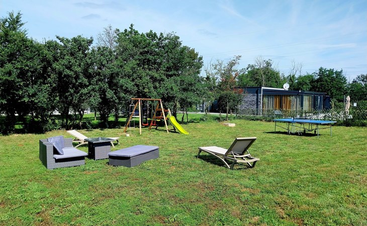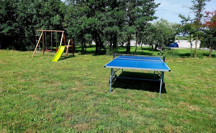 Für die jüngsten Gäste gibt es einen Kinderspielplatz mit Schaukeln, Tischtennis- und Badmintonausrüstung, während der weitläufige Garten unzählige Möglichkeiten für Spiele und Grillabende unter freiem Himmel bietet.