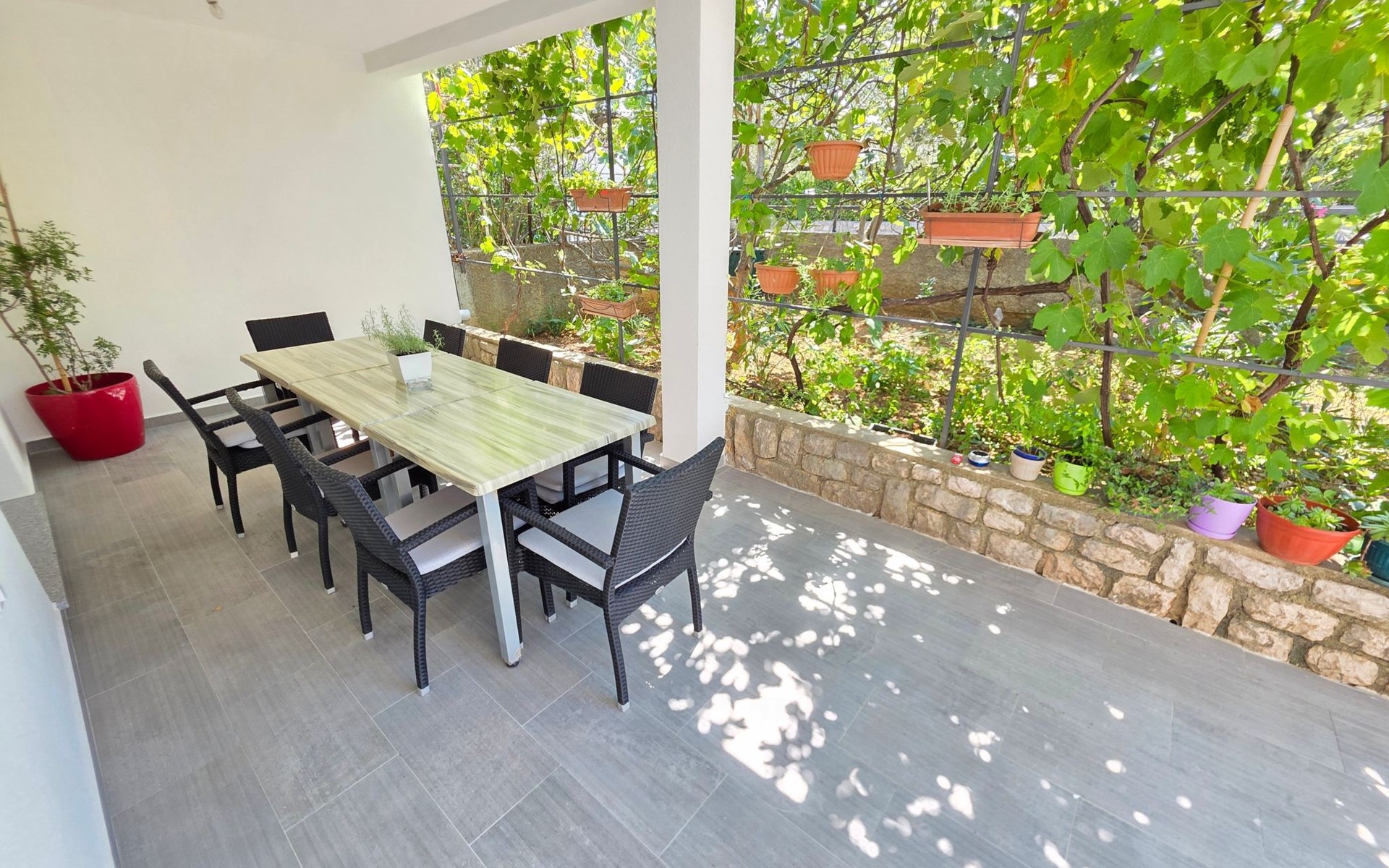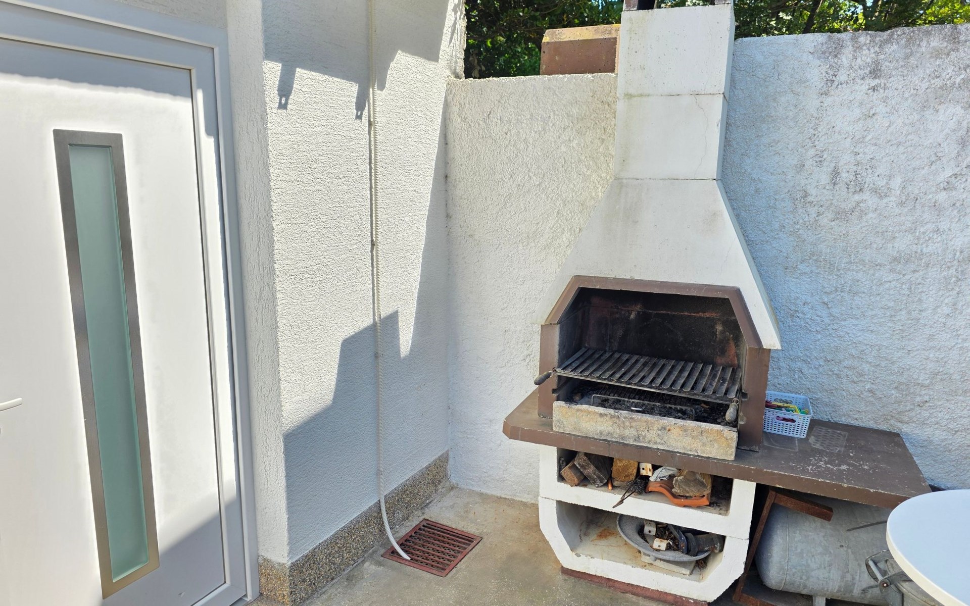 Die einladende Terrasse ist ein idealer Ort für den morgendlichen Kaffee oder die abendliche Entspannung inmitten des beruhigenden Ambientes des Gartens. Der Außenbereich wird durch einen Grill ergänzt, der sich perfekt für intime Zusammenkünfte und köstliche Mahlzeiten unter dem Sternenhimmel eignet.