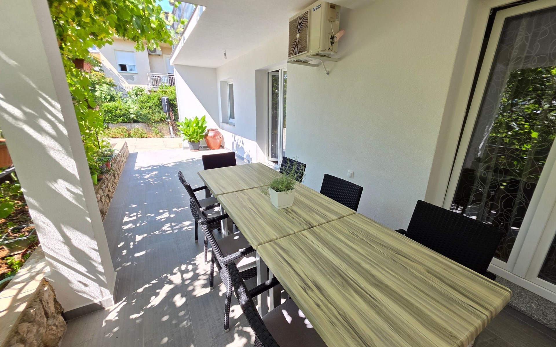 Die Wohnung ist gut ausgestattet, um alle Ihre Bedürfnisse zu befriedigen. Im Inneren finden Sie alles, was Sie für einen problemlosen Aufenthalt benötigen, einschließlich einer Klimaanlage in Teilen der Wohnung, die Sie an warmen Sommertagen kühl hält. Eine Waschmaschine zur alleinigen Nutzung sorgt für zusätzlichen Komfort, so dass Sie wenig einpacken und Ihre Urlaubskleidung frisch halten können. Außerdem ist die Wohnung haustierfreundlich, so dass auch ein kleiner Hund bei Ihren Urlaubsabenteuern dabei sein kann (gegen Aufpreis pro Tag).