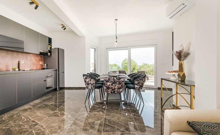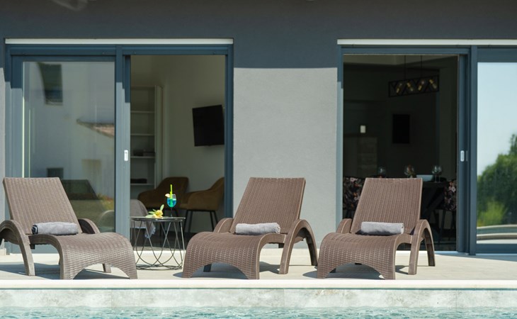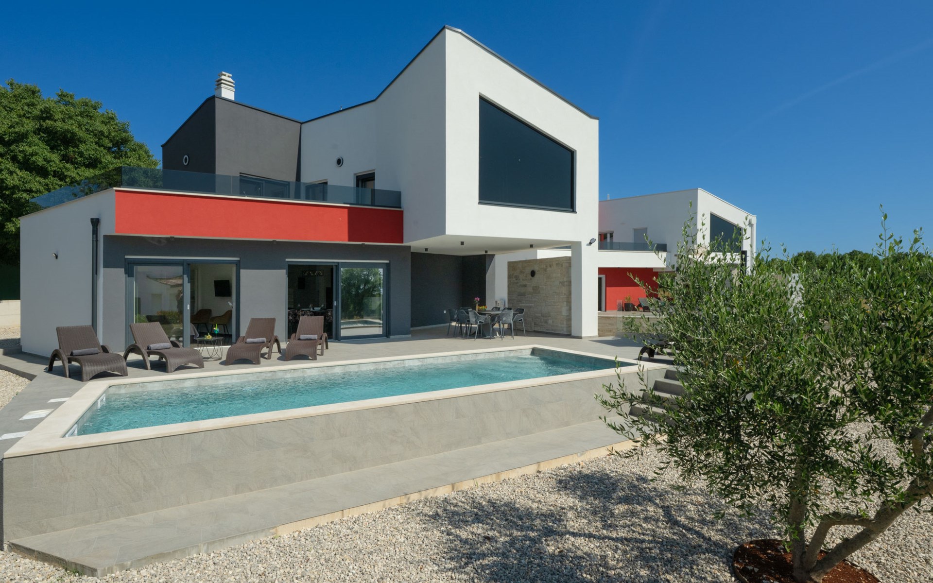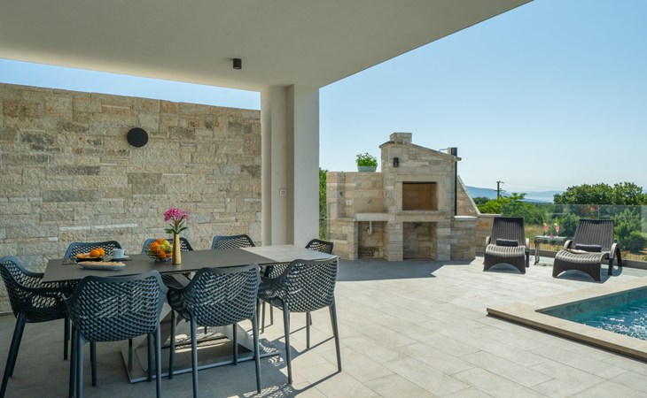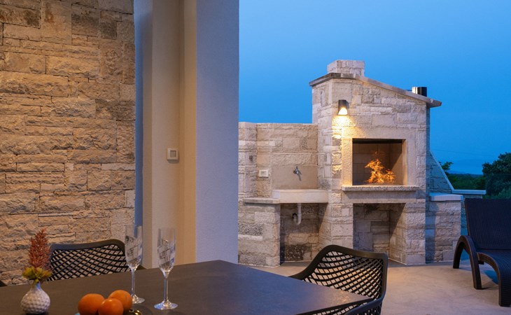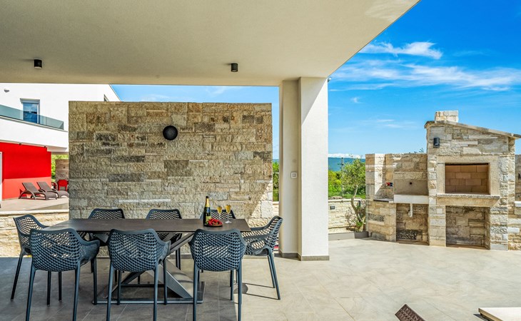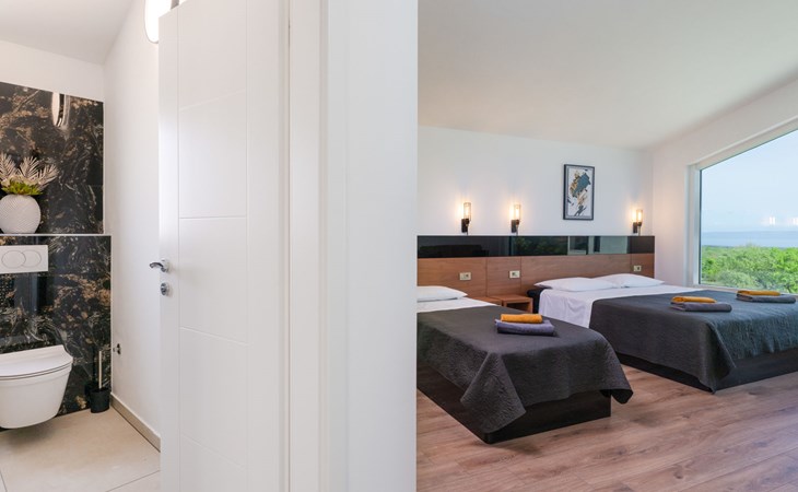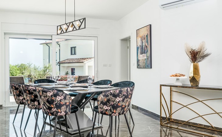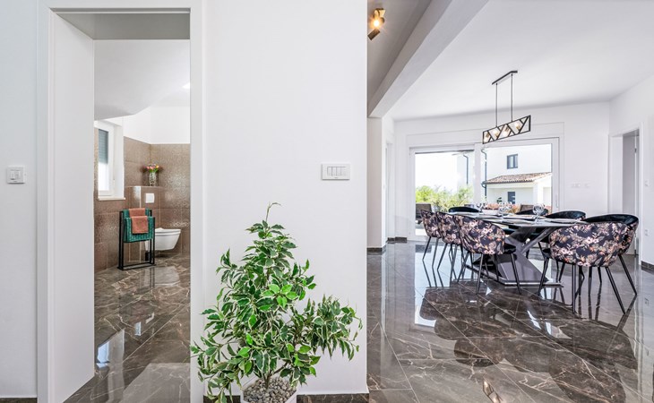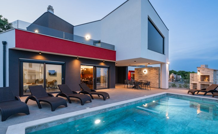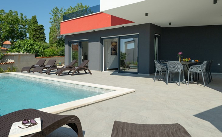 Krnica 22 km von Pula: Moderne, schöne Villa "Lu". Ruhige, sonnige Lage, 2.5 km vom Meer, 2.5 km vom Strand. Zur Alleinbenutzung: Grundstück 700 m2 (eingezäunt), Garten mit Blumen und Bäumen, Schwimmbad eckig (8 x 3 m, 28 m2, 140 cm tief, saisonale Verfügbarkeit: 01.Jan. - 31.Dez.) mit Innentreppe. Aussendusche, Terrasse (20 m2), Gartenmöbel, Grill, Poolpflege durch den Besitzer/Gärtner. Im Hause: Internetzugang, Waschmaschine. Parkplatz (für 2 Autos) beim Haus auf dem Grundstück. Einkaufsgeschäft, Restaurant 200 m, Bushaltestelle 500 m, Kieselstrand 5 km, Felsstrand 2.5 km, Hallenbad 5 km. Tennis 5 km, Reitstall 6 km, Sportzentrum 5 km, Wanderwege ab Haus 3 km, Radweg 3 km.