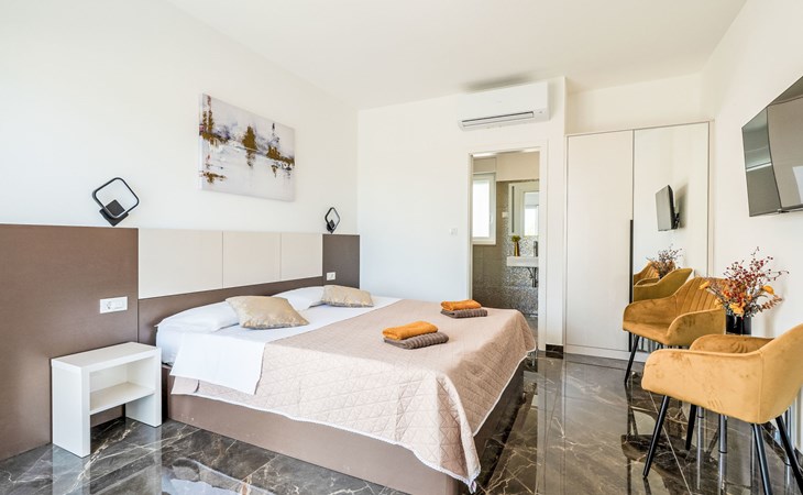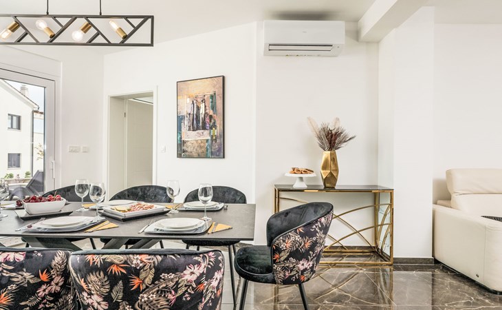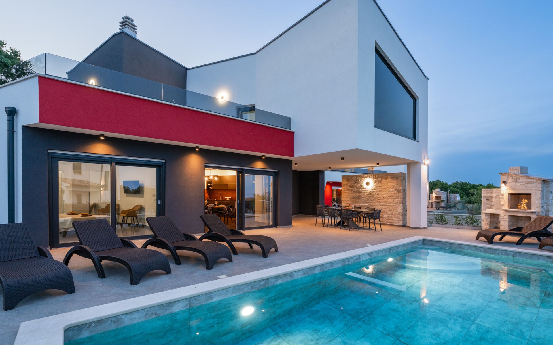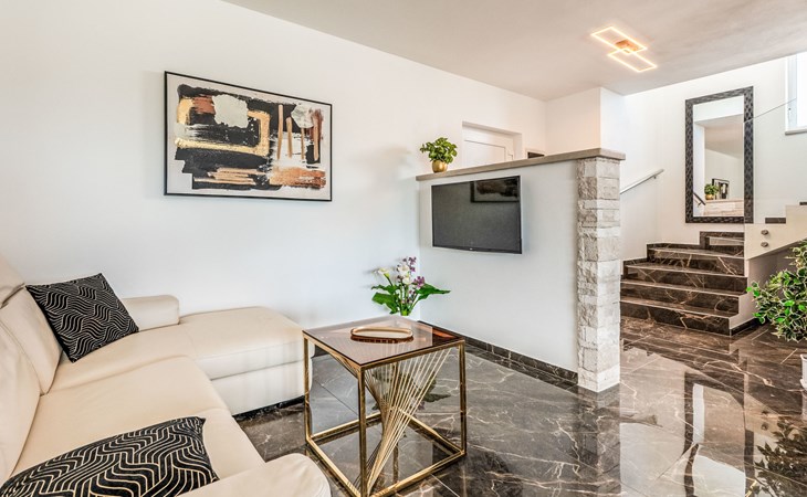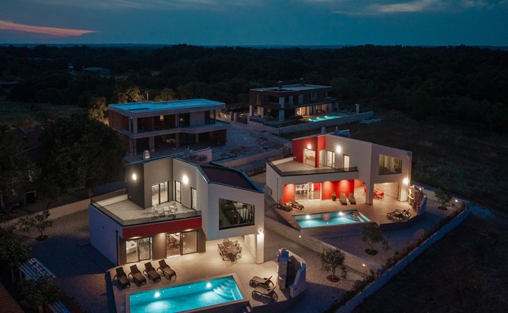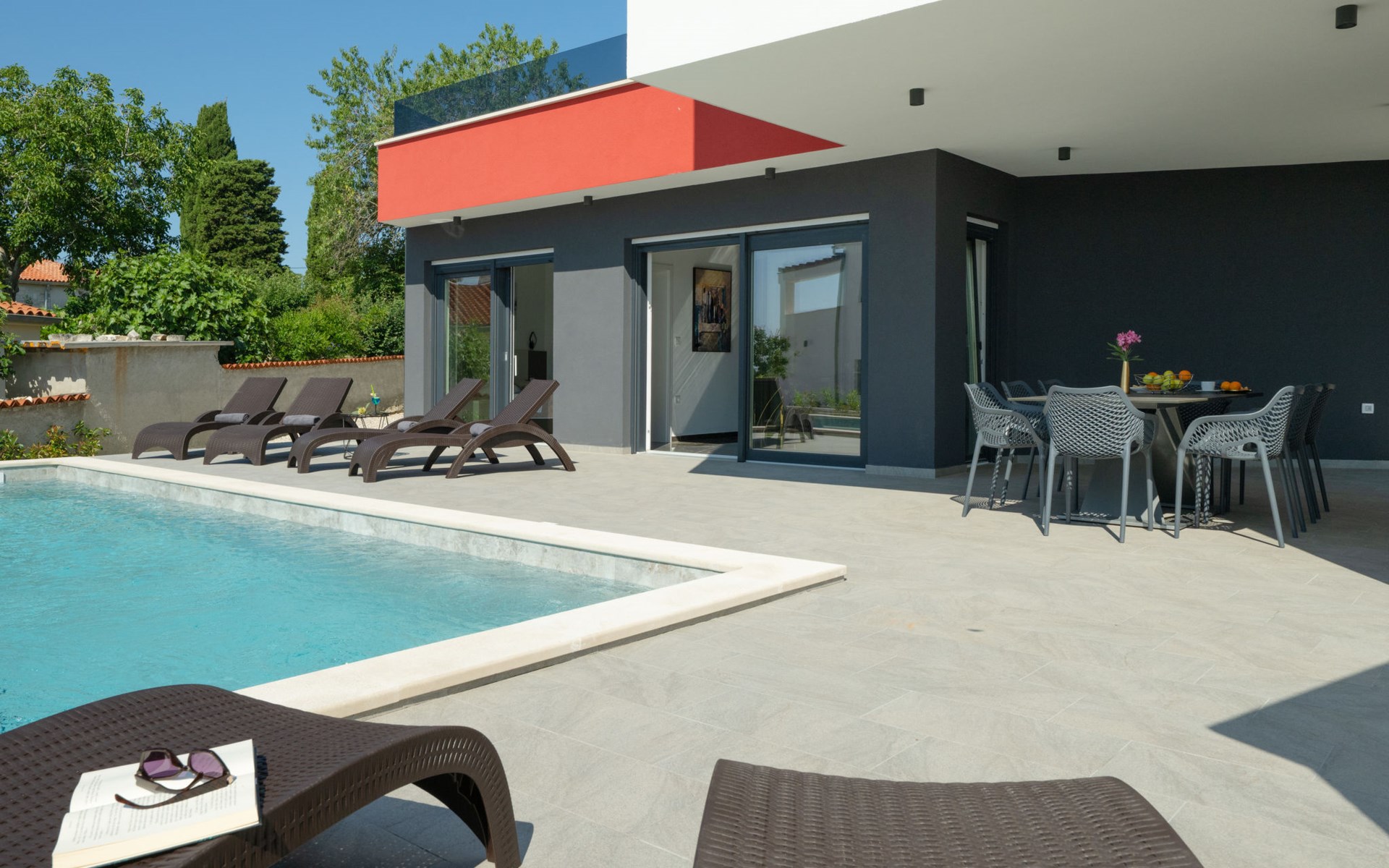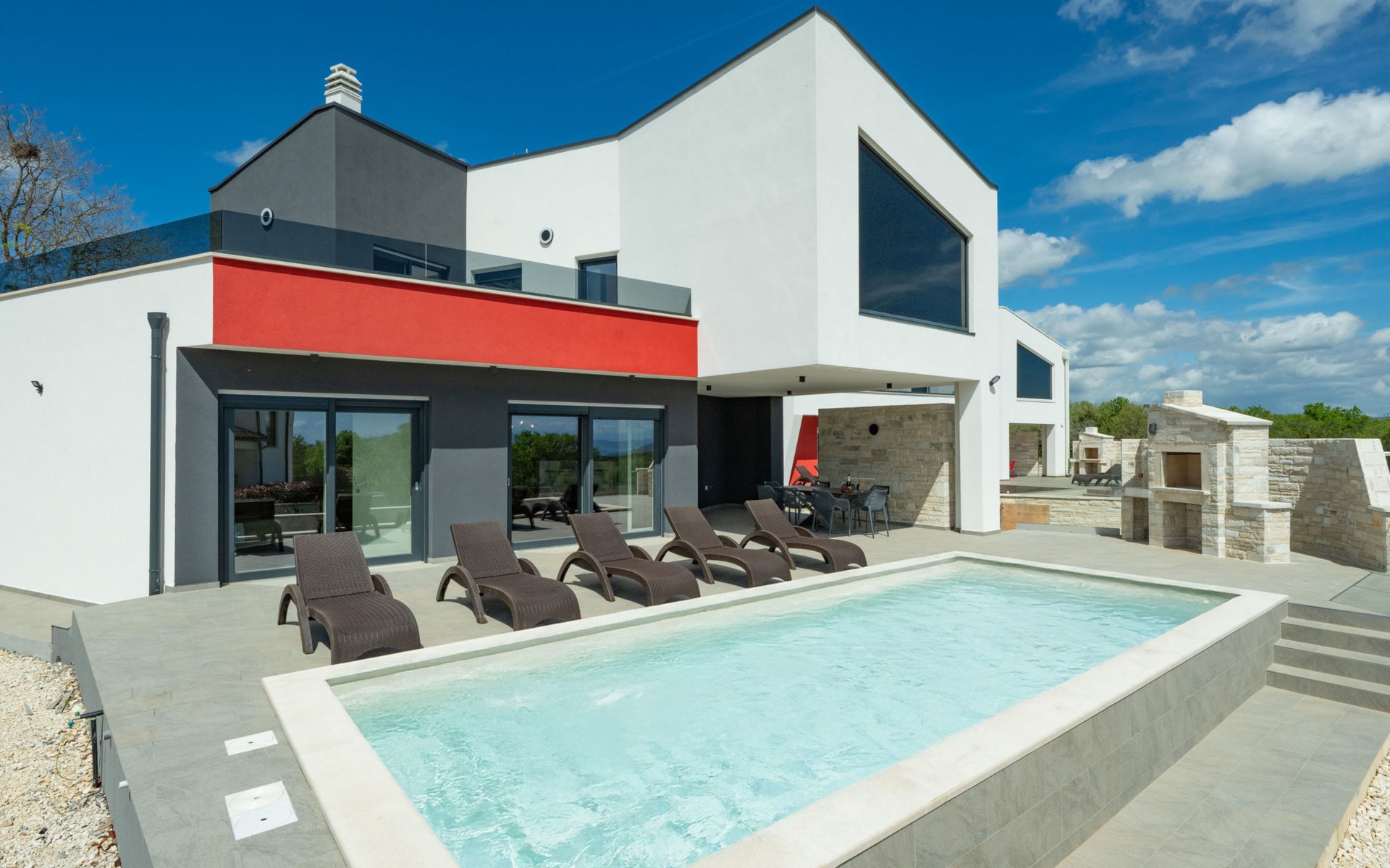 Krnica 22 km von Pula: Moderne, schöne Villa "Lu". Ruhige, sonnige Lage, 2.5 km vom Meer, 2.5 km vom Strand. Zur Alleinbenutzung: Grundstück 700 m2 (eingezäunt), Garten mit Blumen und Bäumen, Schwimmbad eckig (8 x 3 m, 28 m2, 140 cm tief, saisonale Verfügbarkeit: 01.Jan. - 31.Dez.) mit Innentreppe. Aussendusche, Terrasse (20 m2), Gartenmöbel, Grill, Poolpflege durch den Besitzer/Gärtner. Im Hause: Internetzugang, Waschmaschine. Parkplatz (für 2 Autos) beim Haus auf dem Grundstück. Einkaufsgeschäft, Restaurant 200 m, Bushaltestelle 500 m, Kieselstrand 5 km, Felsstrand 2.5 km, Hallenbad 5 km. Tennis 5 km, Reitstall 6 km, Sportzentrum 5 km, Wanderwege ab Haus 3 km, Radweg 3 km.