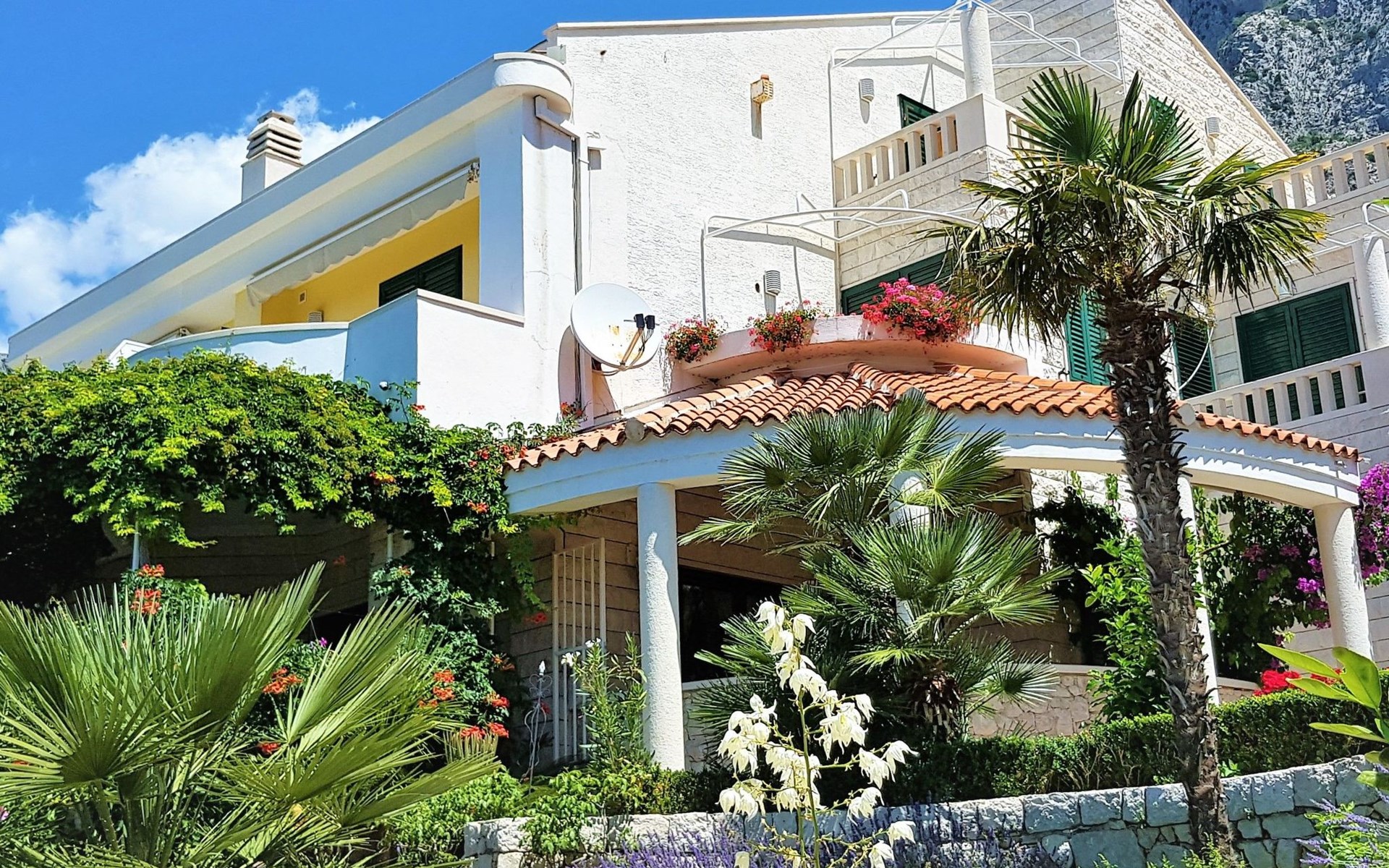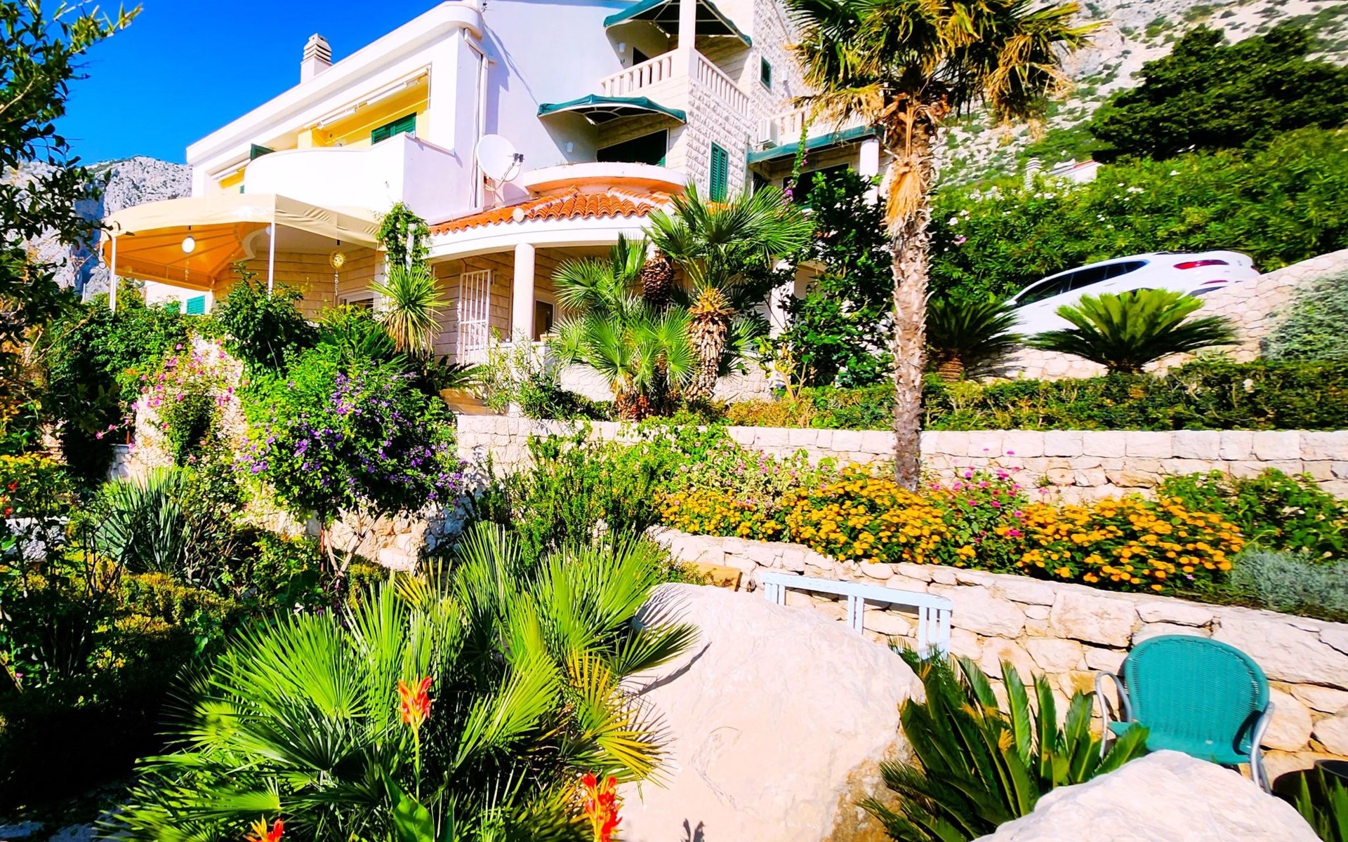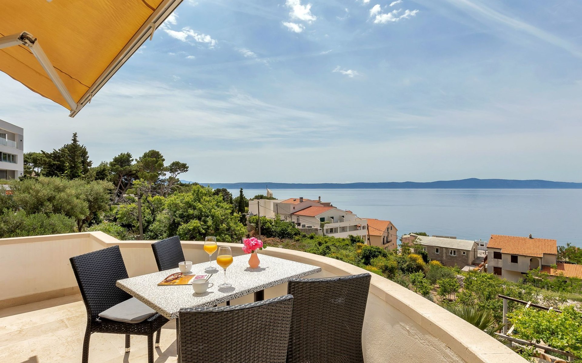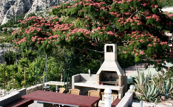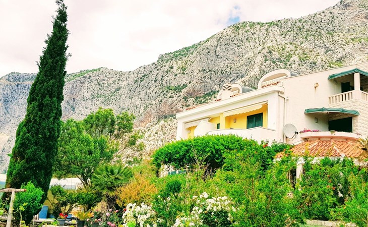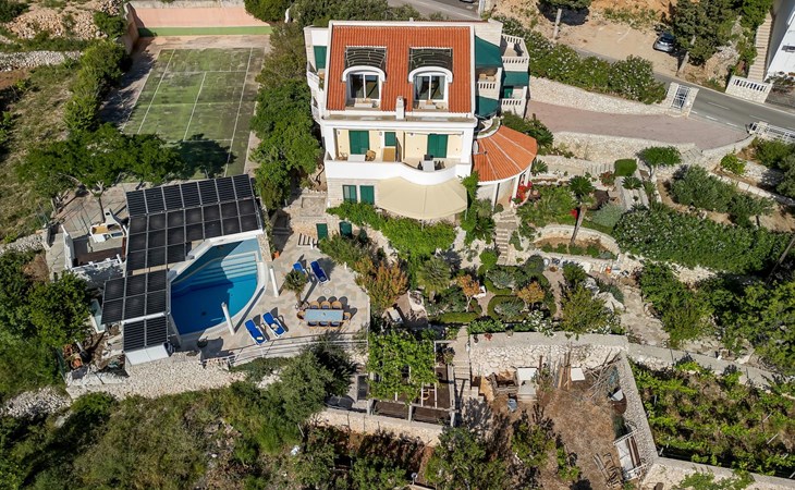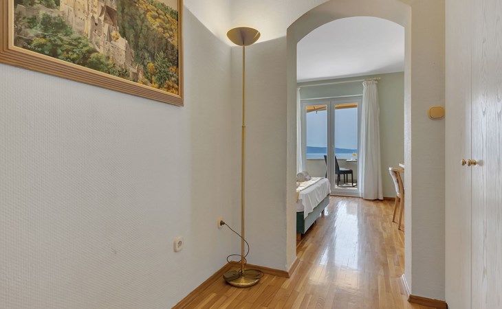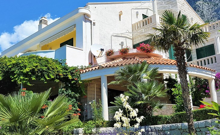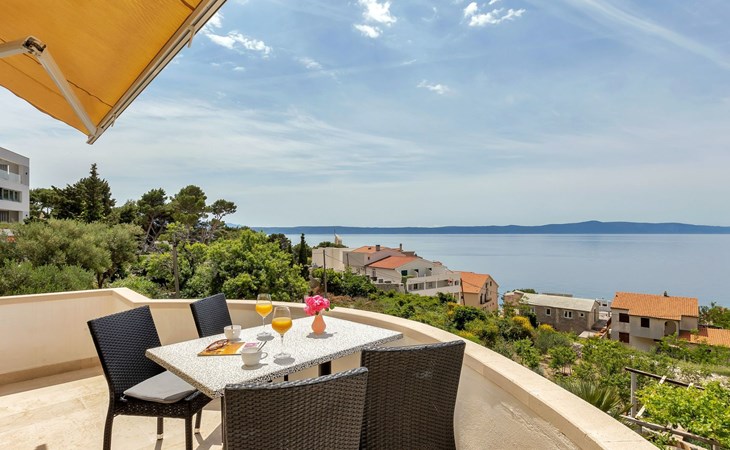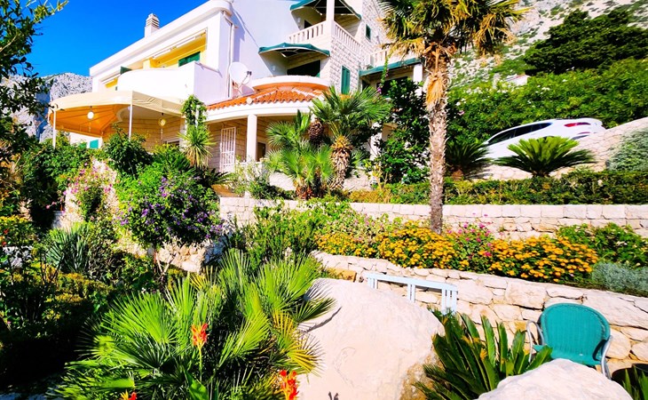 Unsere Villa**** mit ihren fünf exklusiven Apartments liegt nur 150m vom Strand entfernt auf einer Anhöhe mit einem wunderschönen Blick auf das Meer und die vorgelagerten Inseln. Das Haus ist eingebettet in einen einzigartigen Garten in dem verschiedene mediterane Pflanzen gedeihen. Bei uns wohnen Sie in komfortablen und geschmackvoll eingerichteten Apartments, die alle einen Balkon oder Terasse mit Meerblick haben. Die richtige Atmosphäre zum puren Wohlfühlen bietet das Haus umrundet von einem parkähnlichem Garten, sowie unser privater Tennisplatz für Sportfans. Ausserdem bieten wir Ihnen Parkplätze und einen separaten Gästegrillplatz. Die Apartments befinden sich auf ersten Etage und ist 70m² gross. Das Apartment hat drei Terassen und Balkone mit tollem Ausblick auf die Adria, Insel Hvar und Brac, das Biokovo Gebirge und die Gartenanlage. Sie sind mit zwei Schlafzimmern ein grosses und ein kleineres(zwei getrente Betten), zwei Badezimmern, einem Wohnzimmer mit Essecke und Küche ausgestattet und eignen sich für bis zu vier Personen.