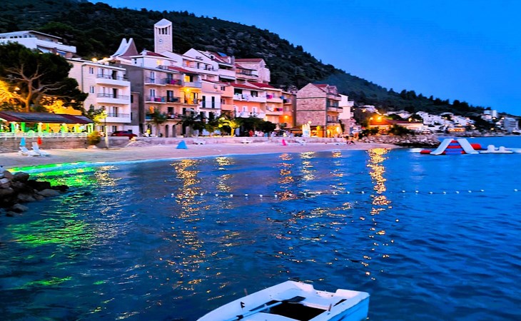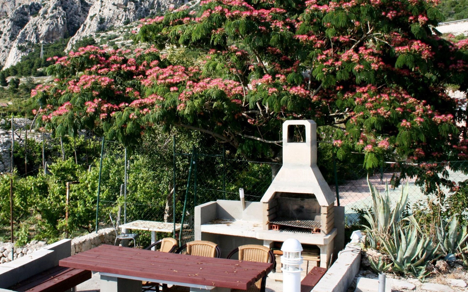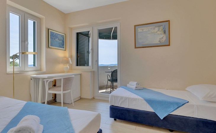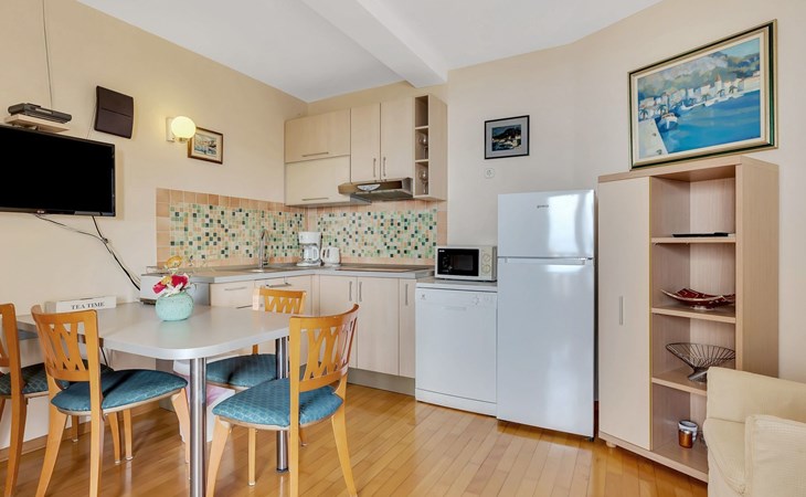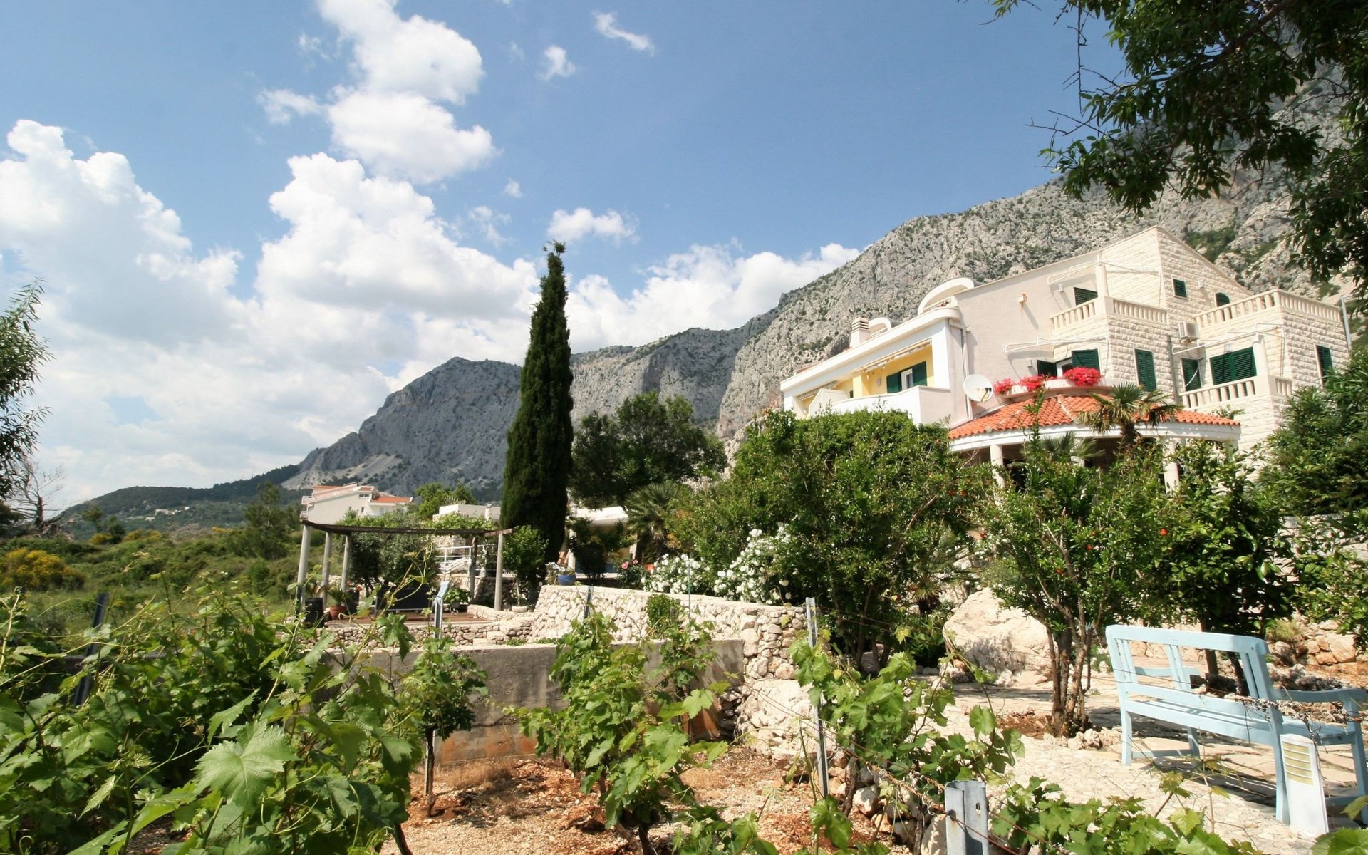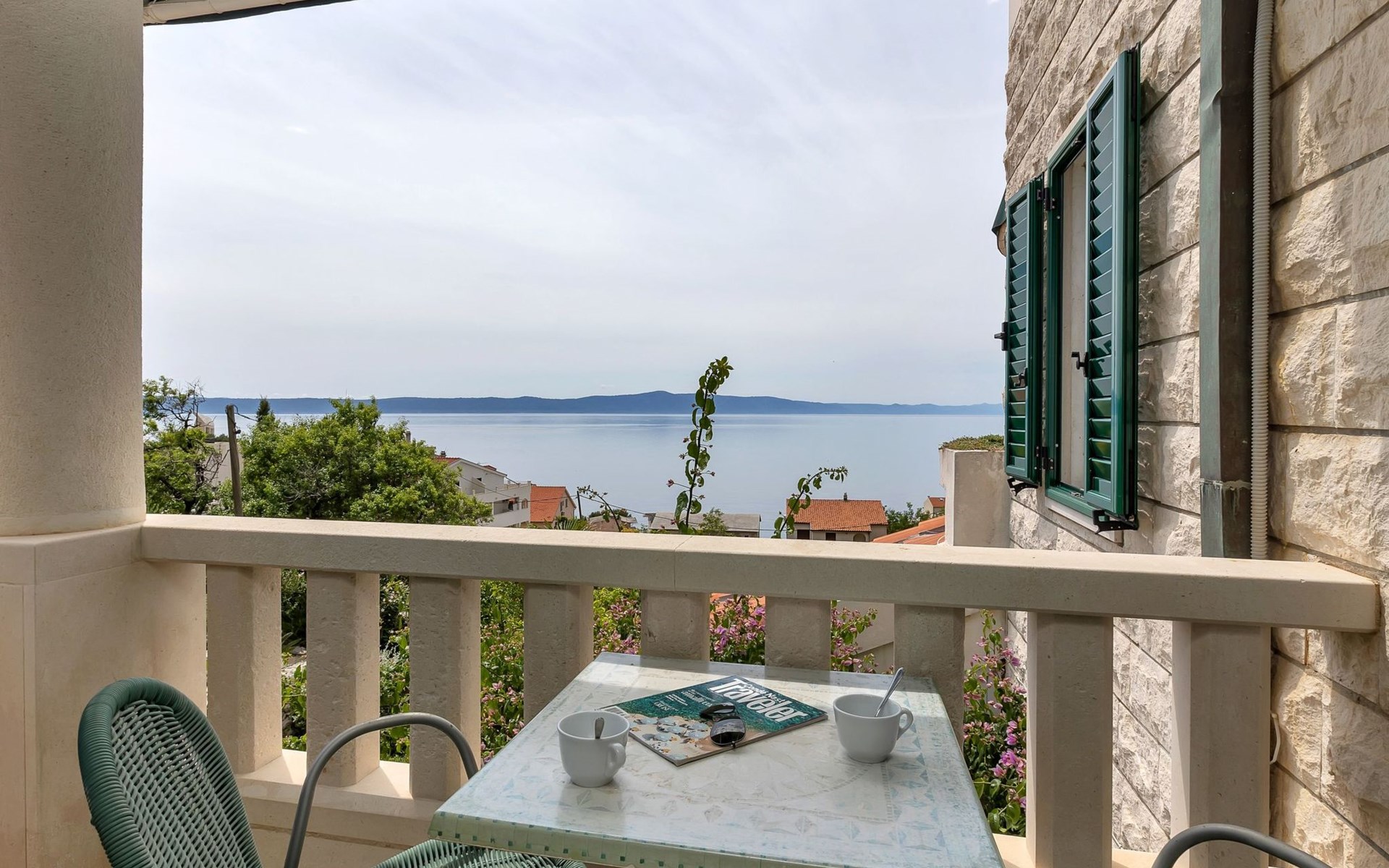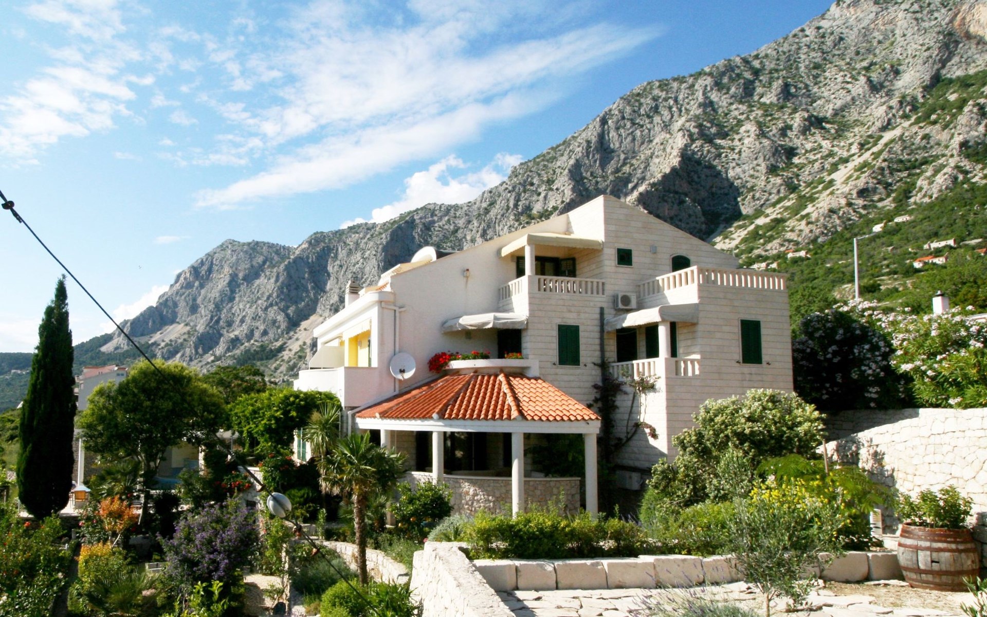 Unsere Villa**** mit ihren fünf exklusiven Apartments liegt nur 150m vom Strand entfernt auf einer Anhöhe mit einem wunderschönen Blick auf das Meer und die vorgelagerten Inseln. Das Haus ist eingebettet in einen einzigartigen Garten in dem verschiedene mediterane Pflanzen gedeihen. Bei uns wohnen Sie in komfortablen und geschmackvoll eingerichteten Apartments, die alle einen Balkon oder Terasse mit Meerblick haben. Die richtige Atmosphäre zum puren Wohlfühlen bietet das Haus umrundet von einem parkähnlichem Garten, sowie unser privater Tennisplatz für Sportfans. Ausserdem bieten wir Ihnen Parkplätze und einen separaten Gästegrillplatz. Die Apartments befinden sich auf ersten Etage und ist 70m² gross. Das Apartment hat drei Terassen und Balkone mit tollem Ausblick auf die Adria, Insel Hvar und Brac, das Biokovo Gebirge und die Gartenanlage. Sie sind mit zwei Schlafzimmern ein grosses und ein kleineres(zwei getrente Betten), zwei Badezimmern, einem Wohnzimmer mit Essecke und Küche ausgestattet und eignen sich für bis zu vier Personen.