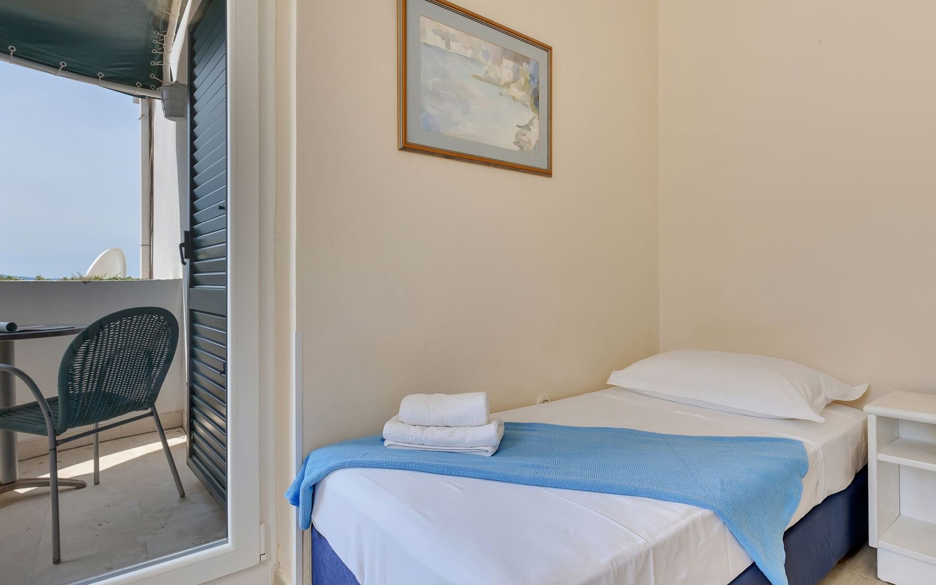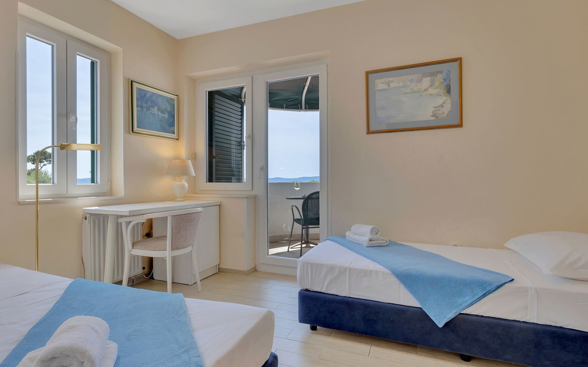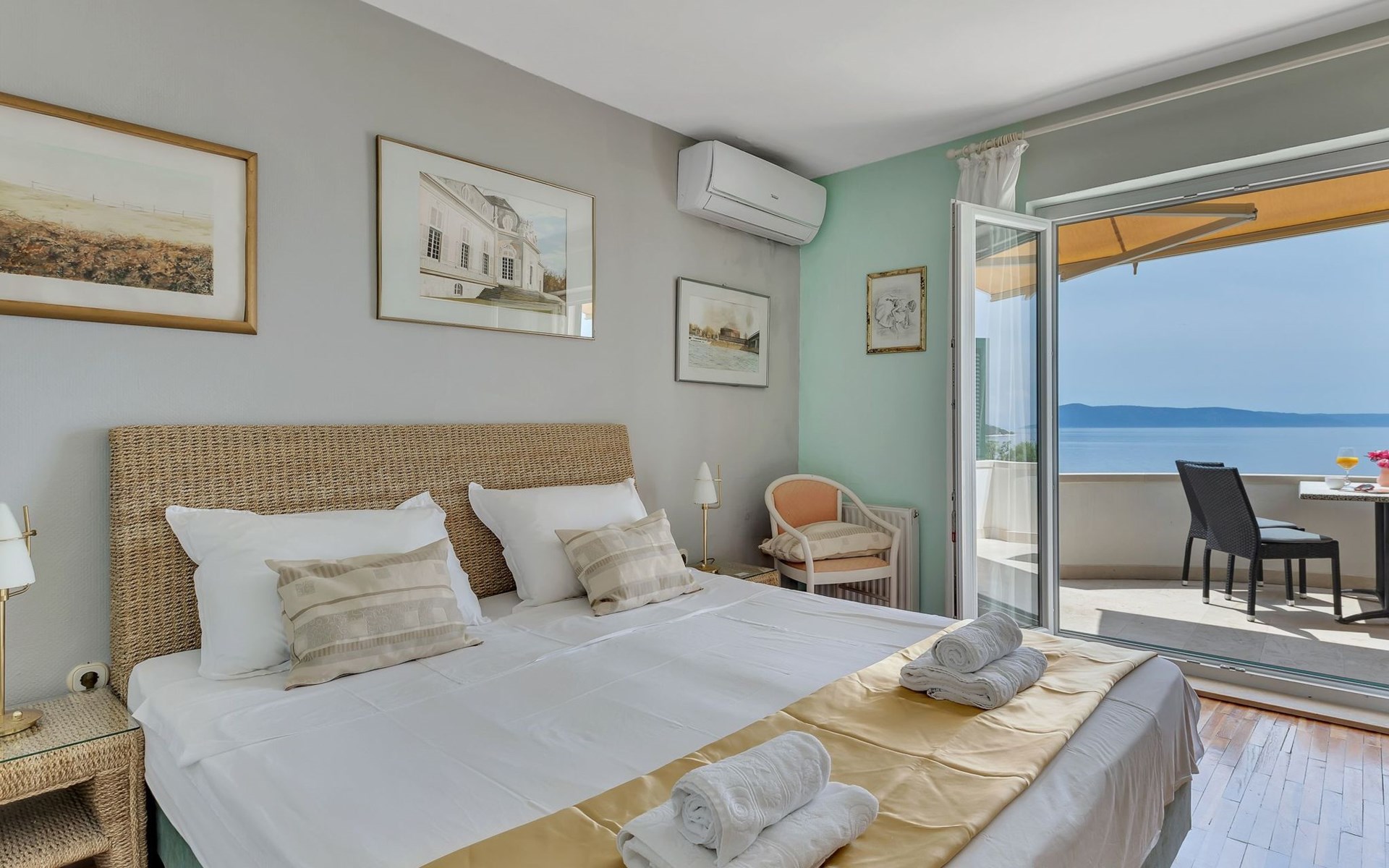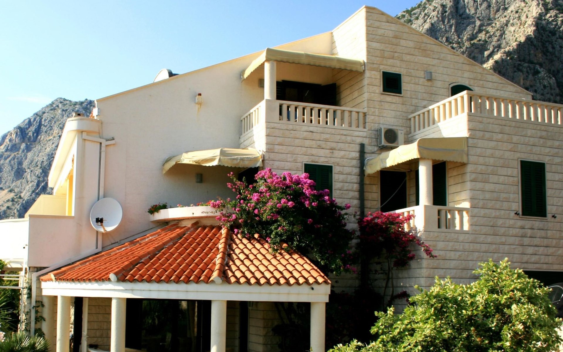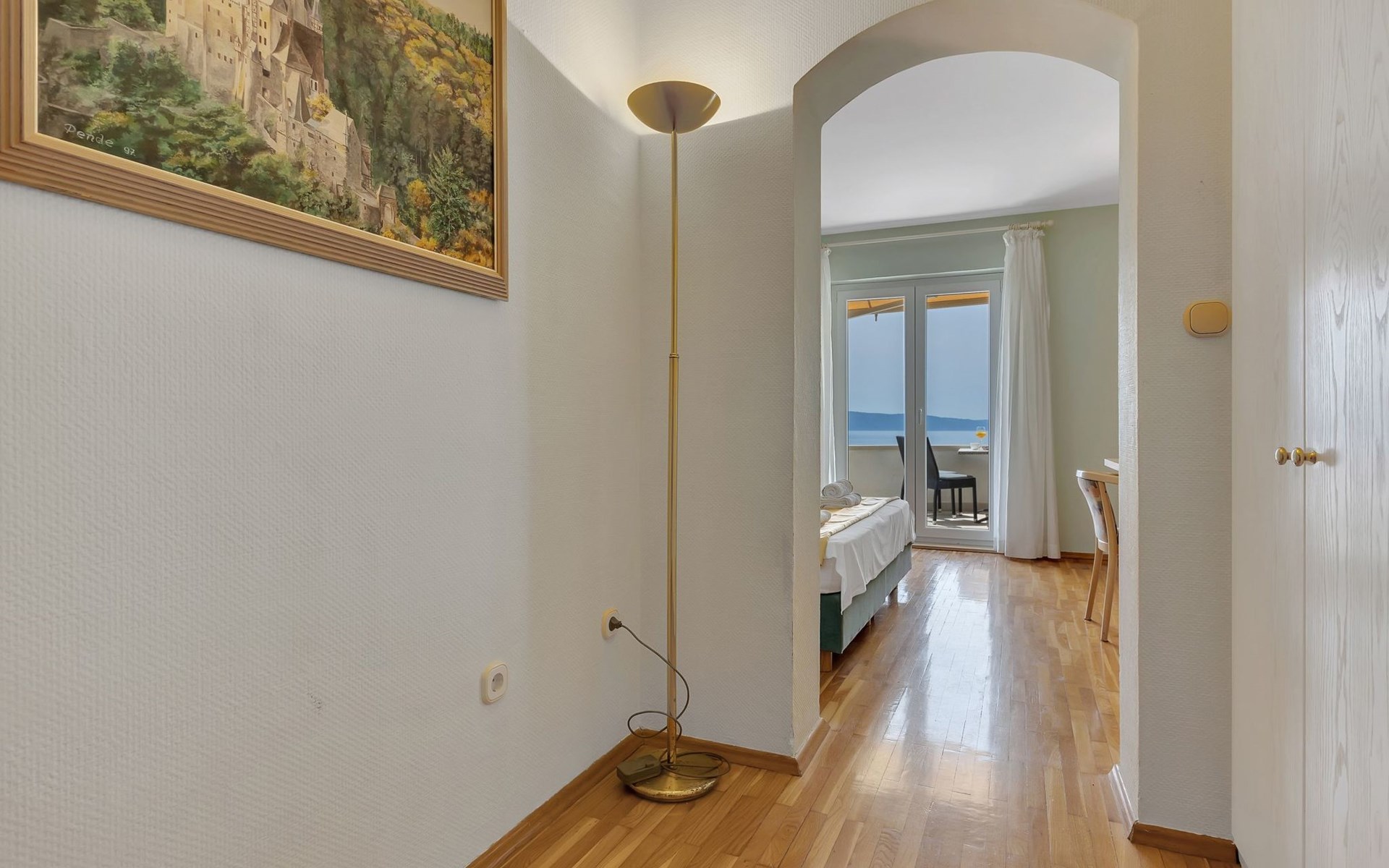 Unsere Villa**** mit ihren fünf exklusiven Apartments liegt nur 150m vom Strand entfernt auf einer Anhöhe mit einem wunderschönen Blick auf das Meer und die vorgelagerten Inseln. Das Haus ist eingebettet in einen einzigartigen Garten in dem verschiedene mediterane Pflanzen gedeihen. Bei uns wohnen Sie in komfortablen und geschmackvoll eingerichteten Apartments, die alle einen Balkon oder Terasse mit Meerblick haben. Die richtige Atmosphäre zum puren Wohlfühlen bietet das Haus umrundet von einem parkähnlichem Garten, sowie unser privater Tennisplatz für Sportfans. Ausserdem bieten wir Ihnen Parkplätze und einen separaten Gästegrillplatz. Die Apartments befinden sich auf ersten Etage und ist 70m² gross. Das Apartment hat drei Terassen und Balkone mit tollem Ausblick auf die Adria, Insel Hvar und Brac, das Biokovo Gebirge und die Gartenanlage. Sie sind mit zwei Schlafzimmern ein grosses und ein kleineres(zwei getrente Betten), zwei Badezimmern, einem Wohnzimmer mit Essecke und Küche ausgestattet und eignen sich für bis zu vier Personen.