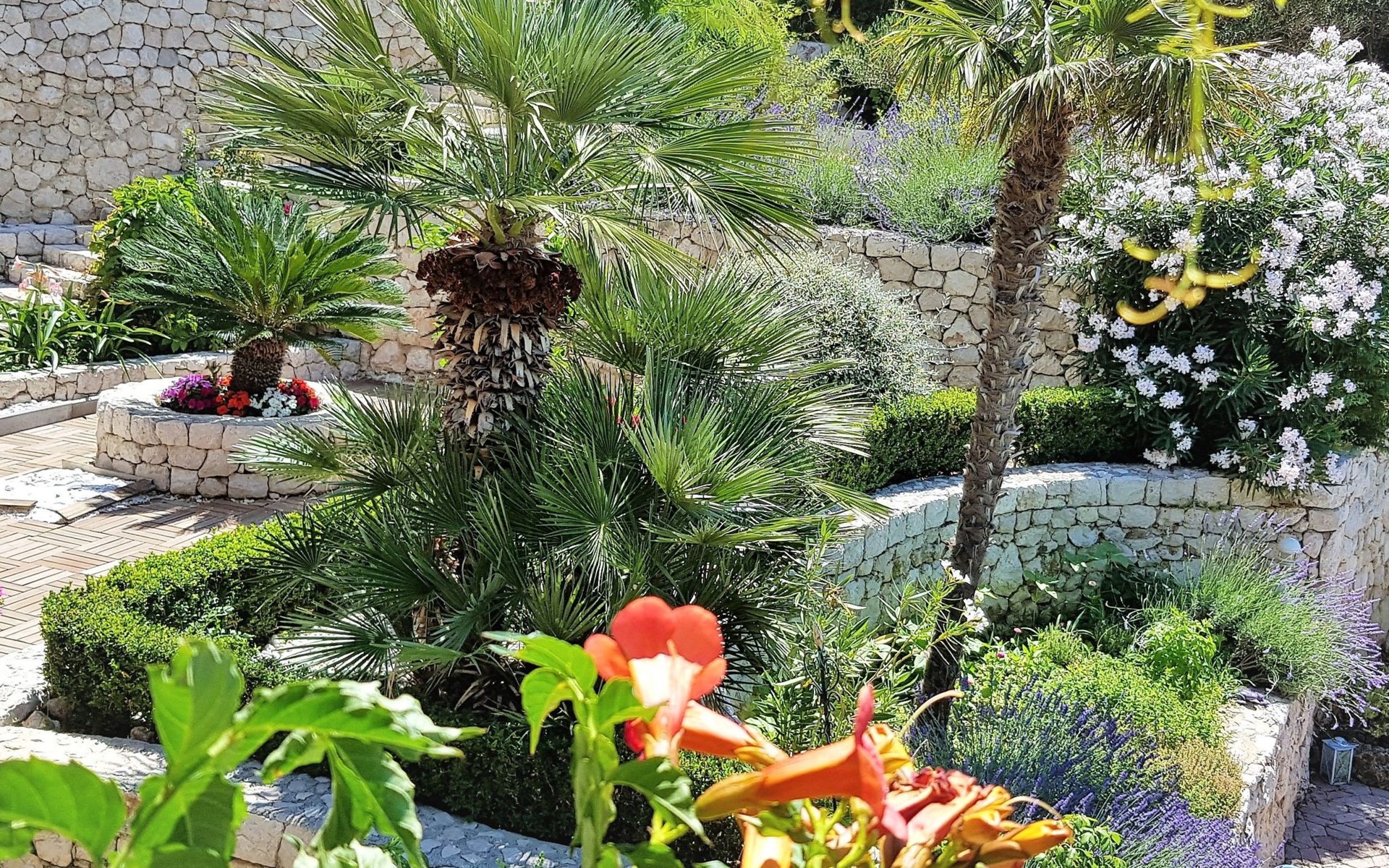 Einen besonderen Charme erhält der Garten durch die Gestaltung von authentischen Steinwänden in Kombination mit Weinhängen und verschiedensten lokalen Pflanzen.