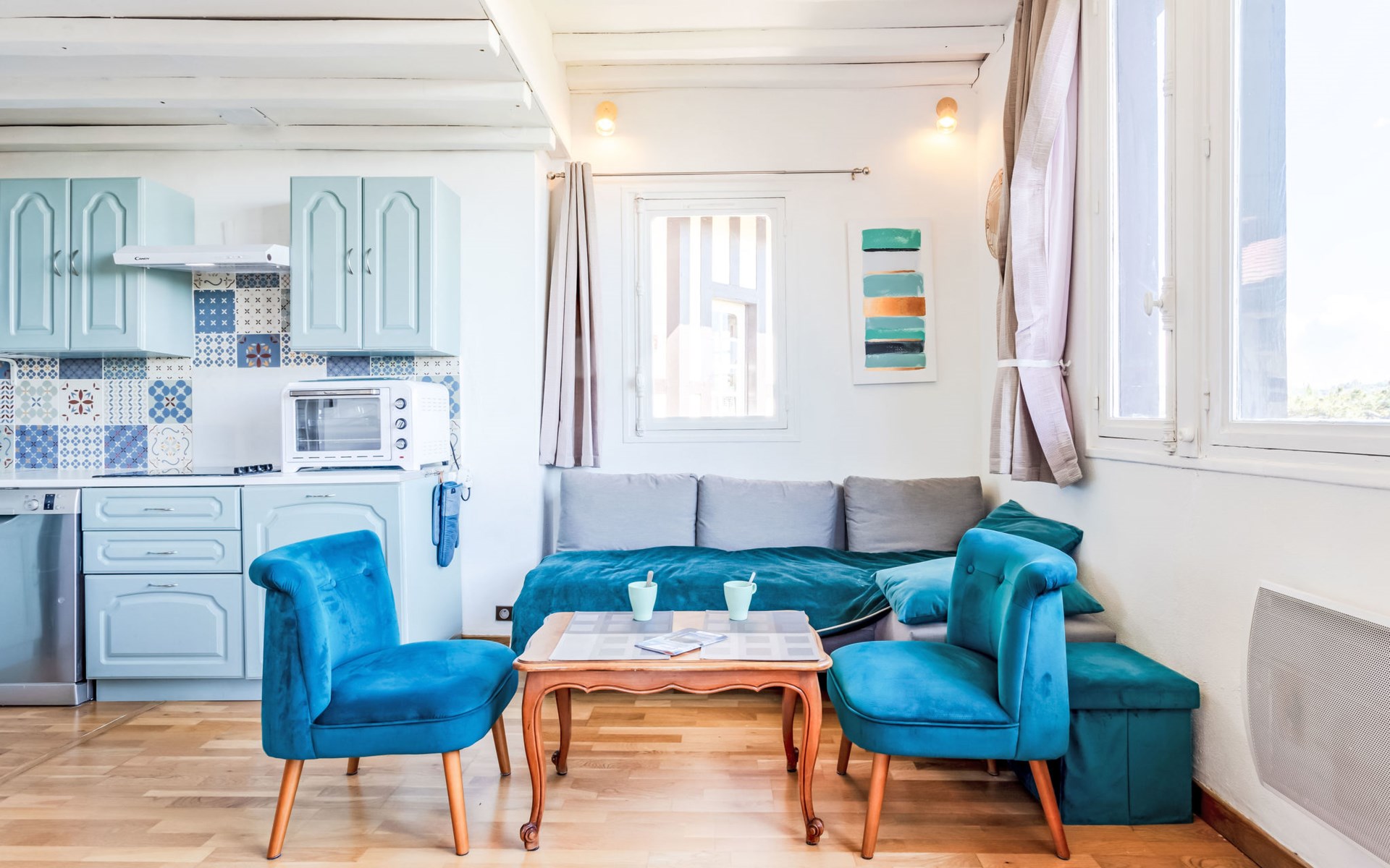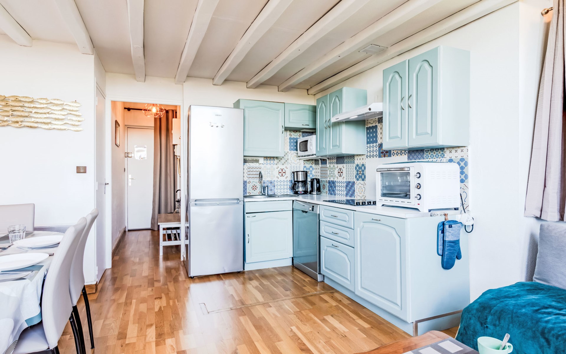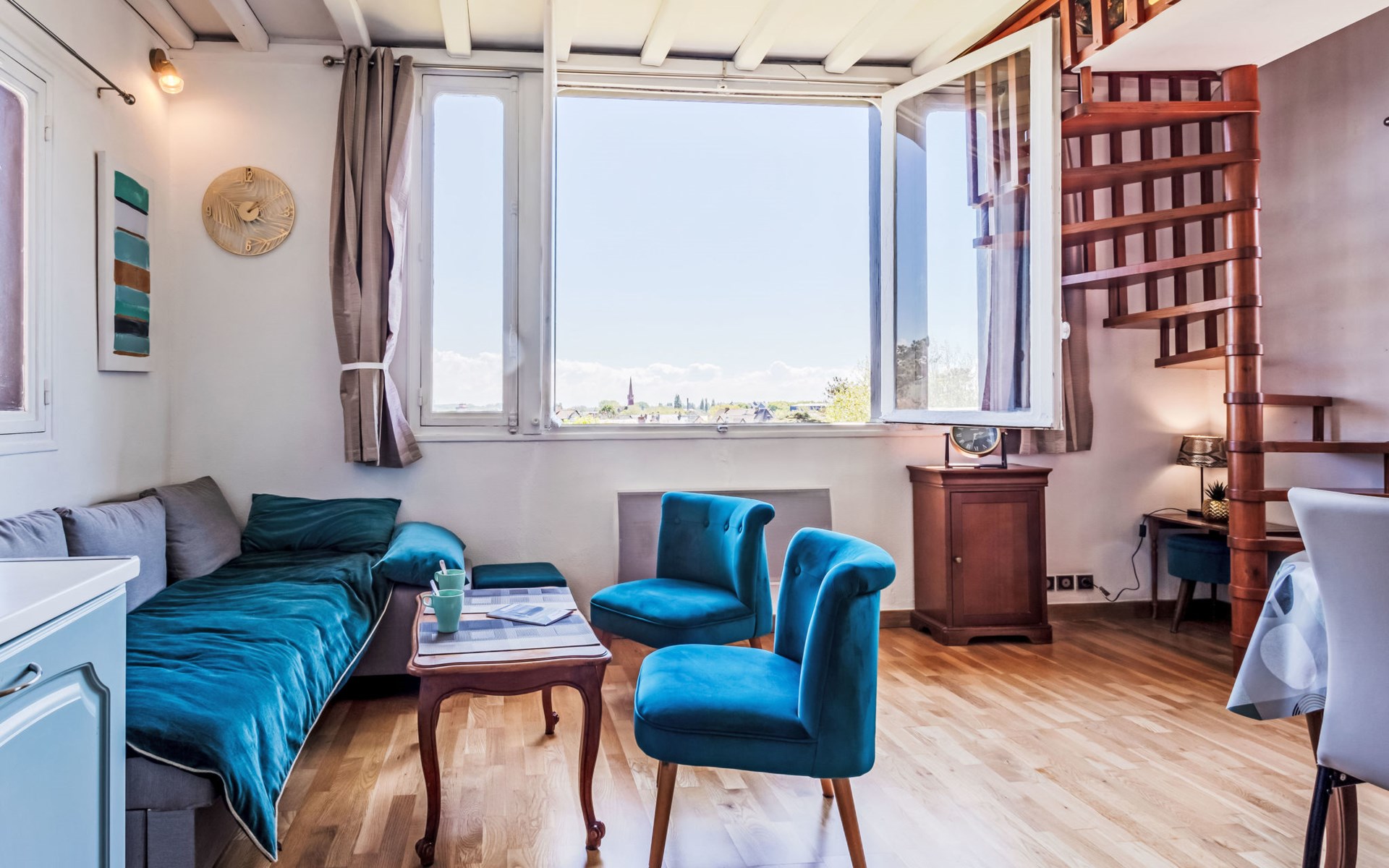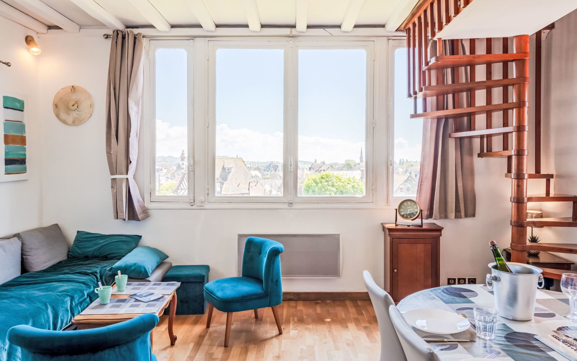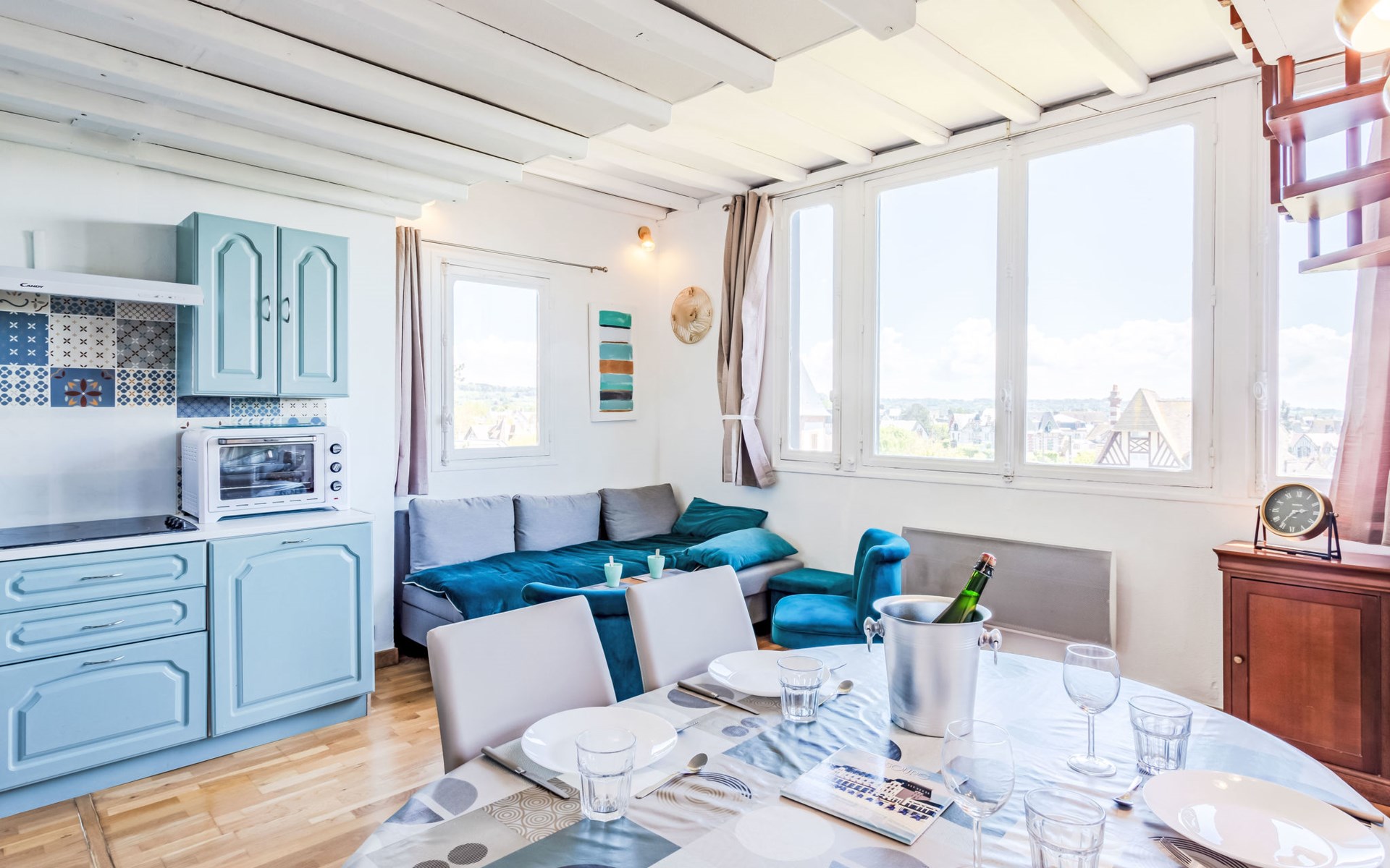 Residenz "Marie Antoinette", auf 2 Stockwerken. Im Ortszentrum von Cabourg, im Ort, 200 m vom Meer, 200 m vom Strand. Öffentliche Parkplätze auf der Strasse. Einkaufsgeschäft 200 m, Supermarkt 1.7 km, Restaurant 200 m, Bushaltestelle "Hôtel de Ville" 900 m, Thermalbad "Thalazur" 900 m. Golfplatz (9 Loch) 1.8 km. Bitte beachten: kein Fahrstuhl vorhanden.