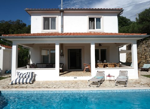 Matulji: Moderne, schöne Villa "Vista", auf 2 Stockwerken. 1.7 km vom Zentrum von Matulji, 3.5 km vom Zentrum von Opatija, ruhige, sonnige, erhöhte Lage, 2.5 km vom Meer, 2.5 km vom Strand, in einer Sackgasse. Zur Alleinbenutzung: Grundstück 1'050 m2 (eingezäunt), Rasen 300 m2, Schwimmbad eckig (32 m2, 150 - 160 cm tief, saisonale Verfügbarkeit: 21.Mai. - 15.Sep.). Aussendusche, Grill. Im Hause: Internetzugang, Waschmaschine, Wäschetrockner. Parkplatz (für 6 Autos) beim Haus auf dem Grundstück. Einkaufsgeschäft, Supermarkt 700 m, Restaurant 2 km, Bushaltestelle 400 m, Kieselstrand 2.5 km, betonierter Strand 2.5 km. Wanderwege ab Haus 2 km. Bitte beachten: geeignet für Familien. Der Besitzer akzeptiert keine Jugendgruppen. Die Nachbarschaft ist sehr lärmempfindlich. Ruhe und gutes Benehmen wird erwartet. Keine Vermietung an Jugendgruppen. Das veranstalten von Partys ist nicht gestattet. Das Haus besteht aus 3 Wohnungen vermietet als eine Einheit : eine Wohnung im Erdgeschoss und zwei Wohnungen im ersten Stock.