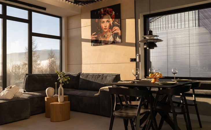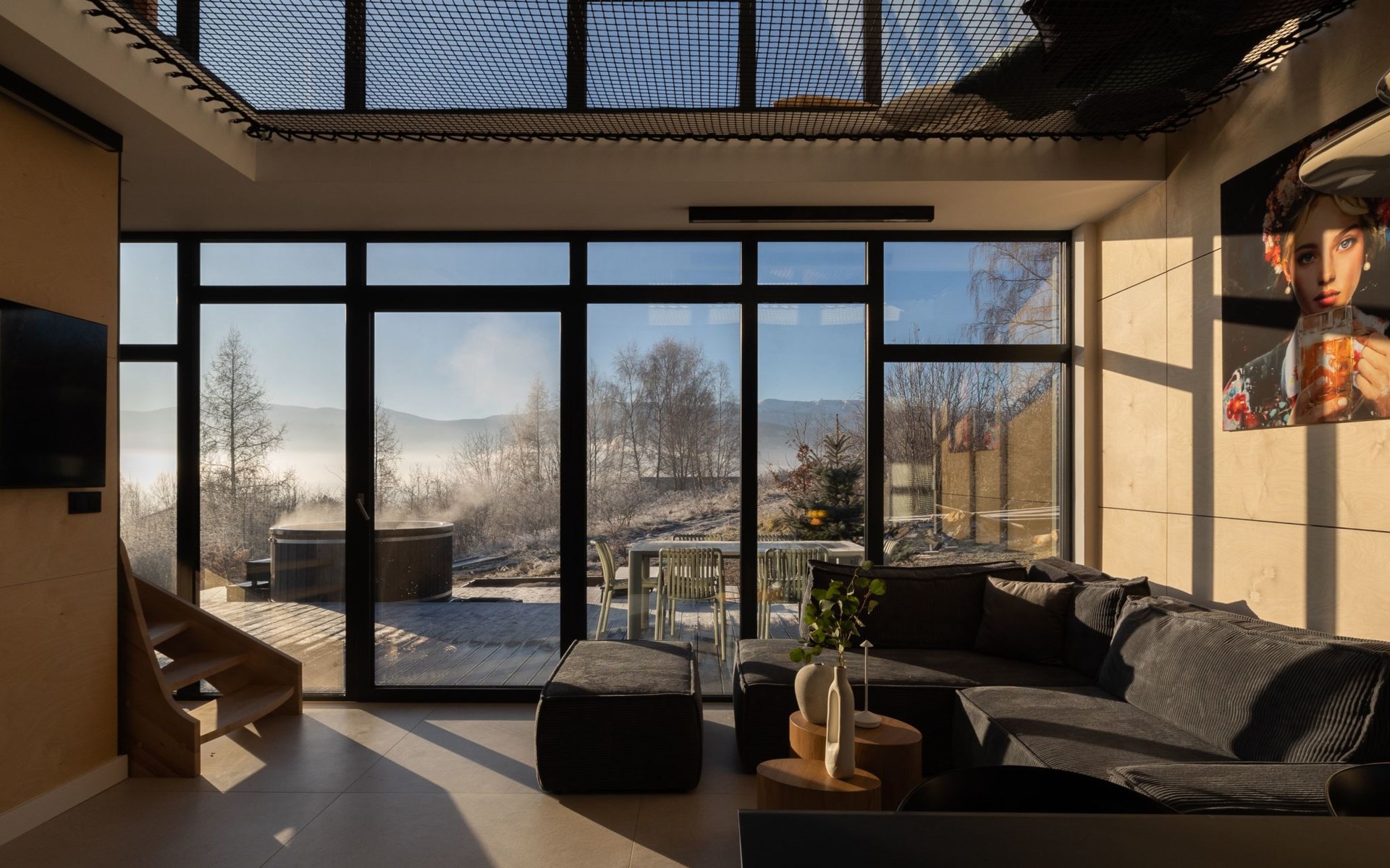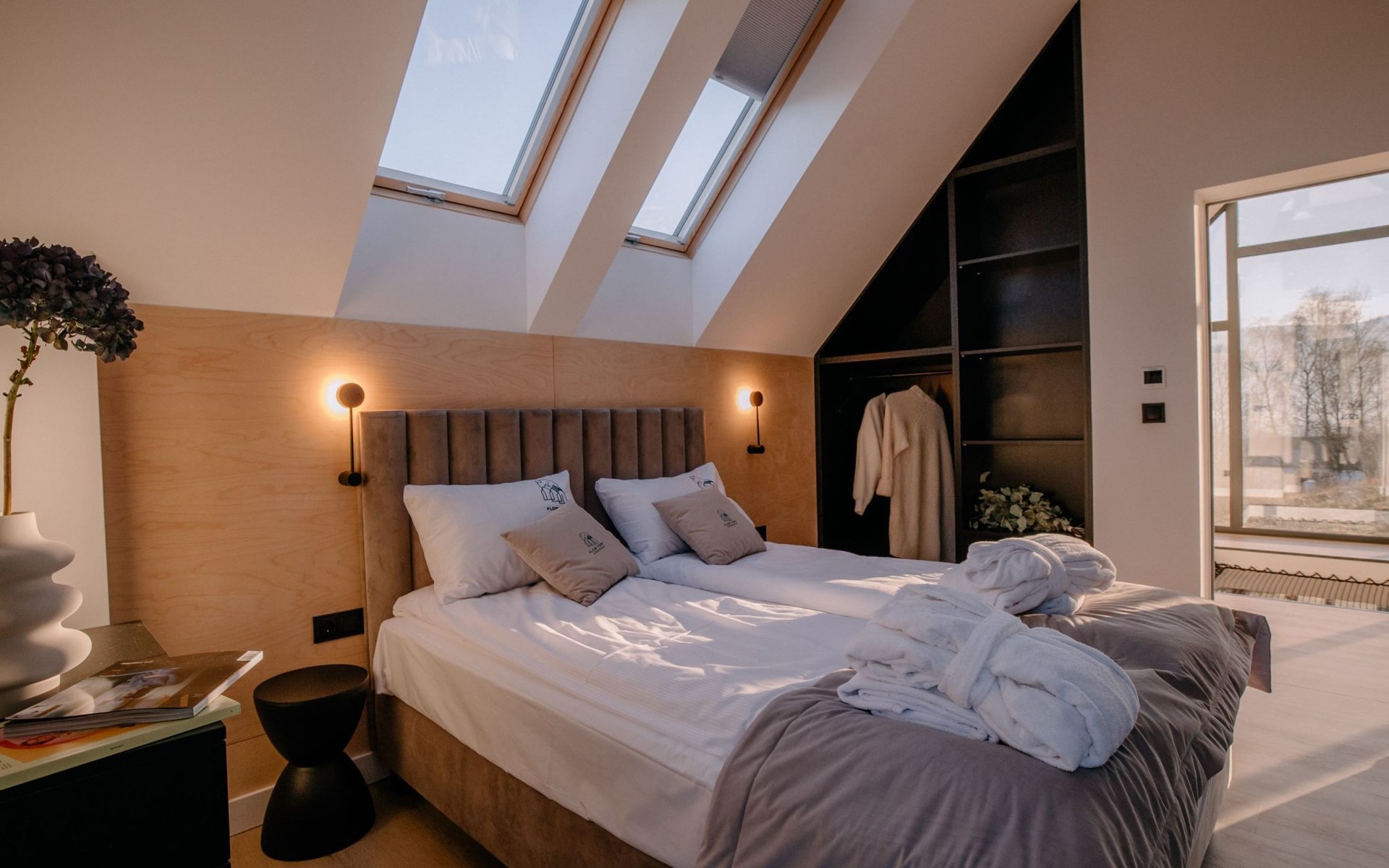 Das Innere jedes Ferienhauses ist mit Komfort und Luxus ausgestattet. Für eine angenehme Nachtruhe sorgen Betten in Hotelqualität: Im Hauptschlafzimmer und im zweiten Schlafzimmer stehen Doppelbetten (160×200 cm), im Wohnzimmer ein Schlafsofa (150×200 cm, für zwei Personen) und für eine weitere Person ein ausklappbares Hotelbett (90×200 cm). Für die kleinsten Gäste stehen zwei Reisebetten (60×120 cm) zur Verfügung. Jedes Cottage ist mit einem Smart-TV und kostenlosem WiFi ausgestattet, um Unterhaltung und Komfort in Reichweite zu haben.