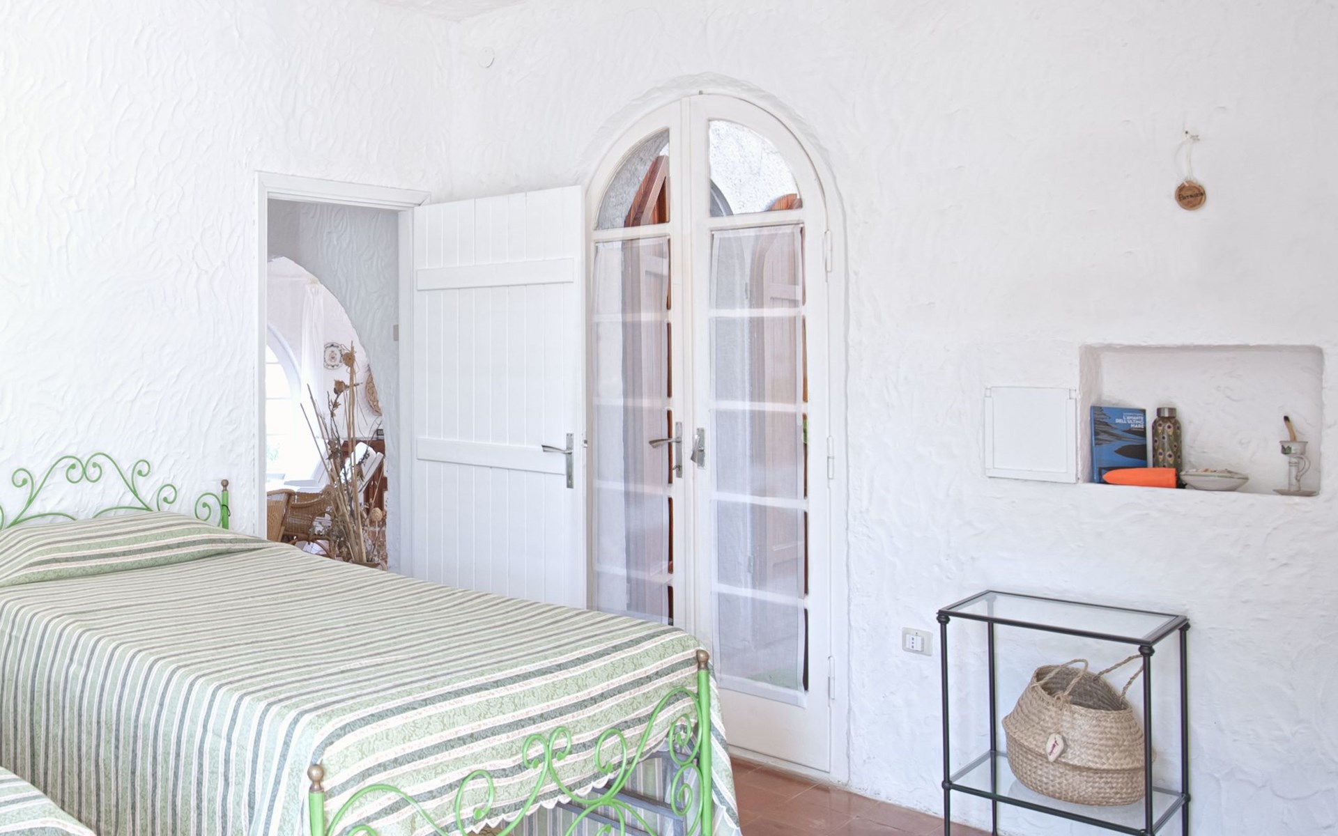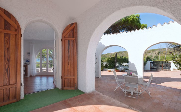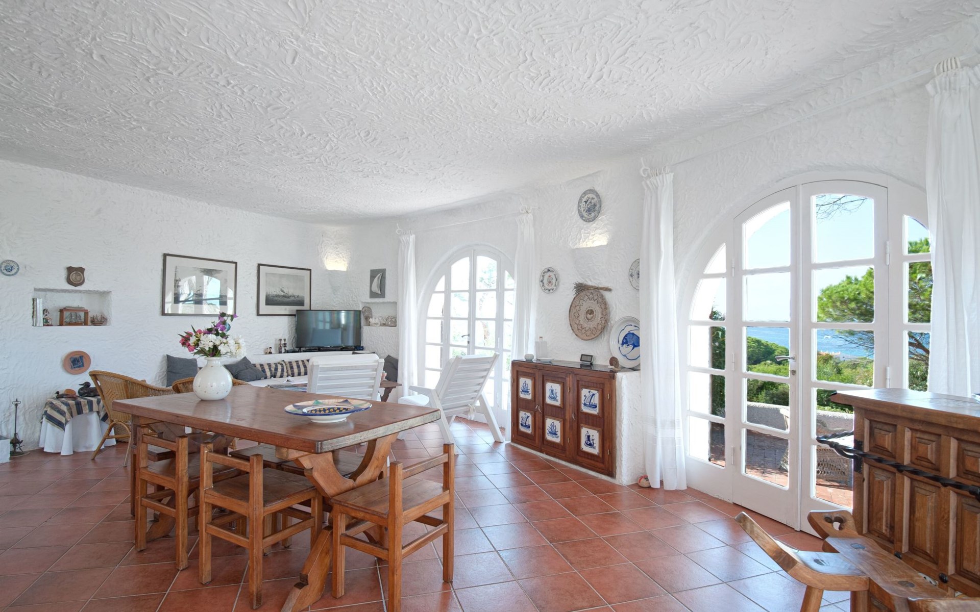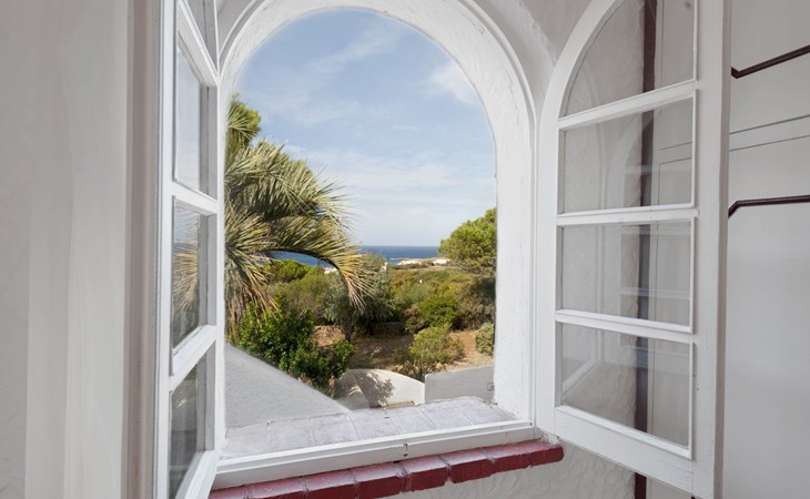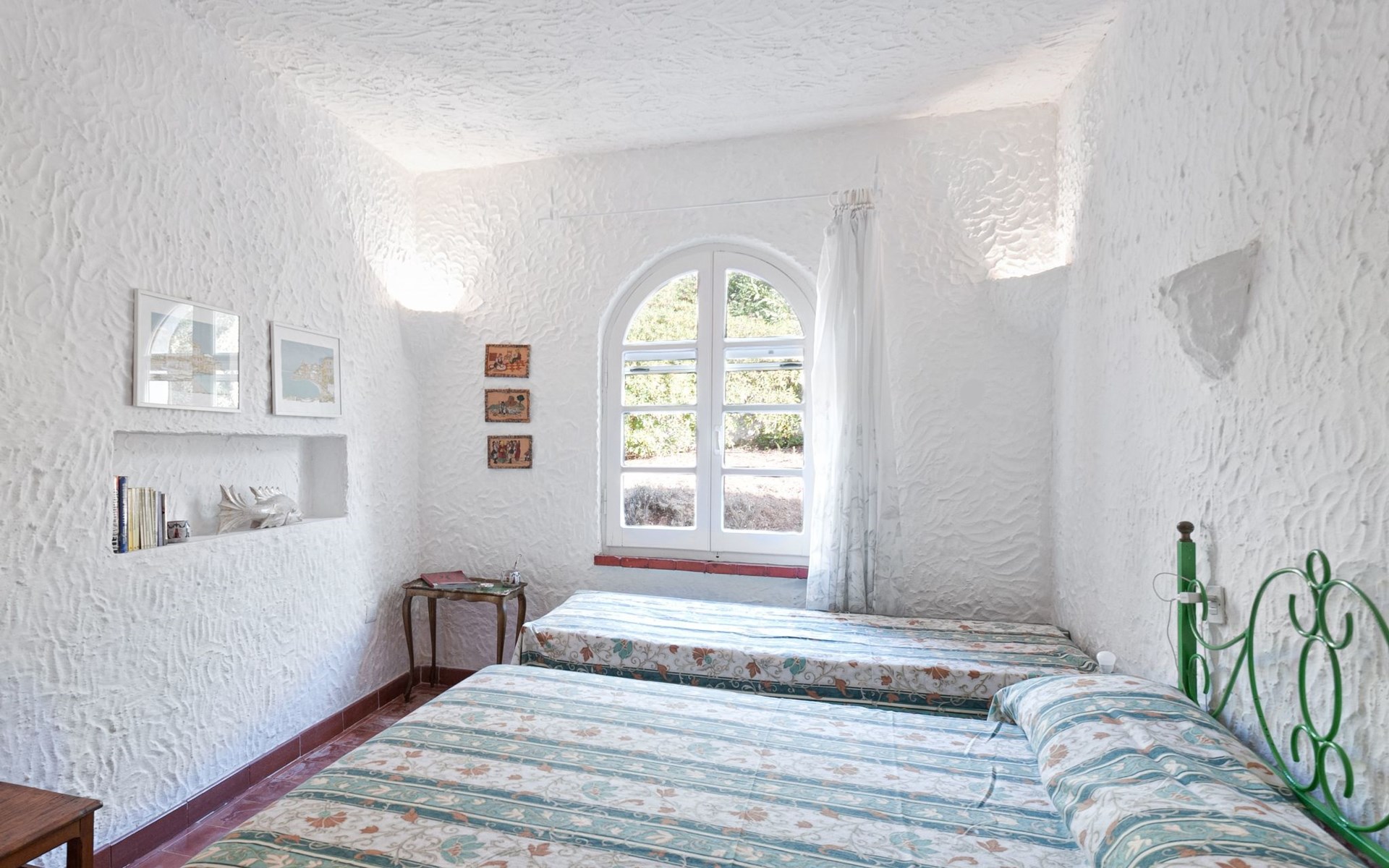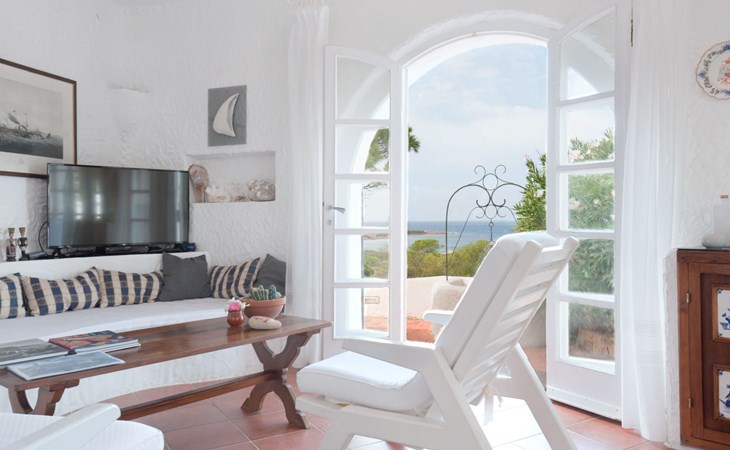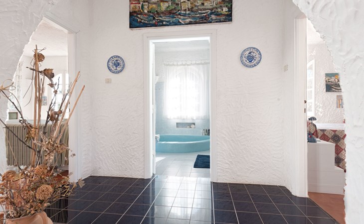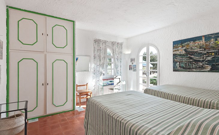 Der runde Mittelteil beherbergt das große Wohnzimmer mit drei Panoramafenstern, die auf die Bucht blicken, zwei Schlafzimmer, eines mit einem Doppelbett, das andere mit zwei Einzelbetten, und ein großes Bad. Die Einrichtung spiegelt die Epoche wider, die Betten sind aus Schmiedeeisen und die Fliesen im ganzen Haus sind original sardische Keramik.