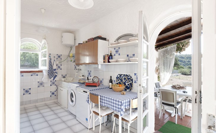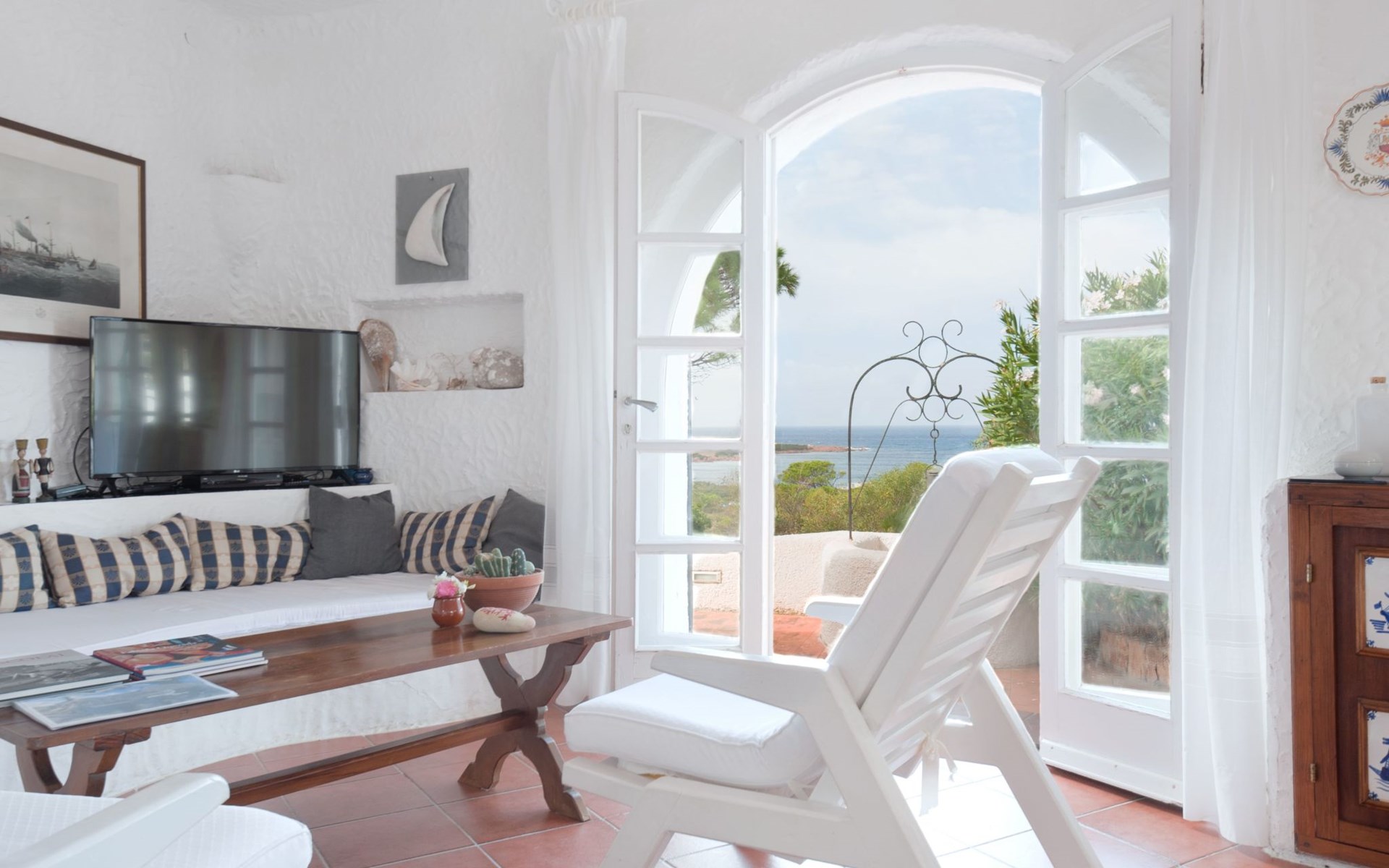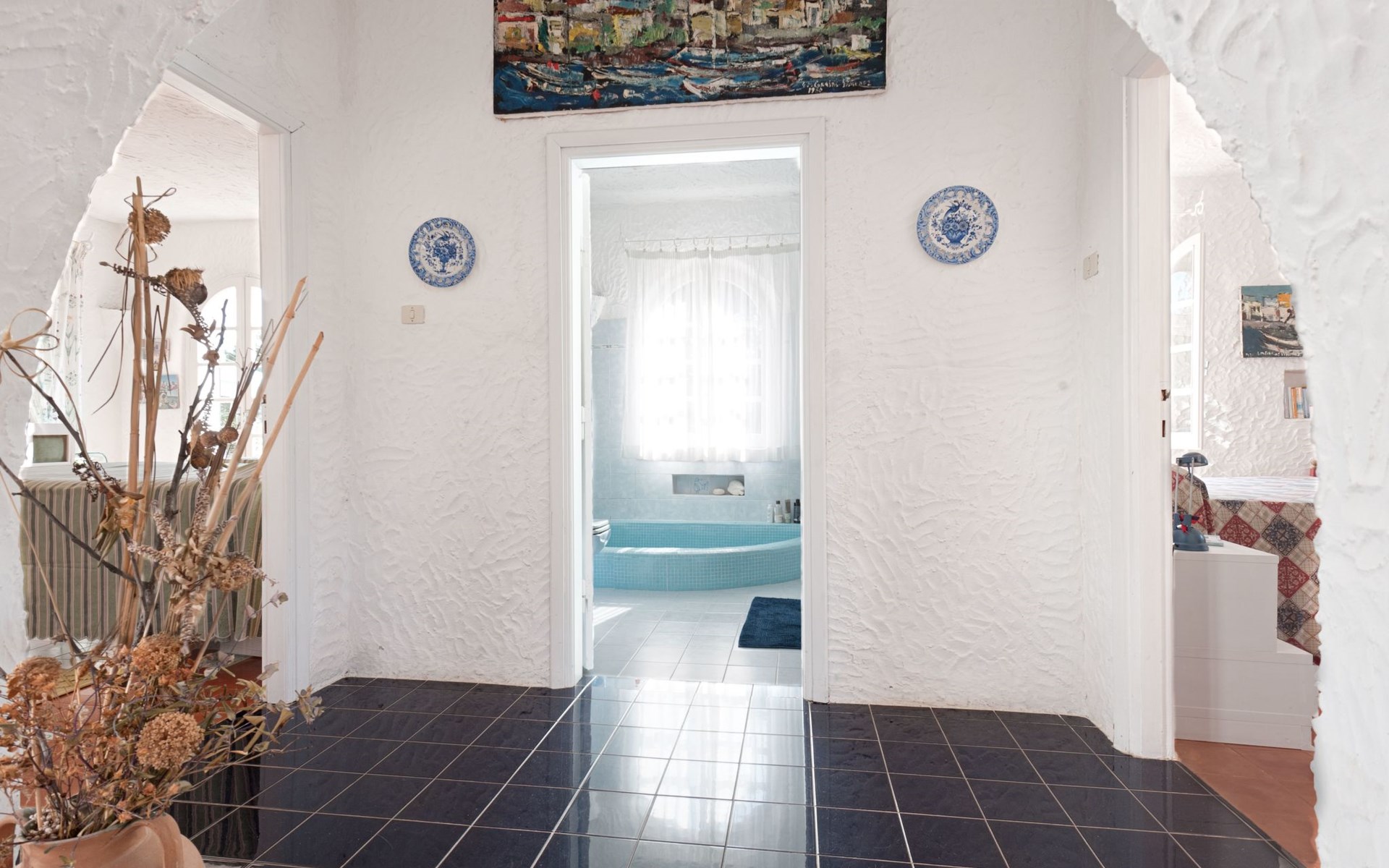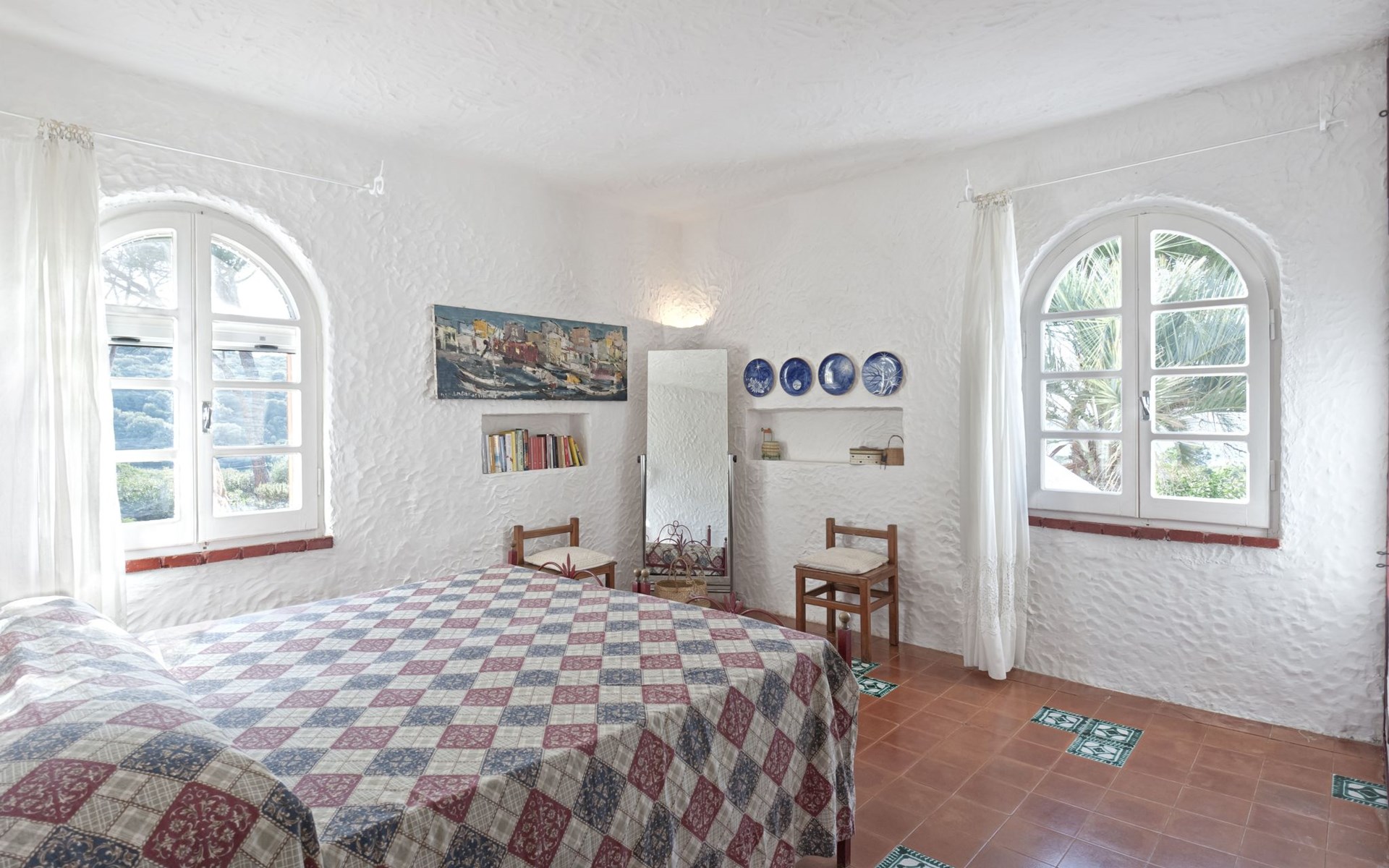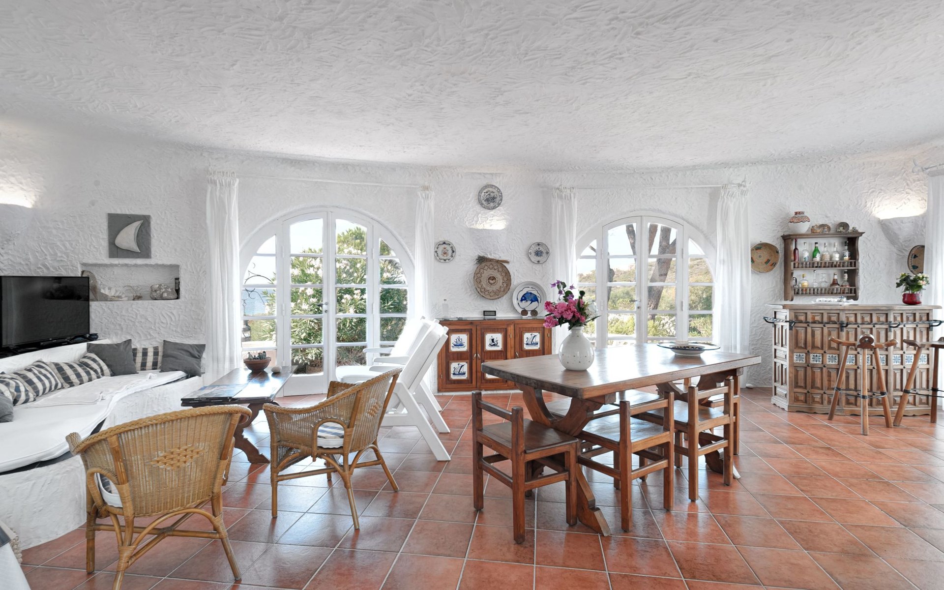 Der runde Mittelteil beherbergt das große Wohnzimmer mit drei Panoramafenstern, die auf die Bucht blicken, zwei Schlafzimmer, eines mit einem Doppelbett, das andere mit zwei Einzelbetten, und ein großes Bad. Die Einrichtung spiegelt die Epoche wider, die Betten sind aus Schmiedeeisen und die Fliesen im ganzen Haus sind original sardische Keramik.