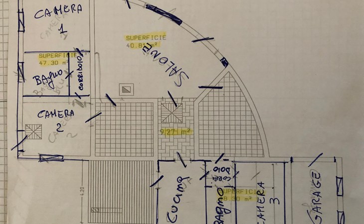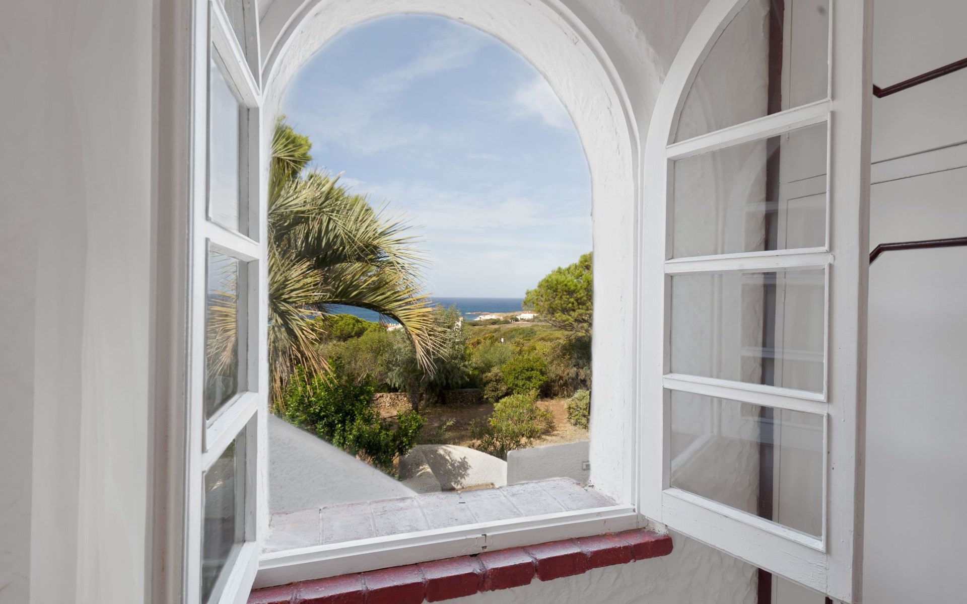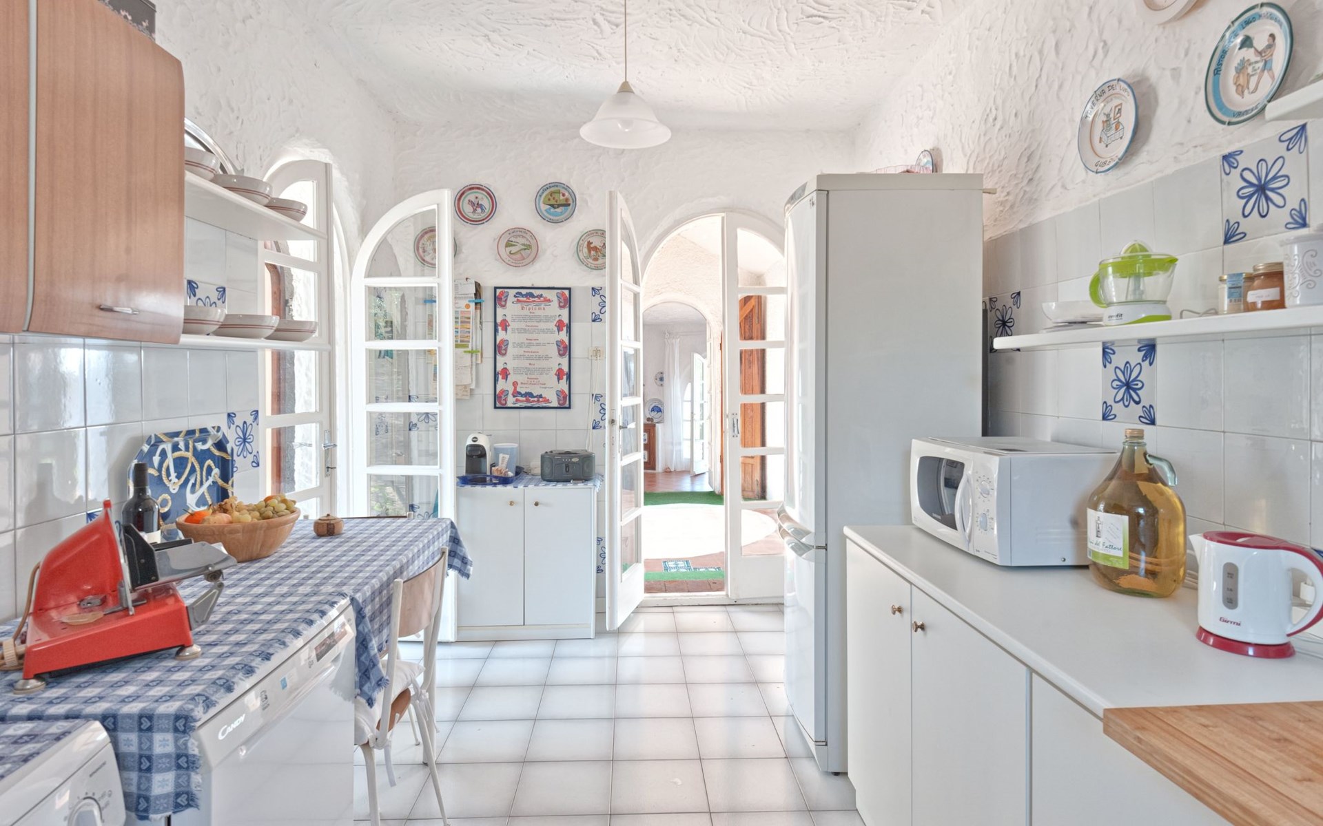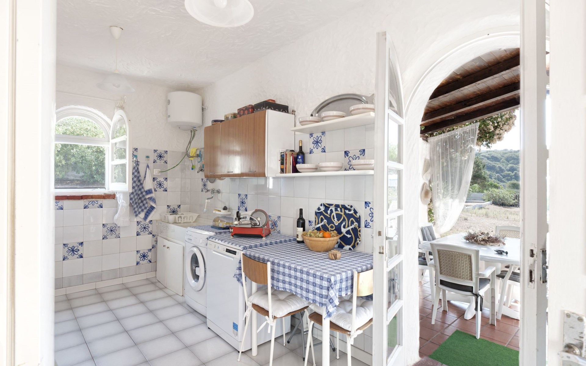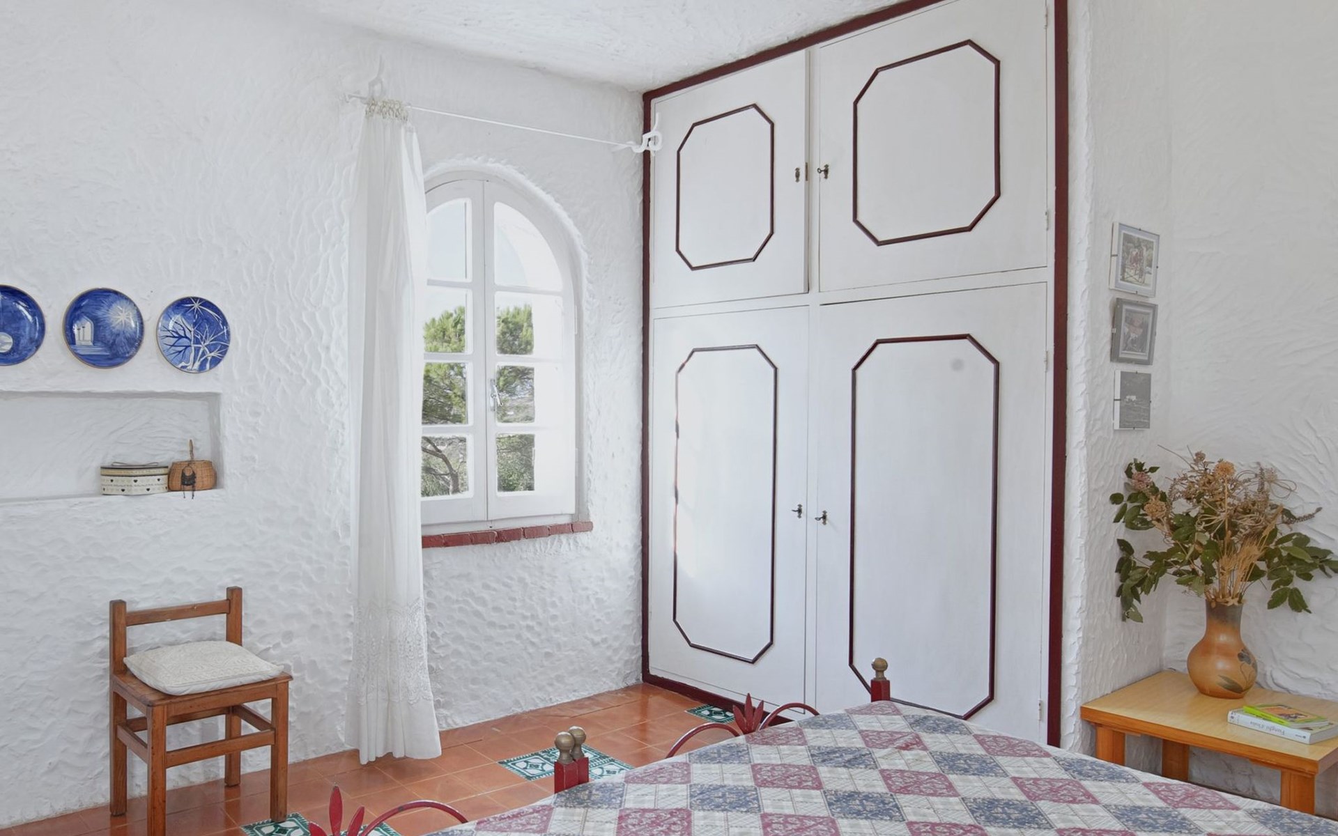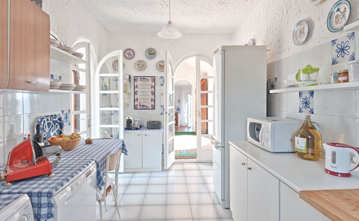 Der runde Mittelteil beherbergt das große Wohnzimmer mit drei Panoramafenstern, die auf die Bucht blicken, zwei Schlafzimmer, eines mit einem Doppelbett, das andere mit zwei Einzelbetten, und ein großes Bad. Die Einrichtung spiegelt die Epoche wider, die Betten sind aus Schmiedeeisen und die Fliesen im ganzen Haus sind original sardische Keramik.