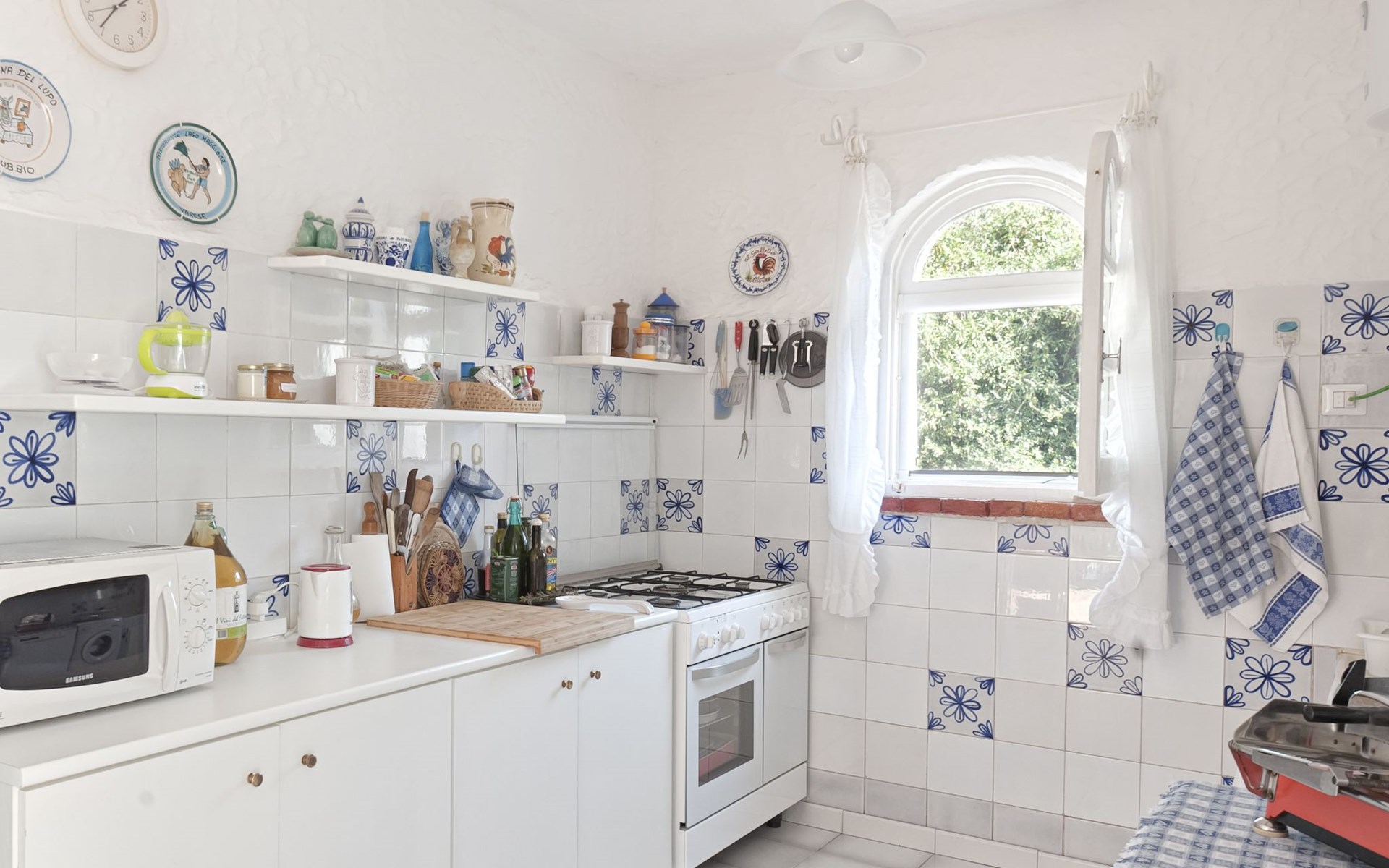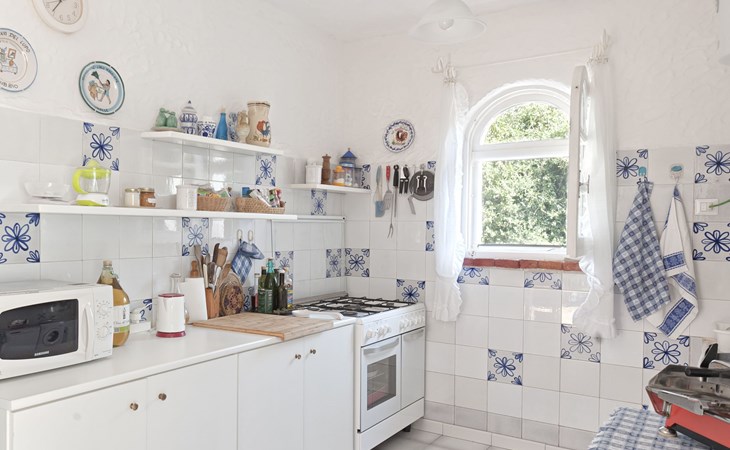 Gasherd, Elektroherd, Mikrowelle und elektrischer Backofen, Kühlschrank mit Gefrierfach, Geschirr, Wasserkocher, Toaster, Saftpresse, Küchenhandtücher, Grundtischwäsche, Waschmaschine, Geschirrspüler, Grill, Gartenbeleuchtung, Rauchmelder in den Küchen, Feuerlöscher, Klimaanlage in einem Zimmer und im Hauptgebäude