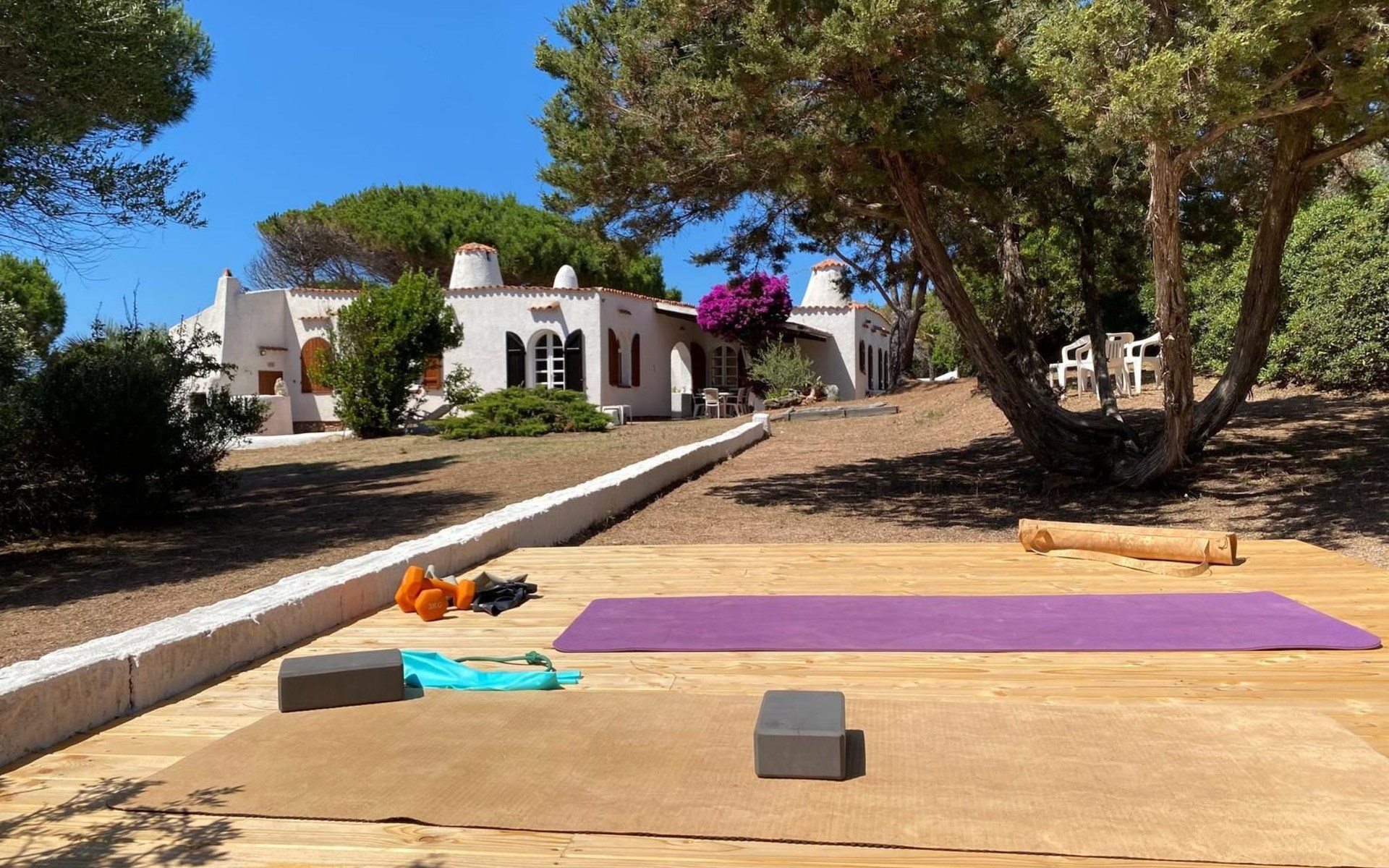 In einer abgelegenen Ecke des Gartens gibt es eine hölzerne Plattform, auf der Sie Yoga, Pilates, Gymnastik oder Meditation praktizieren können: Matten, Blöcke, elastische Bänder sind nur für den persönlichen Gebrauch und auf eigene Gefahr zur Verfügung gestellt. Innerhalb des Gartens gibt es sowohl überdachte als auch nicht überdachte Parkmöglichkeiten.
