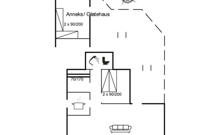 Einfamilienhaus, Baujahr 1960. 1.5 km vom Meer. Zur Alleinbenutzung: naturbelassenes Grundstück 800 m2. Terrasse (50 m2), Kinderspielplatz (Schaukel). Im Hause: Waschmaschine. Parkplatz beim Haus. Lebensmittelgeschäft 200 m. Der Besitzer akzeptiert keine Jugendgruppen.
