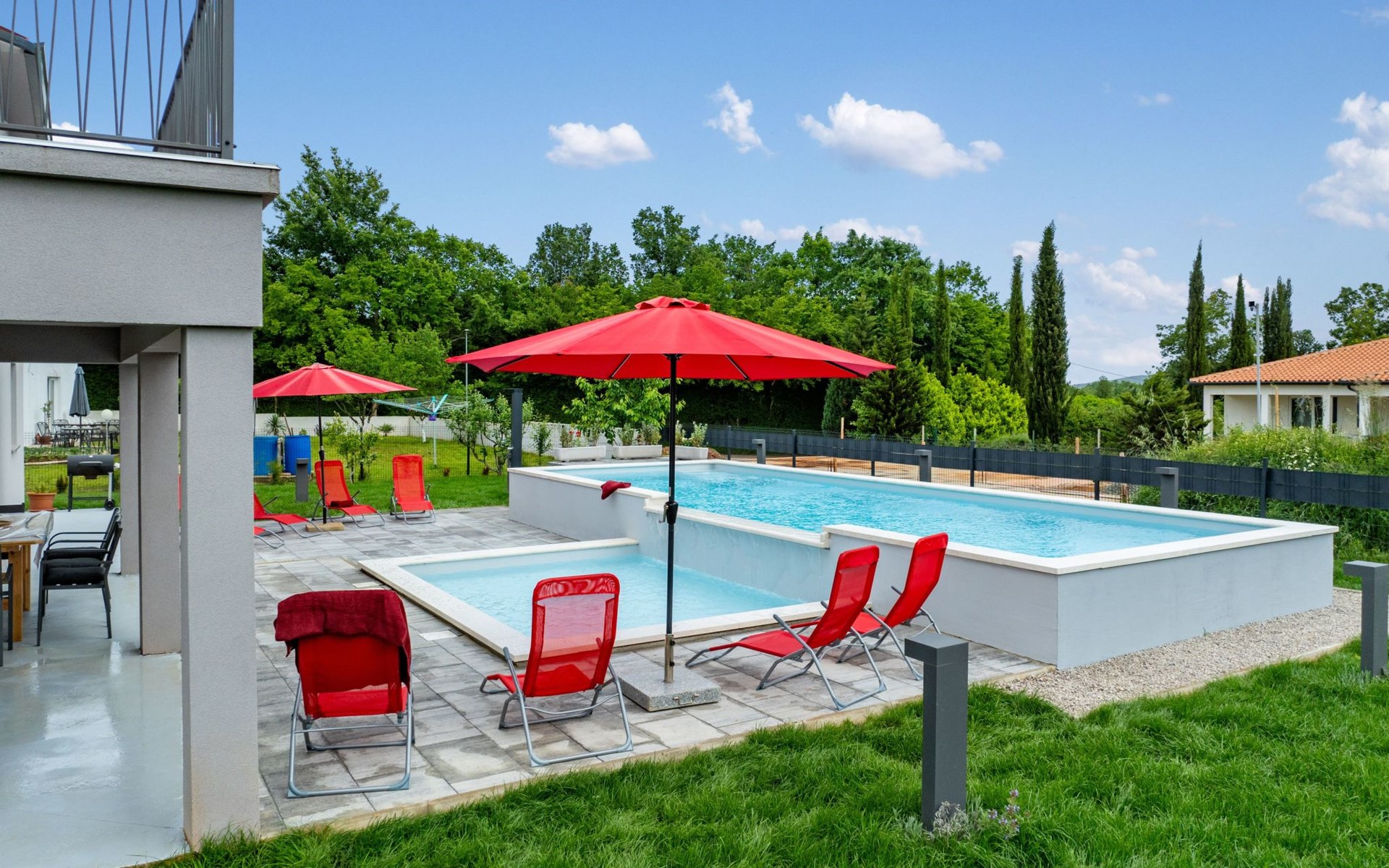 Der großzügige Garten mit Pool ist ein wahres Paradies für Kinder und Erwachsene. Ein Garten mit Pool, Trampolin, Sandkasten, Schaukel und Fußballtoren sorgen für endlosen Spaß und Abenteuer für Gross- und Klein.Genießen Sie gemütliche Grillabende auf der überdachten Terrasse, während Ihre Kinder oder Freunde sich im Garten oder im Pool austoben.