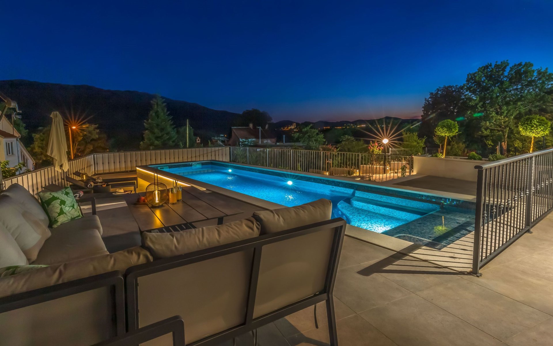 Der Außenbereich von 3500 m² verfügt über einen privaten Swimmingpool von 3,5 x 12 m mit großzügiger Sonnenterrasse und 8 Liegestühlen am Pool. Es gibt auch eine Außendusche. Neben der Villa gibt es Einrichtungen für Kinder, einen Sandkasten für Kinder, eine Schaukel. Die Villa hat auch einen Außengrill, vor dem sich ein überdachter Esstisch mit Stühlen für 8 Personen befindet. (neben Wohnzimmer und Esszimmer im Erdgeschoss). Privater Basketball-, Fußball- und Tennisplatz.