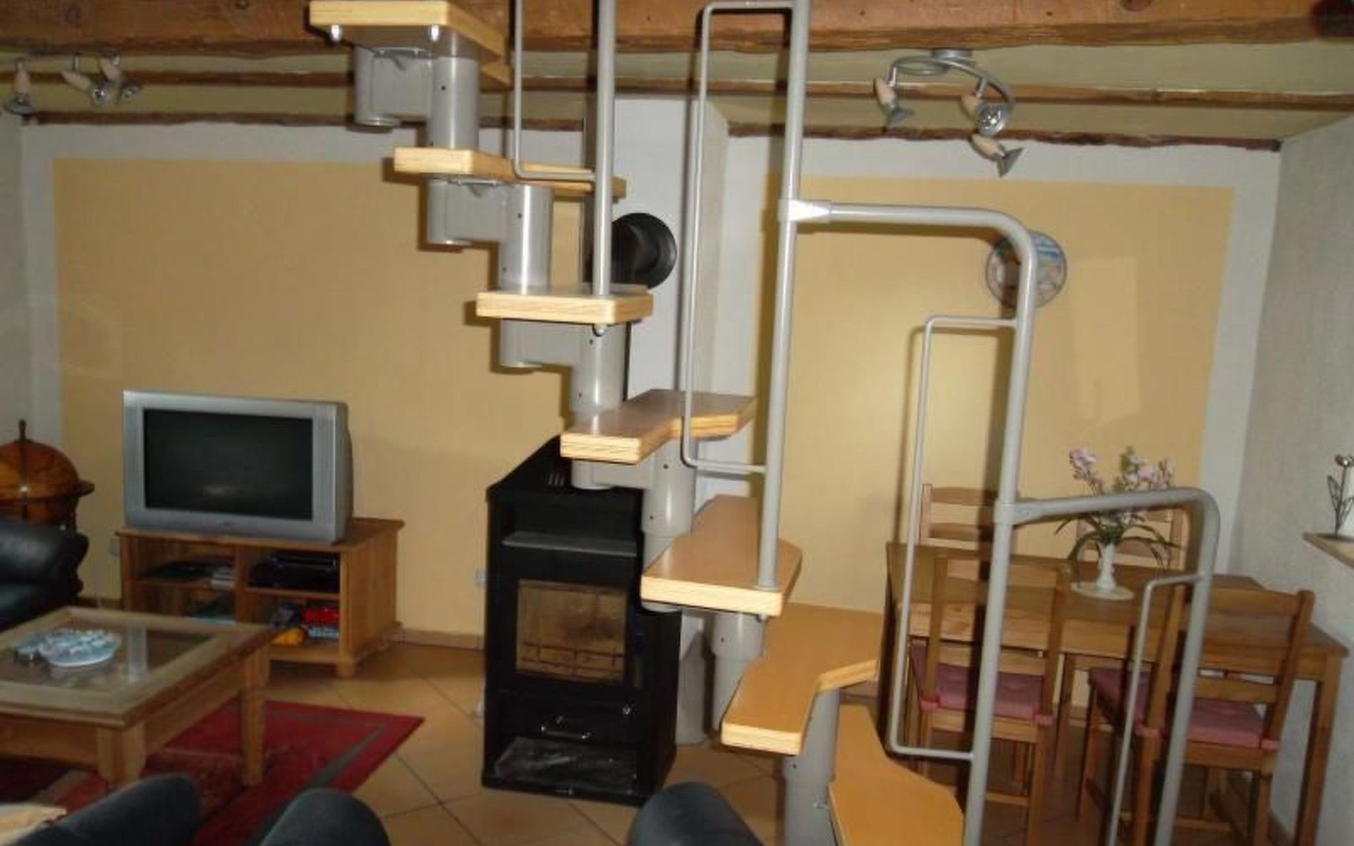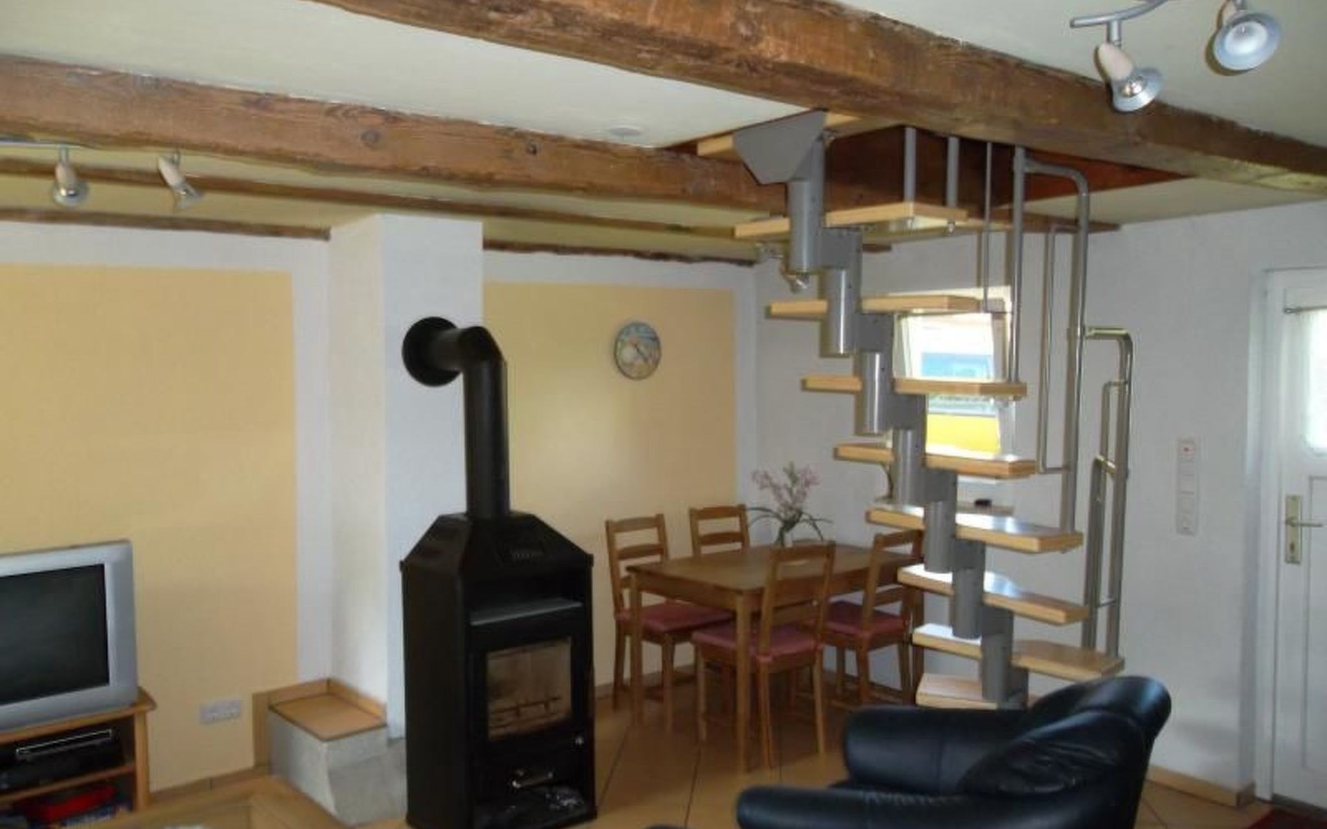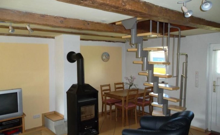 Im Erdgeschoß befindet sich der offene Wohn- / Essbereich. Sowie die angeschlossene offene Küche mit Herd, Backofen, Wasserkocher, Kaffeemaschine und Toaster. Im Wohnbereich finden Sie einen gemütlichen Fernsehbereich mit Sofas und Kaminofen vor.