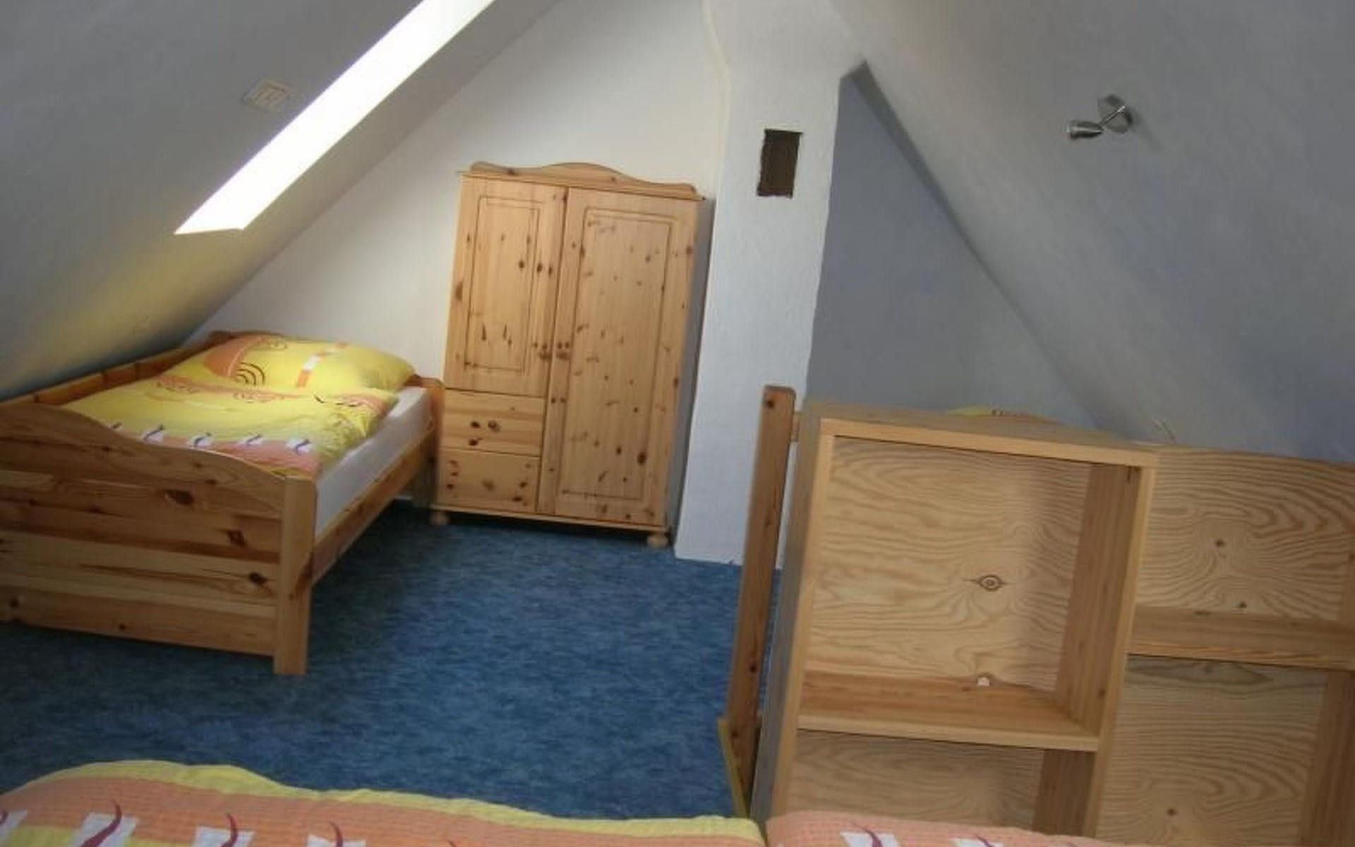 Zu dem Schlafraum mit einem Doppelbett und zwei Einzelbetten kommen Sie über eine Raumspartreppe aus dem Wohn- / Essbereich.