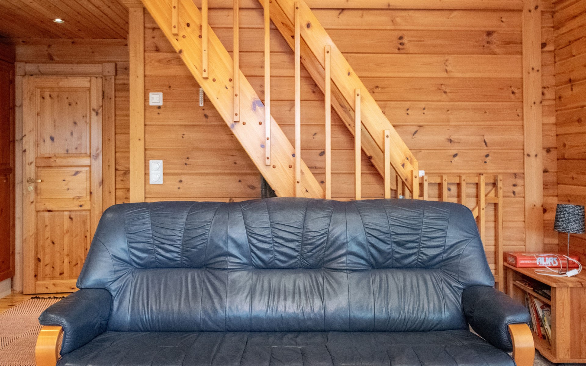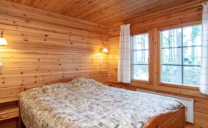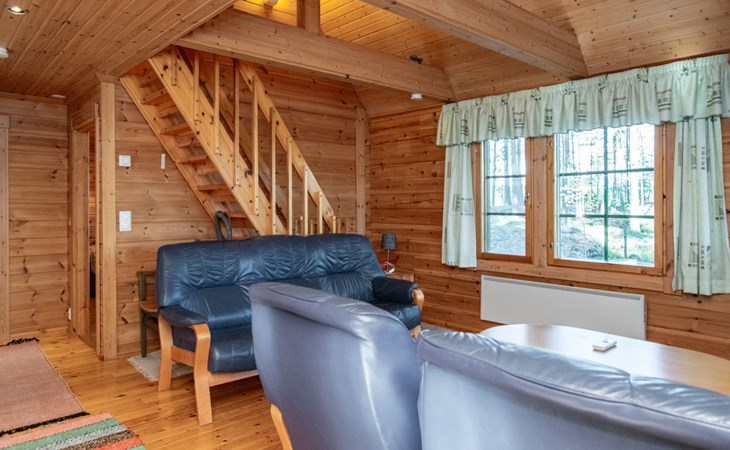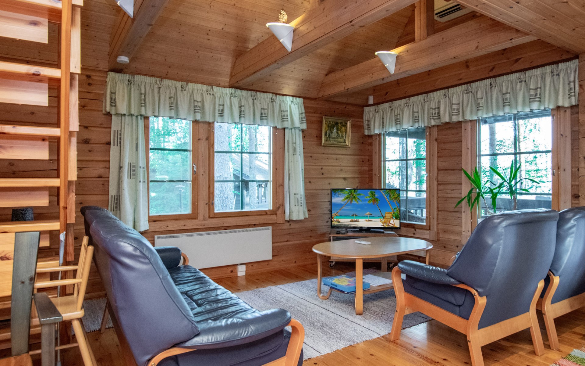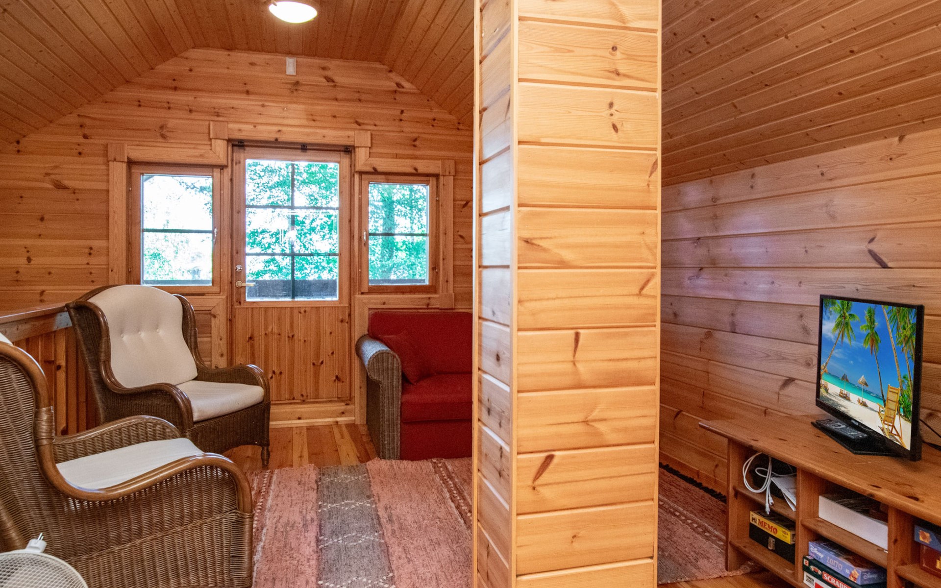Log cottage 2001, living room, kitchen, double bed in the bedroom, two beds in the second bedroom, shower and toilet in the bathroom, covered porch. Upstairs hall, balcony, double bed in the bedroom, baby gate downstairs and upstairs.