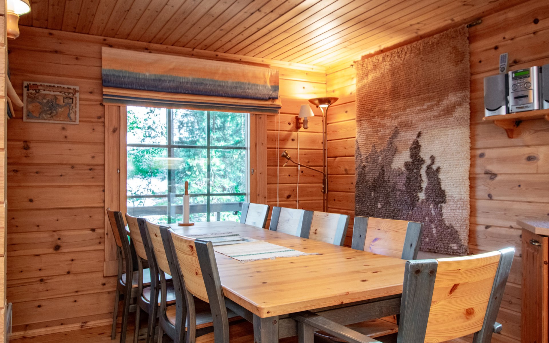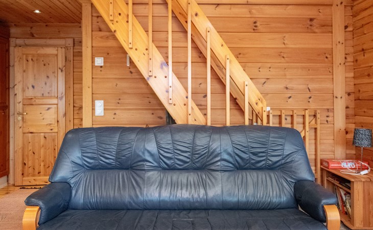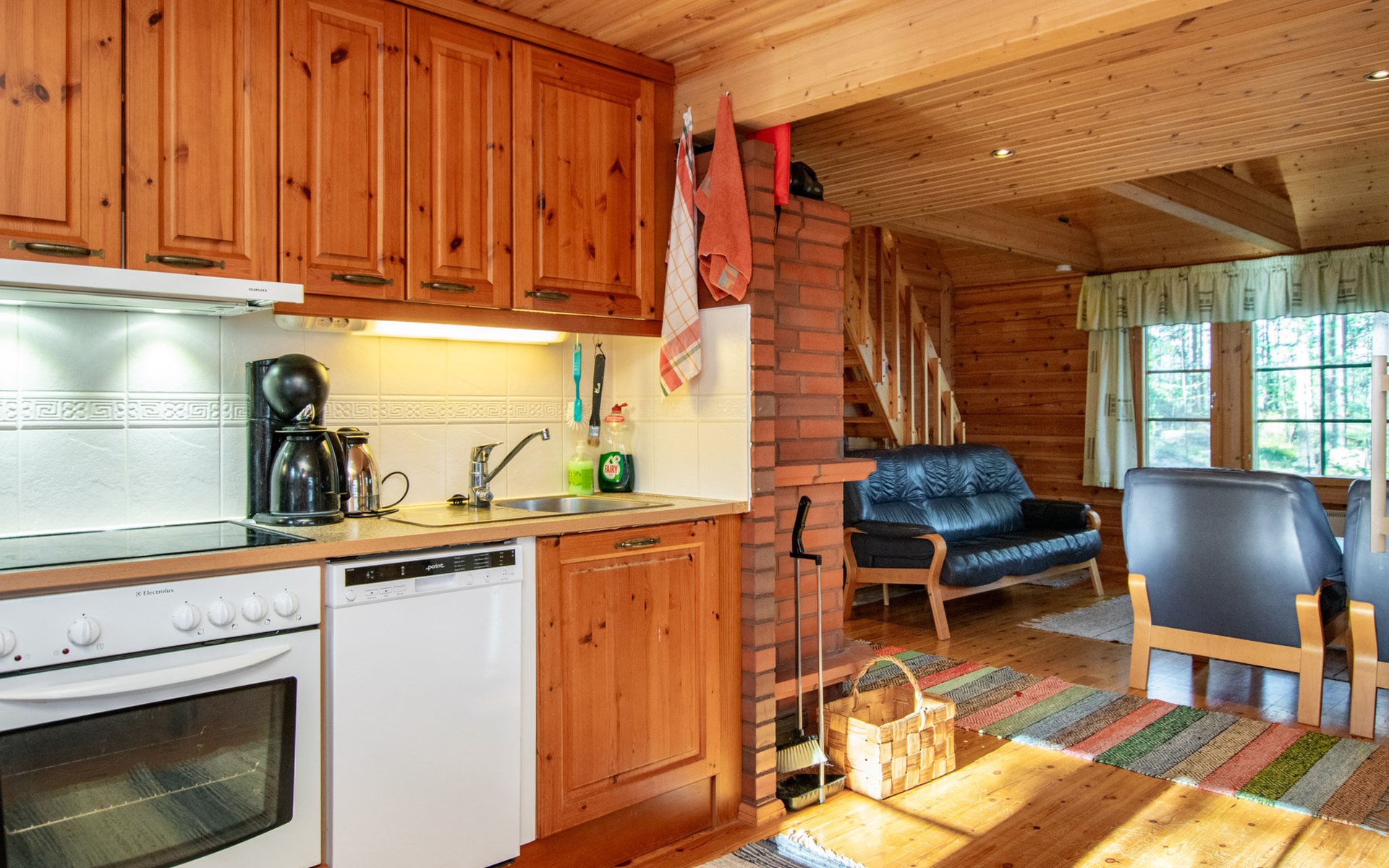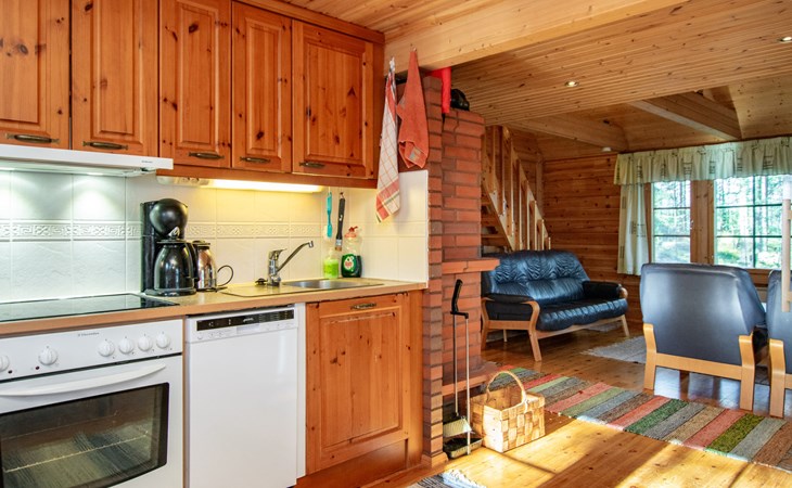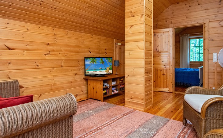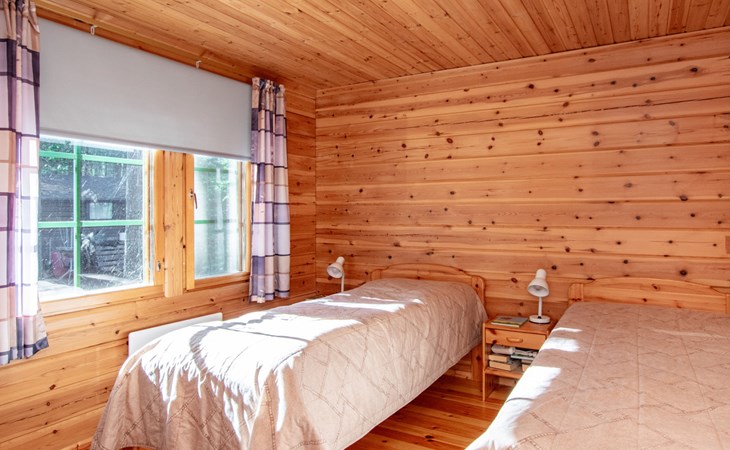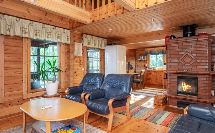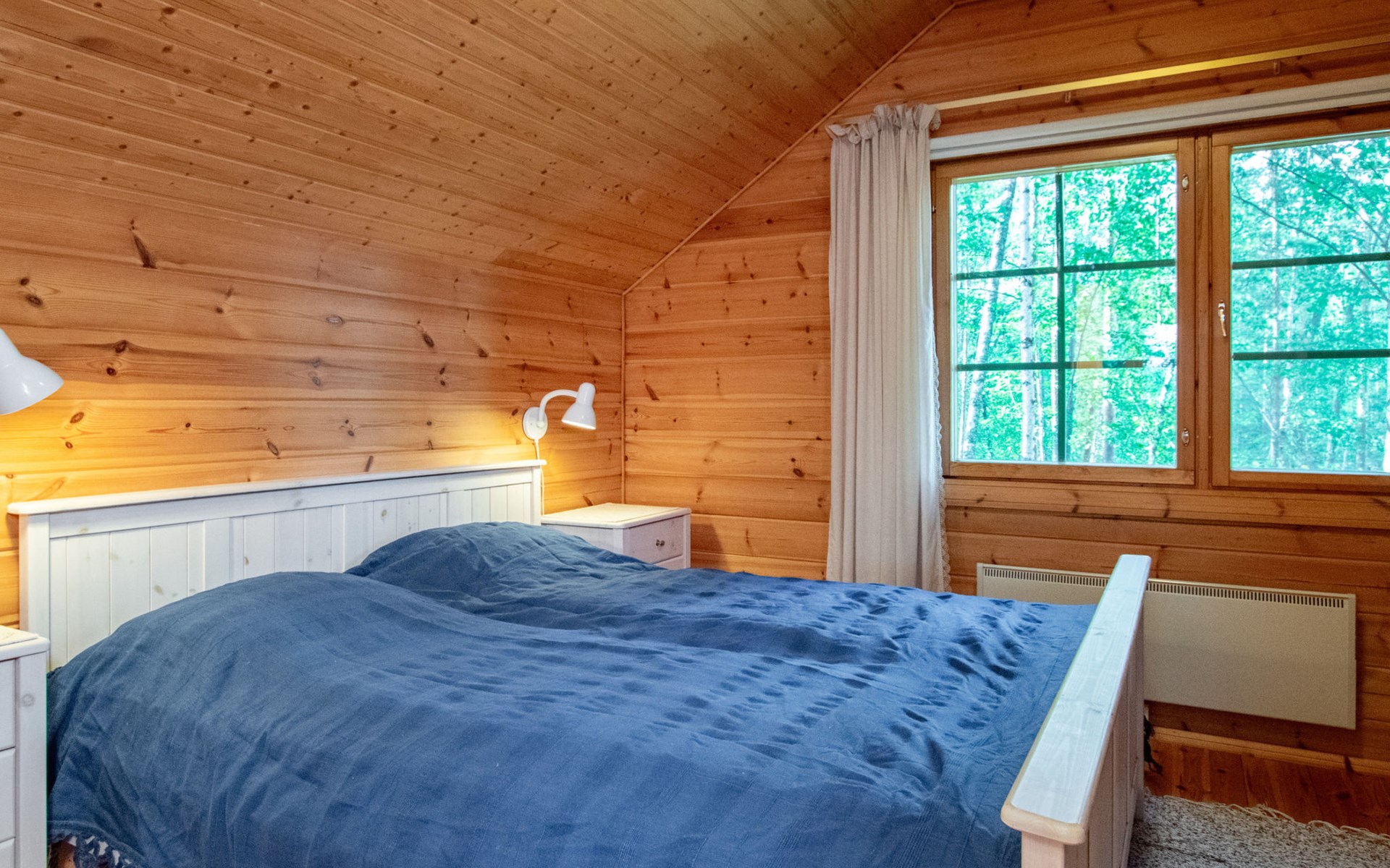Log cottage 2001, living room, kitchen, double bed in the bedroom, two beds in the second bedroom, shower and toilet in the bathroom, covered porch. Upstairs hall, balcony, double bed in the bedroom, baby gate downstairs and upstairs.