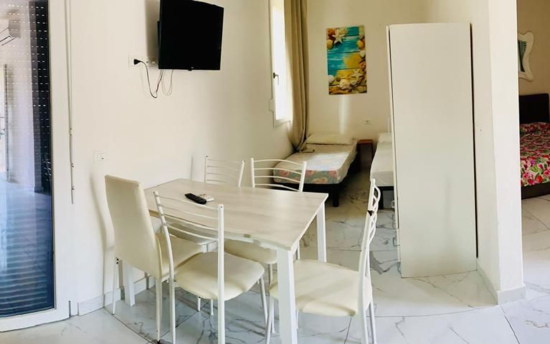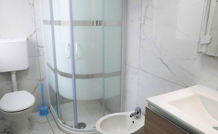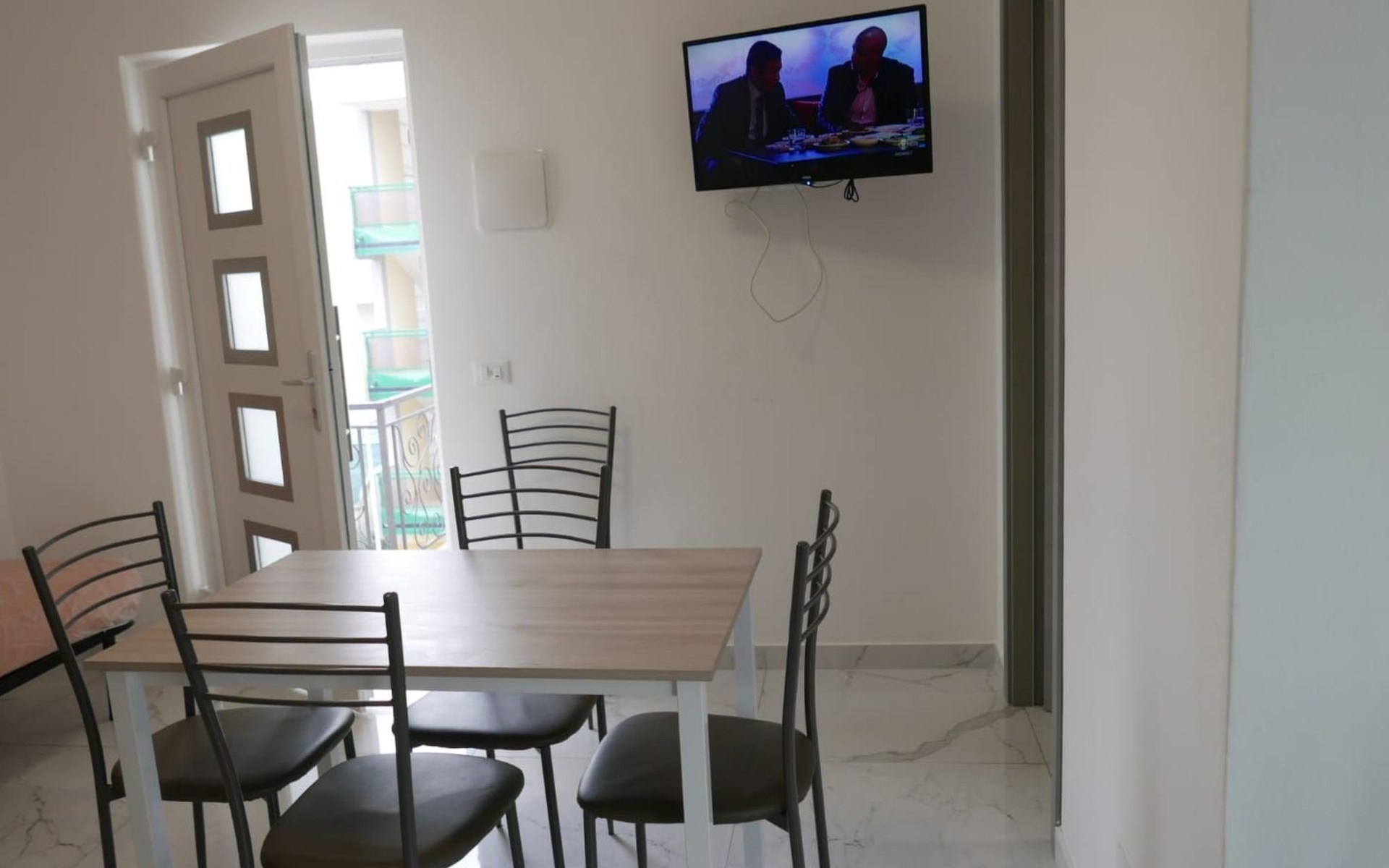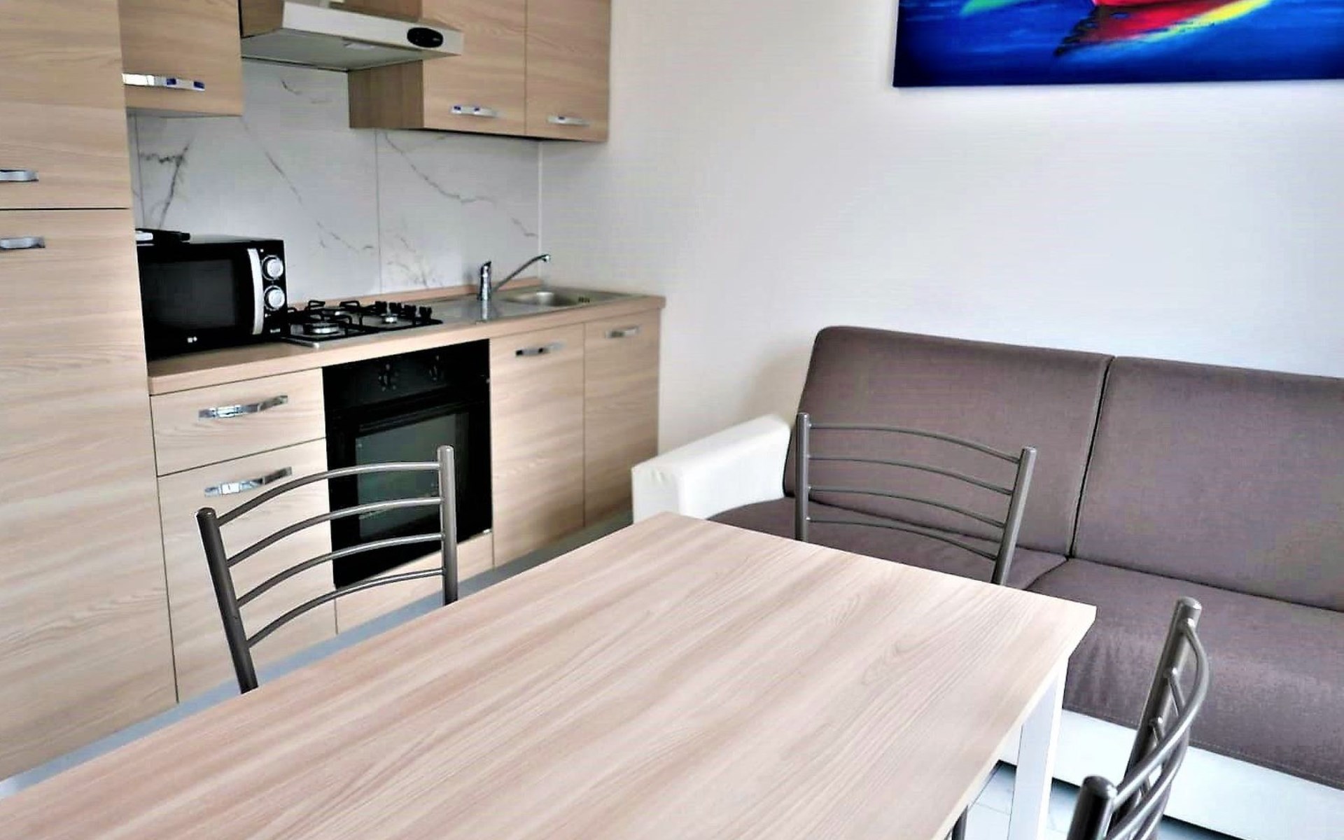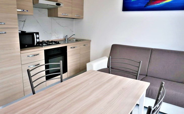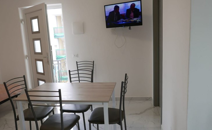 Die im zweiten Stock gelegene Wohnung öffnet sich zu einem hellen Wohnbereich mit Flügeltüren, die auf einen bewohnbaren Balkon führen. Der offene Raum umfasst ein Wohnzimmer mit einem Doppelschlafsofa, einen Essbereich mit einem Tisch für sechs Personen und eine offene Küche, die mit einem Kühlschrank mit separatem Gefrierfach, einem Umluftofen, einer Mikrowelle und allem notwendigen Zubehör zum bequemen Kochen ausgestattet ist.
