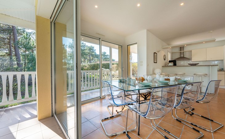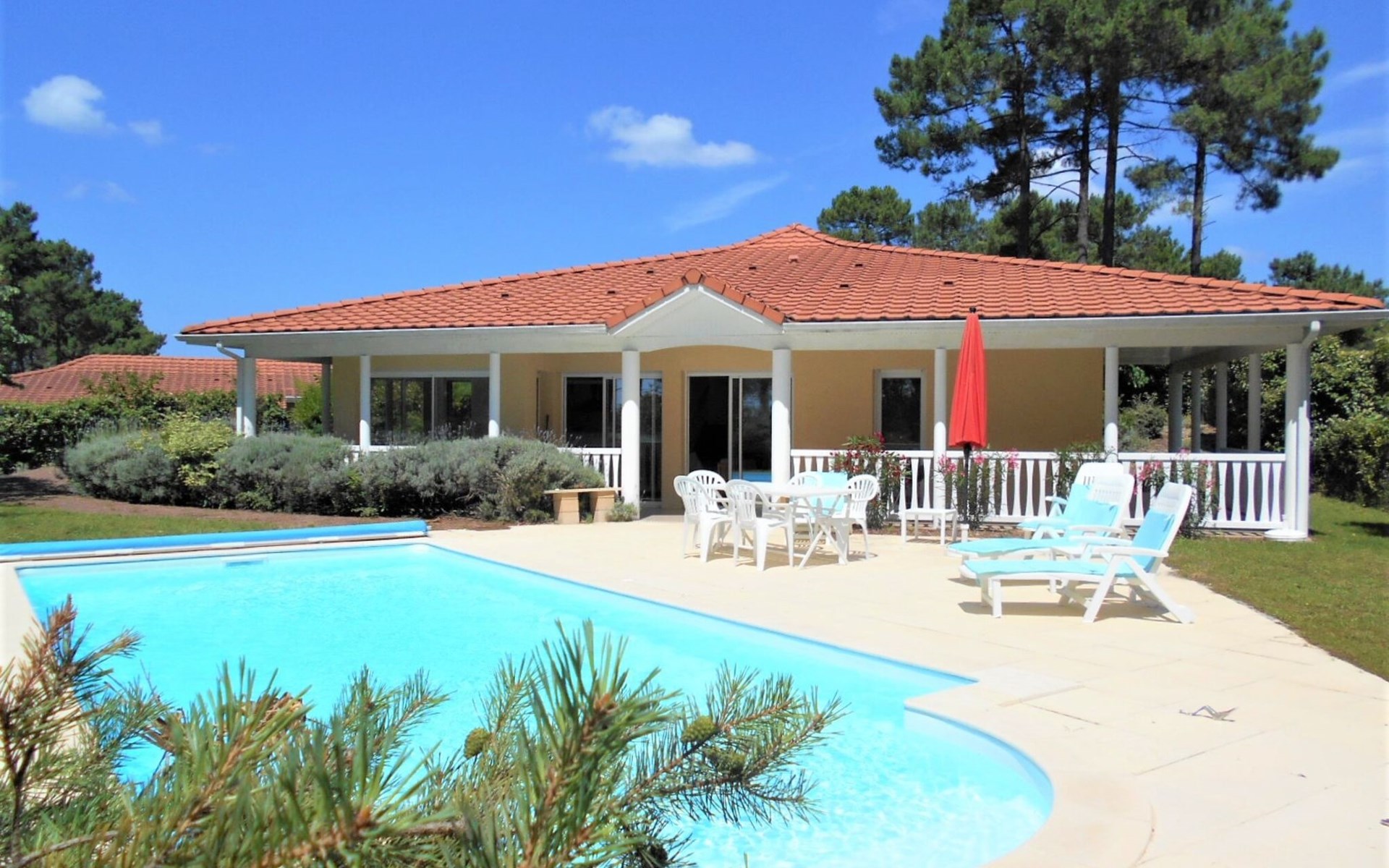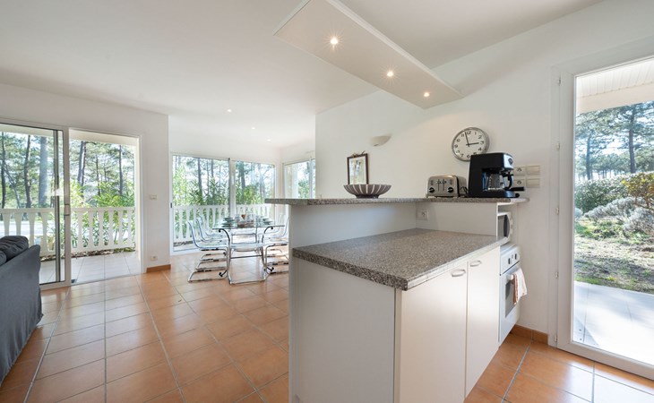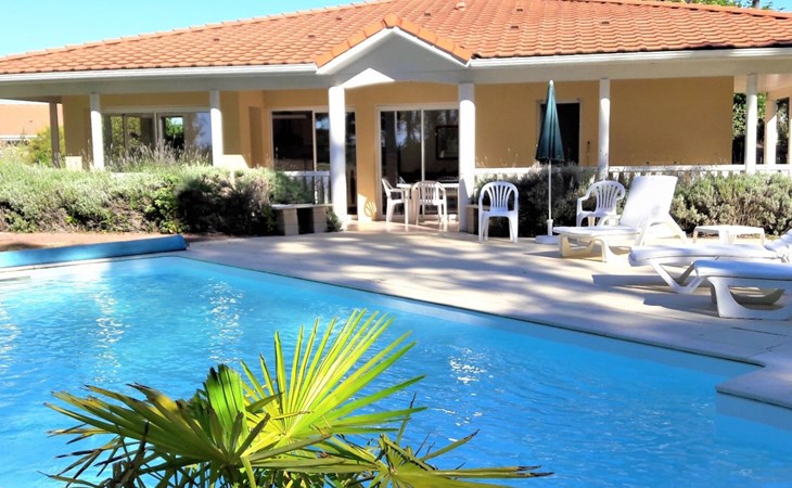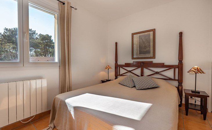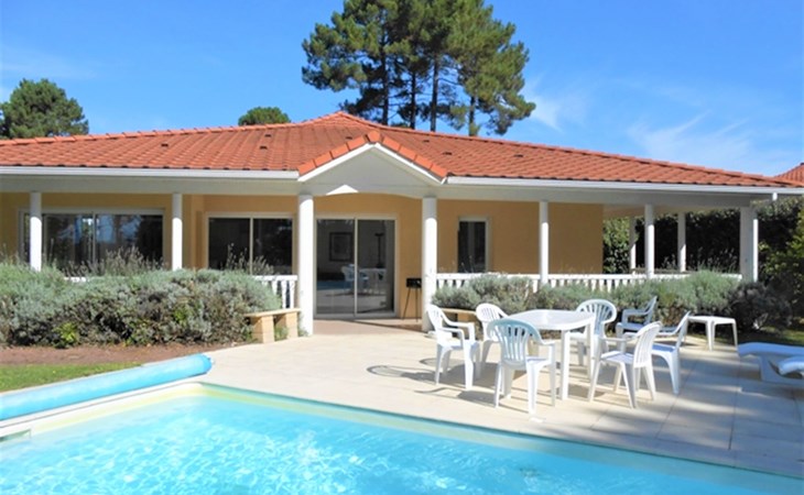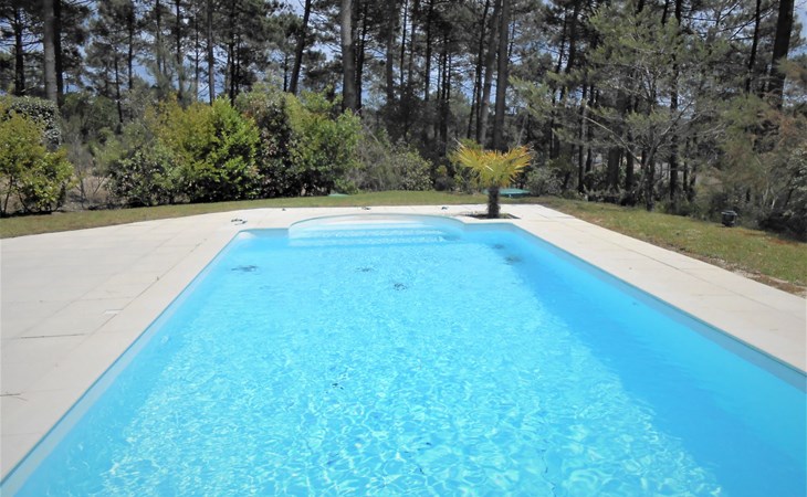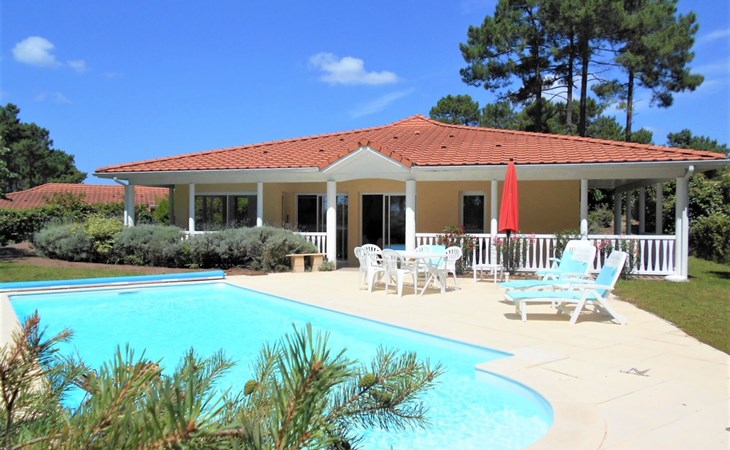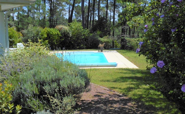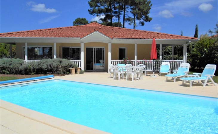 Einfamilienhaus "Eden Parc". Ausserhalb des Ortes, 2.5 km vom Zentrum, 3 km vom See. Zur Alleinbenutzung: Garten 300 m2 (eingezäunt), Schwimmbad (8 x 4 m, saisonale Verfügbarkeit: 01.Jun. - 30.Sep.) mit Alarmanlage. Parkplatz auf dem Grundstück. Einkaufsgeschäft 2.5 km, Lebensmittelgeschäft 2.5 km, Supermarkt 4 km, Restaurant 250 m, Bushaltestelle "Le Huga" 3.2 km, Sandstrand 2.5 km. Golfplatz (18 Loch) 500 m, Tennis, Tennishalle 750 m, Reitstall 15 km. Nahe gelegene Sehenswürdigkeiten: Parcours Aventure 1 km, Dune du Pilat 60 km, Bordeaux 60 km, Saint-Emilion 60 km. Bekannte Seen in der Umgebung sind gut erreichbar: Lac du Moutchic 3 km, Maubuisson 15 km.