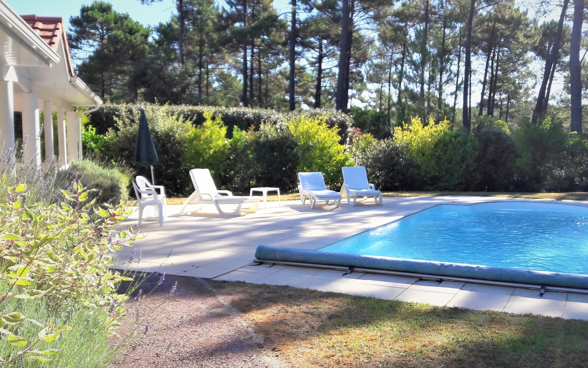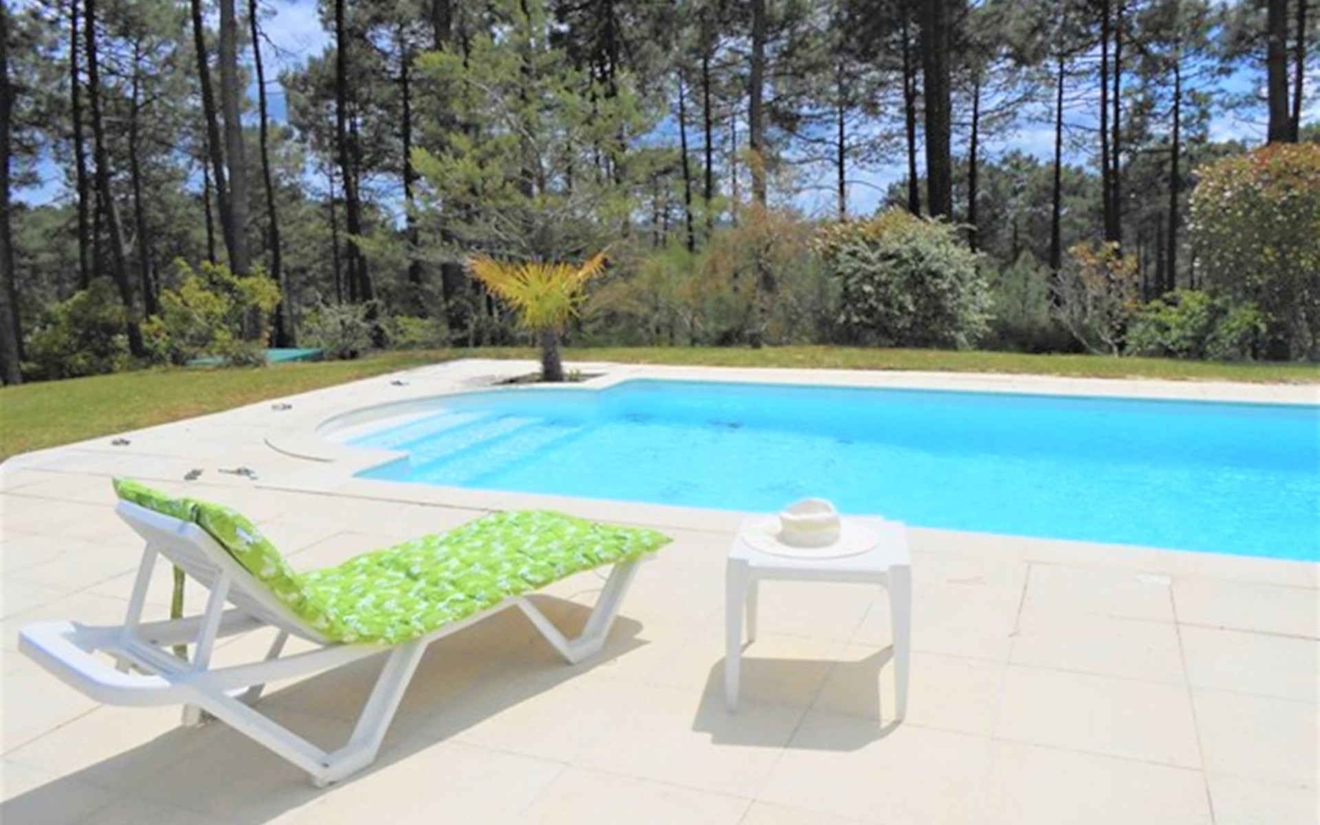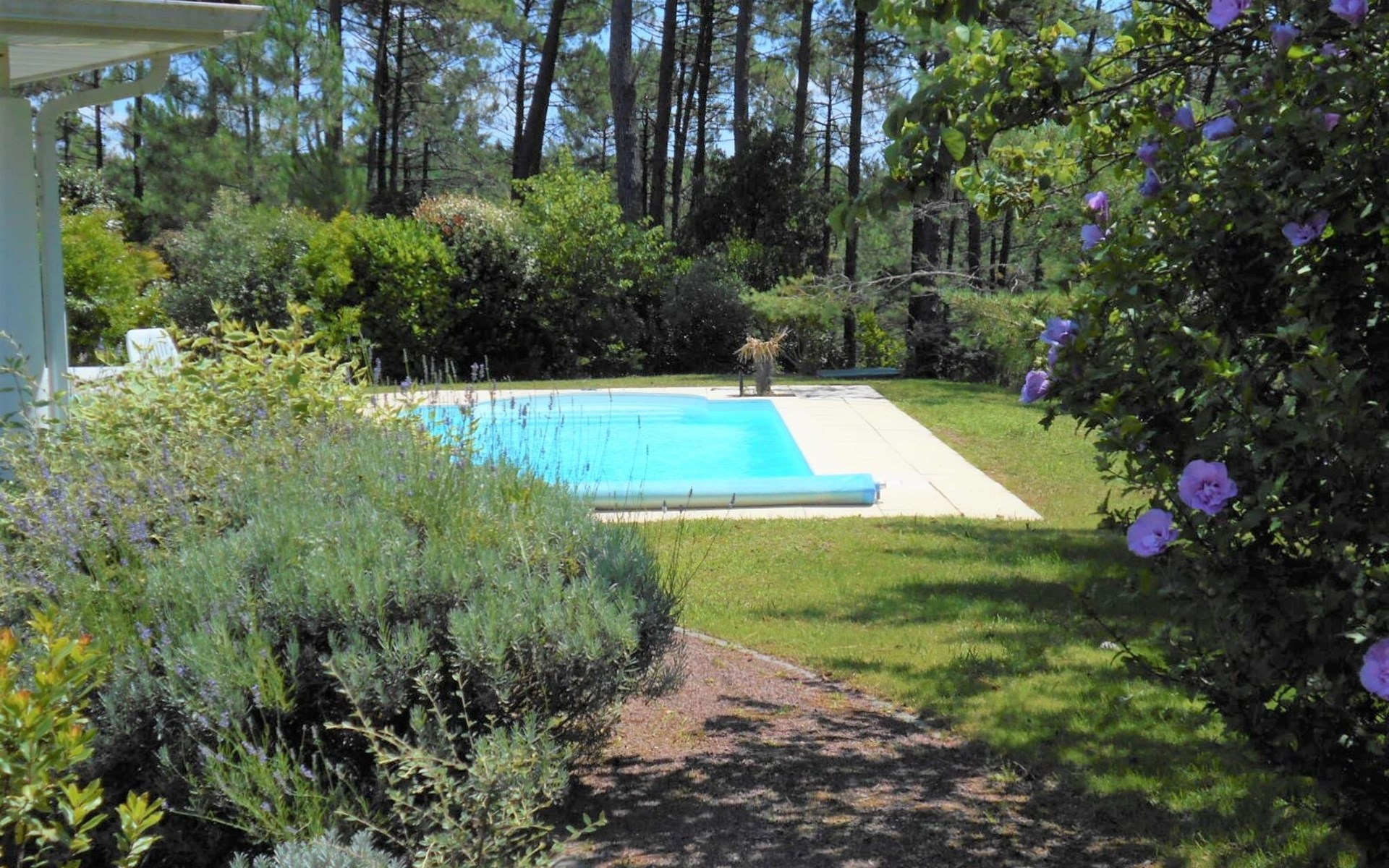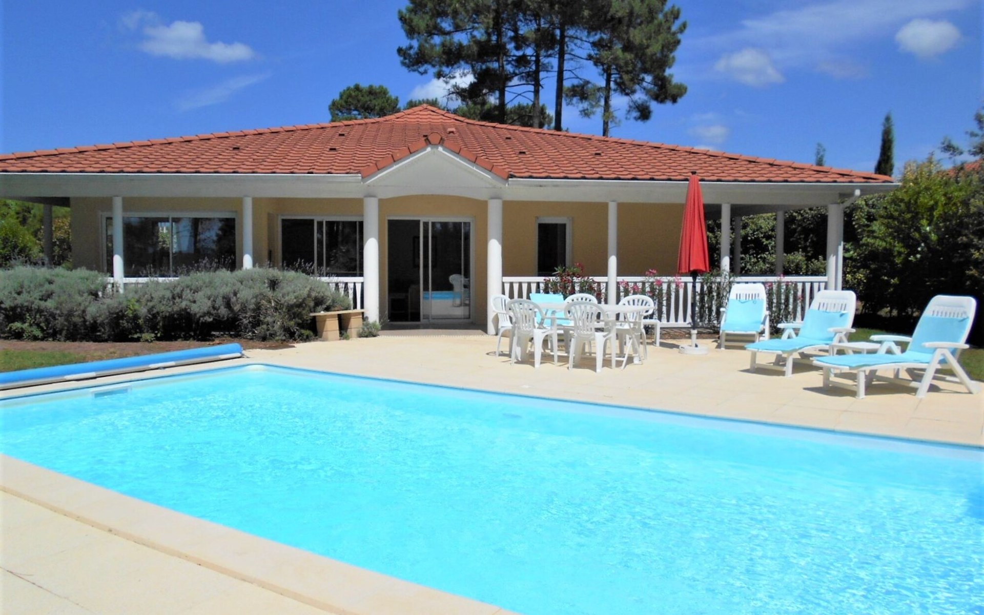 Einfamilienhaus "Eden Parc". Ausserhalb des Ortes, 2.5 km vom Zentrum, 3 km vom See. Zur Alleinbenutzung: Garten 300 m2 (eingezäunt), Schwimmbad (8 x 4 m, saisonale Verfügbarkeit: 01.Jun. - 30.Sep.) mit Alarmanlage. Parkplatz auf dem Grundstück. Einkaufsgeschäft 2.5 km, Lebensmittelgeschäft 2.5 km, Supermarkt 4 km, Restaurant 250 m, Bushaltestelle "Le Huga" 3.2 km, Sandstrand 2.5 km. Golfplatz (18 Loch) 500 m, Tennis, Tennishalle 750 m, Reitstall 15 km. Nahe gelegene Sehenswürdigkeiten: Parcours Aventure 1 km, Dune du Pilat 60 km, Bordeaux 60 km, Saint-Emilion 60 km. Bekannte Seen in der Umgebung sind gut erreichbar: Lac du Moutchic 3 km, Maubuisson 15 km.