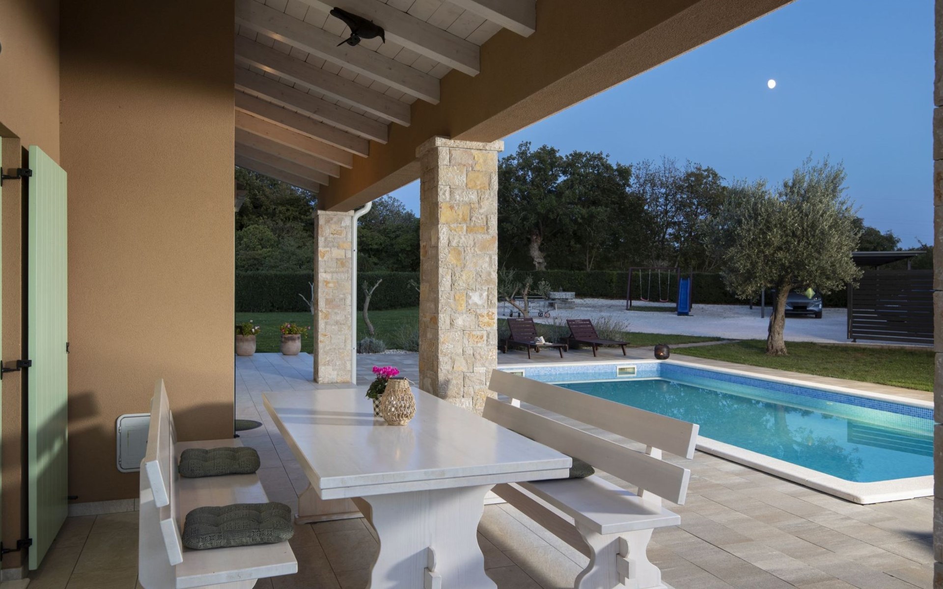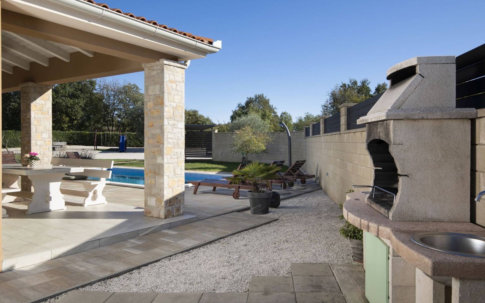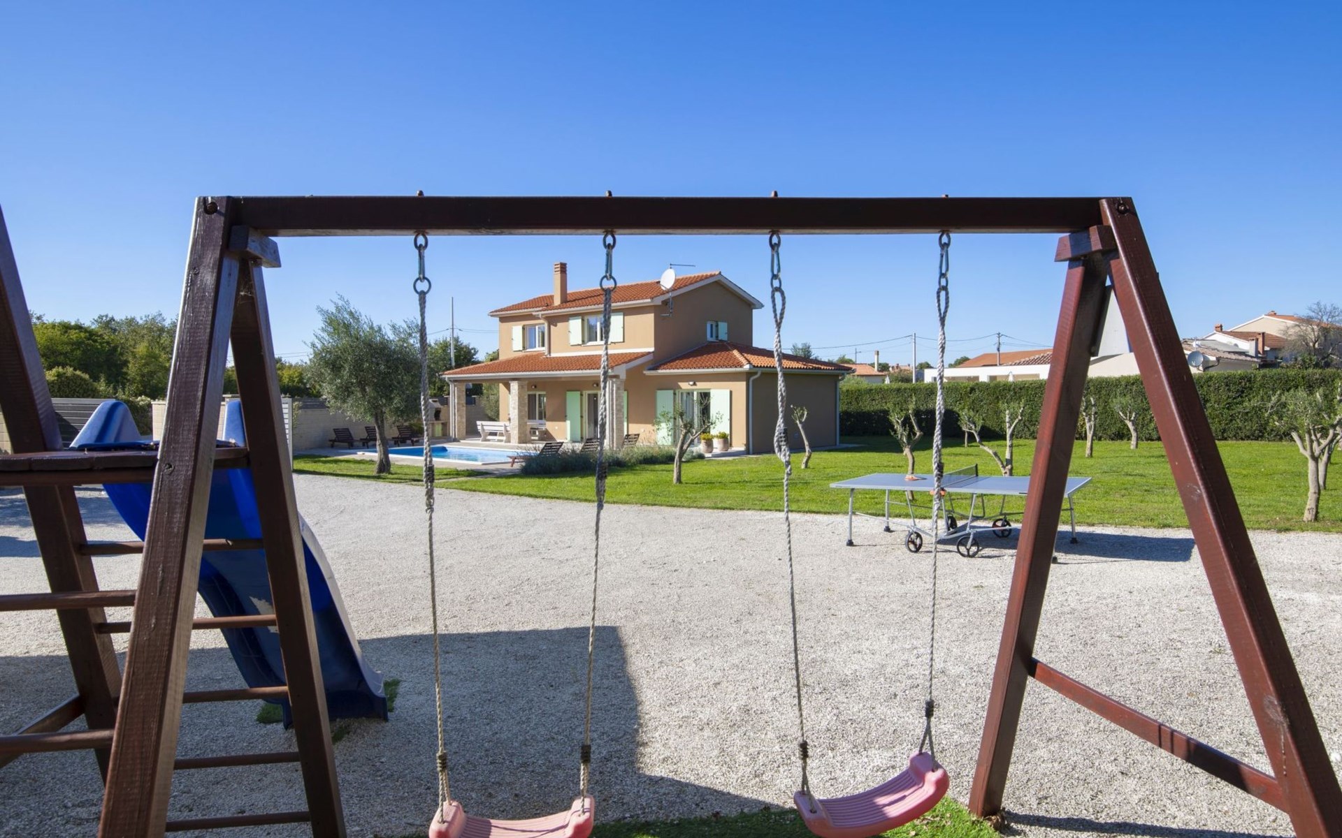 Das Anwesen verfügt über einen privaten Pool, einen Kinderspielplatz und einen Kohlegrill. Eine überdachte Terrasse mit einem Tisch im Freien, Schwimmen im Pool und ein gutes Barbecue sorgen für einen gelungenen Urlaub.