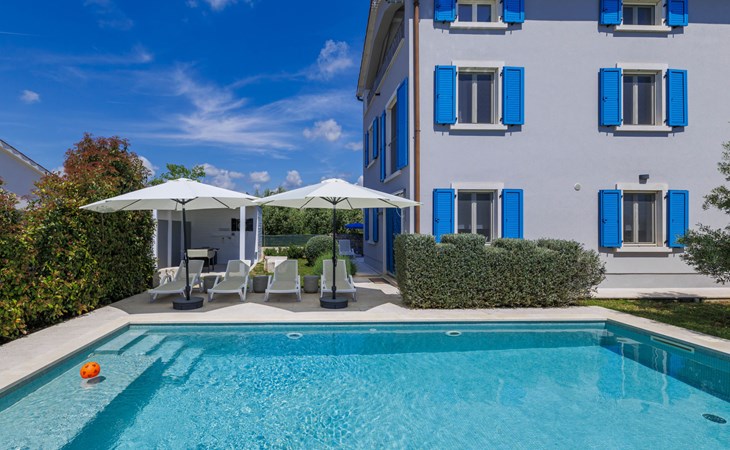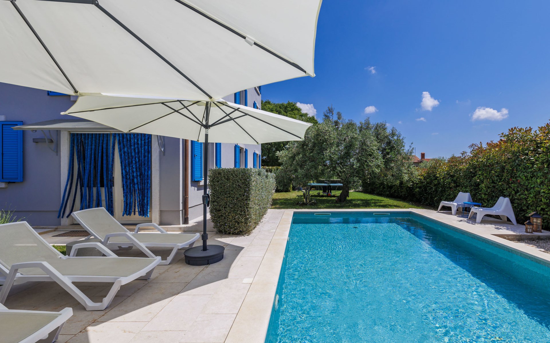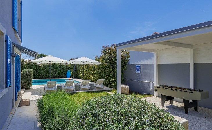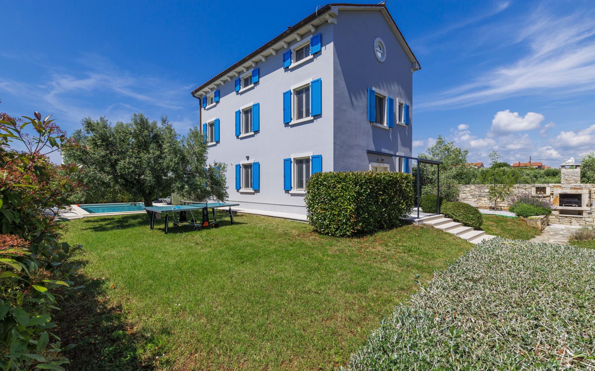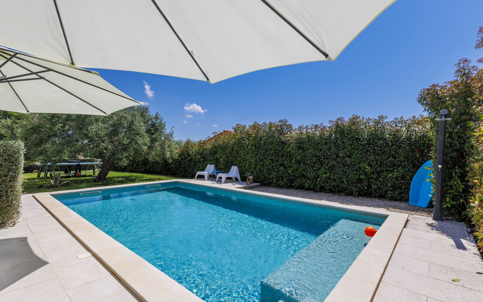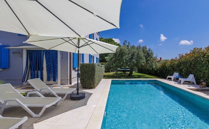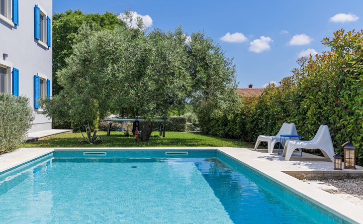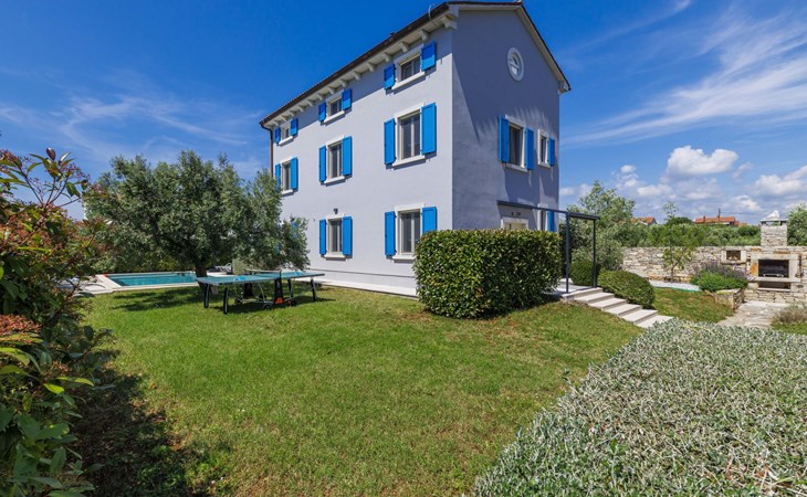 Galižana 5 km von Pula: Moderne, schöne, komfortable Villa "Gallicianum", auf 3 Stockwerken. 500 m vom Zentrum von Galižana, 5 km vom Meer, 5 km vom Strand. Zur Alleinbenutzung: Grundstück 916 m2 (eingezäunt), Garten mit Rasen und Bäumen, Schwimmbad eckig (8 x 4 m, 32 m2, 135 cm tief, saisonale Verfügbarkeit: 18.Mai. - 05.Okt.) mit Innentreppe. Aussendusche, Terrasse (20 m2), Gartenmöbel, Grill (Schaukel). Im Hause: Internetzugang, Tischtennis, Tischfussball, Klimaanlage, Waschmaschine. Parkplatz (für 3 Autos) beim Haus auf dem Grundstück. Einkaufsgeschäft 500 m, Supermarkt 3 km, Restaurant 3 km, Bushaltestelle 750 m, Kieselstrand 5 km, Felsstrand 5 km. Jugendgruppen nur auf Anfrage.