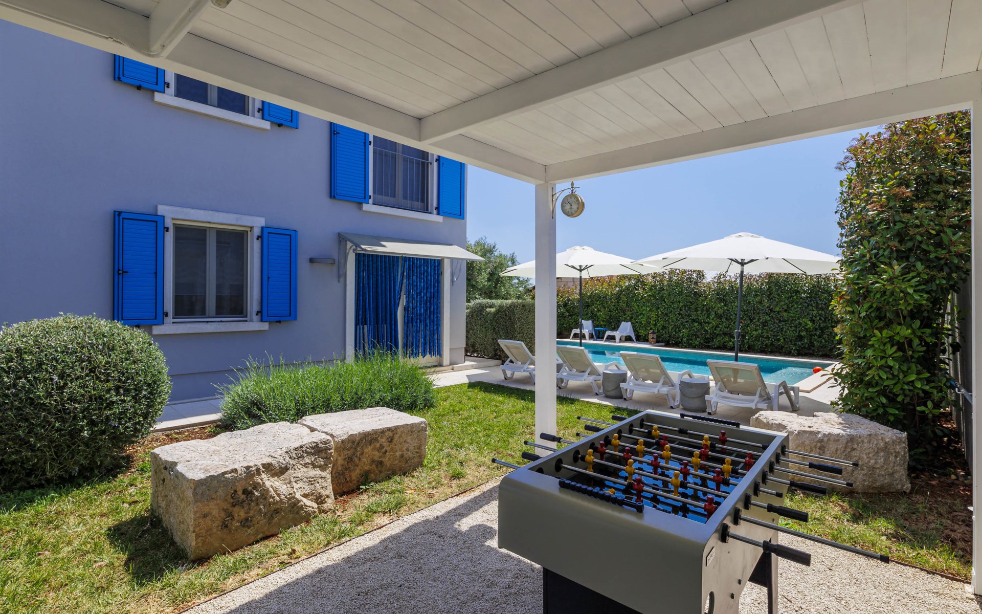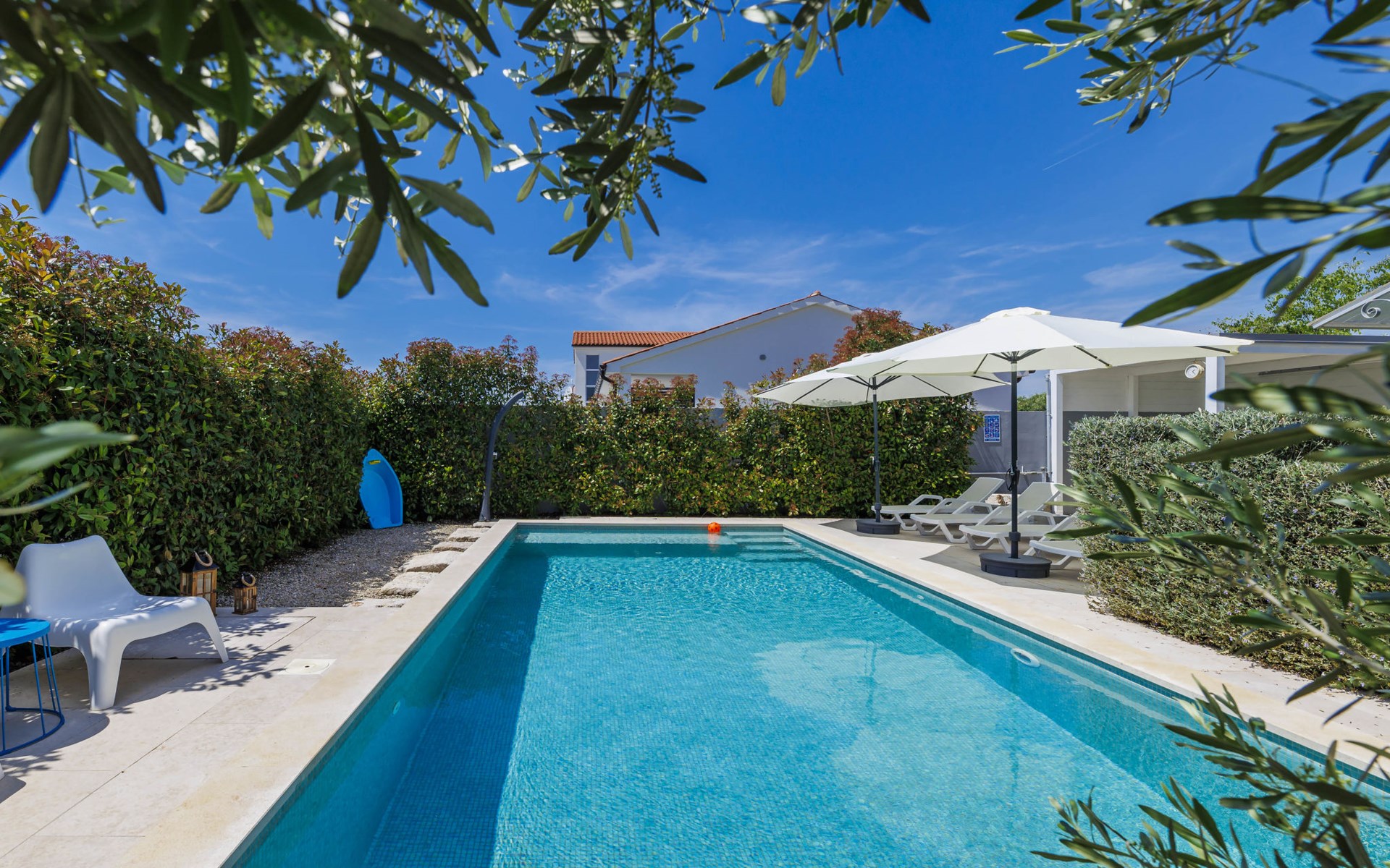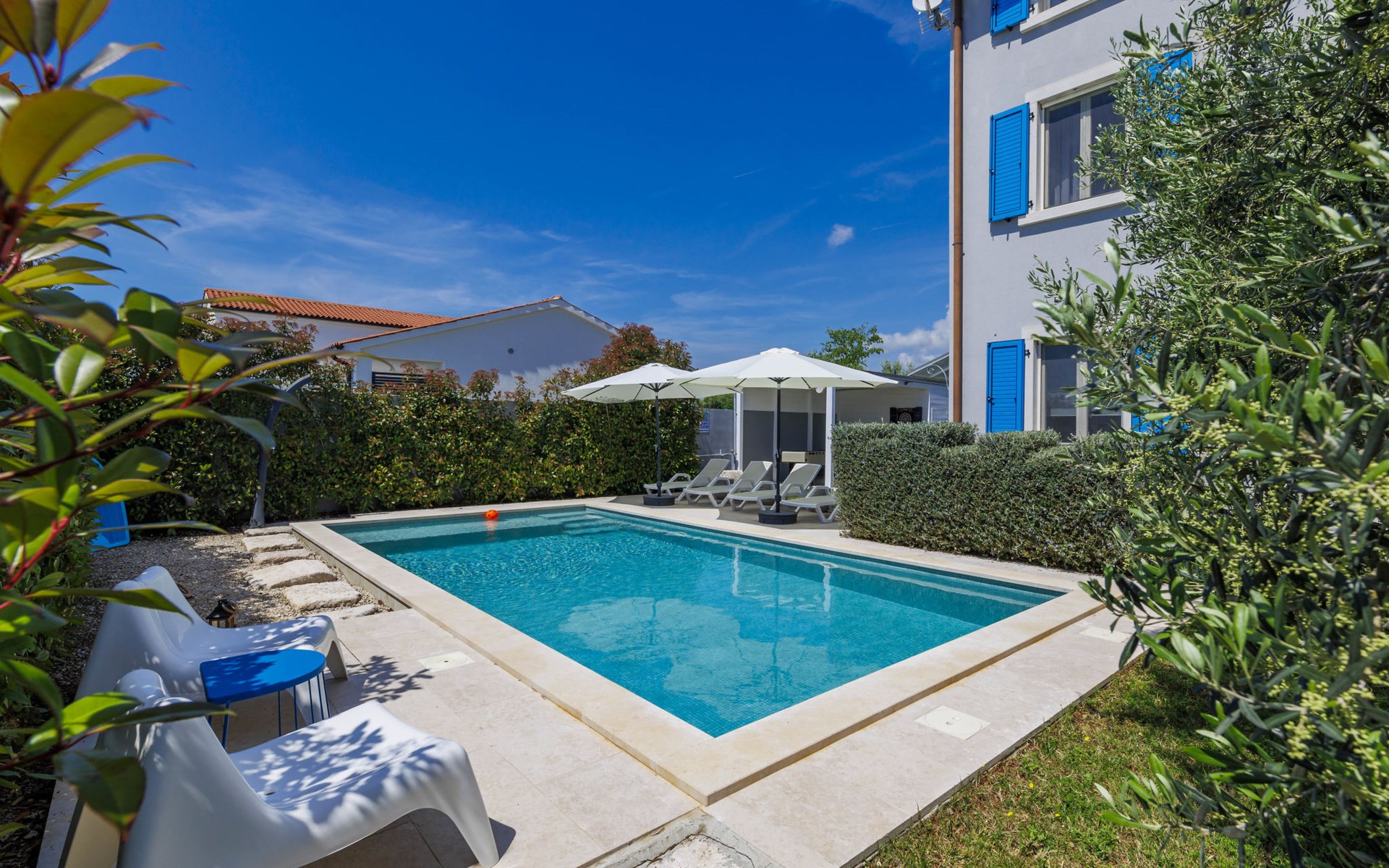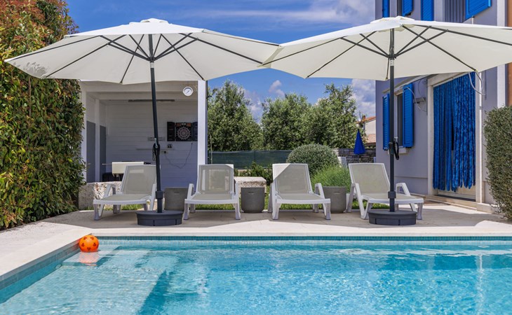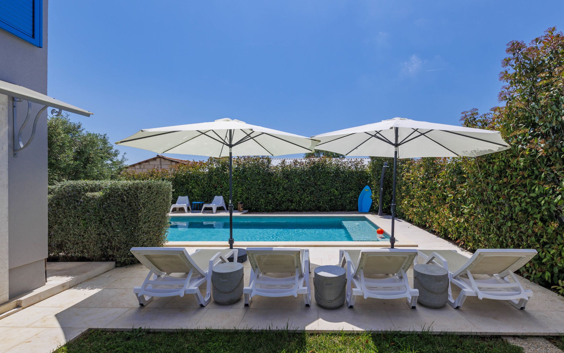 Galižana 5 km von Pula: Moderne, schöne, komfortable Villa "Gallicianum", auf 3 Stockwerken. 500 m vom Zentrum von Galižana, 5 km vom Meer, 5 km vom Strand. Zur Alleinbenutzung: Grundstück 916 m2 (eingezäunt), Garten mit Rasen und Bäumen, Schwimmbad eckig (8 x 4 m, 32 m2, 135 cm tief, saisonale Verfügbarkeit: 18.Mai. - 05.Okt.) mit Innentreppe. Aussendusche, Terrasse (20 m2), Gartenmöbel, Grill (Schaukel). Im Hause: Internetzugang, Tischtennis, Tischfussball, Klimaanlage, Waschmaschine. Parkplatz (für 3 Autos) beim Haus auf dem Grundstück. Einkaufsgeschäft 500 m, Supermarkt 3 km, Restaurant 3 km, Bushaltestelle 750 m, Kieselstrand 5 km, Felsstrand 5 km. Jugendgruppen nur auf Anfrage.
