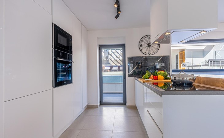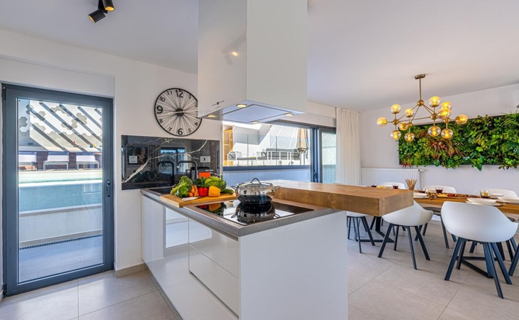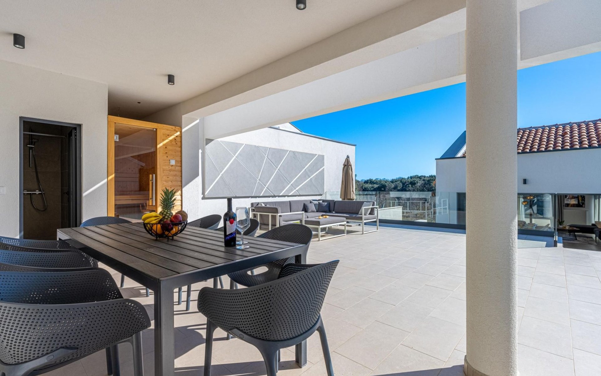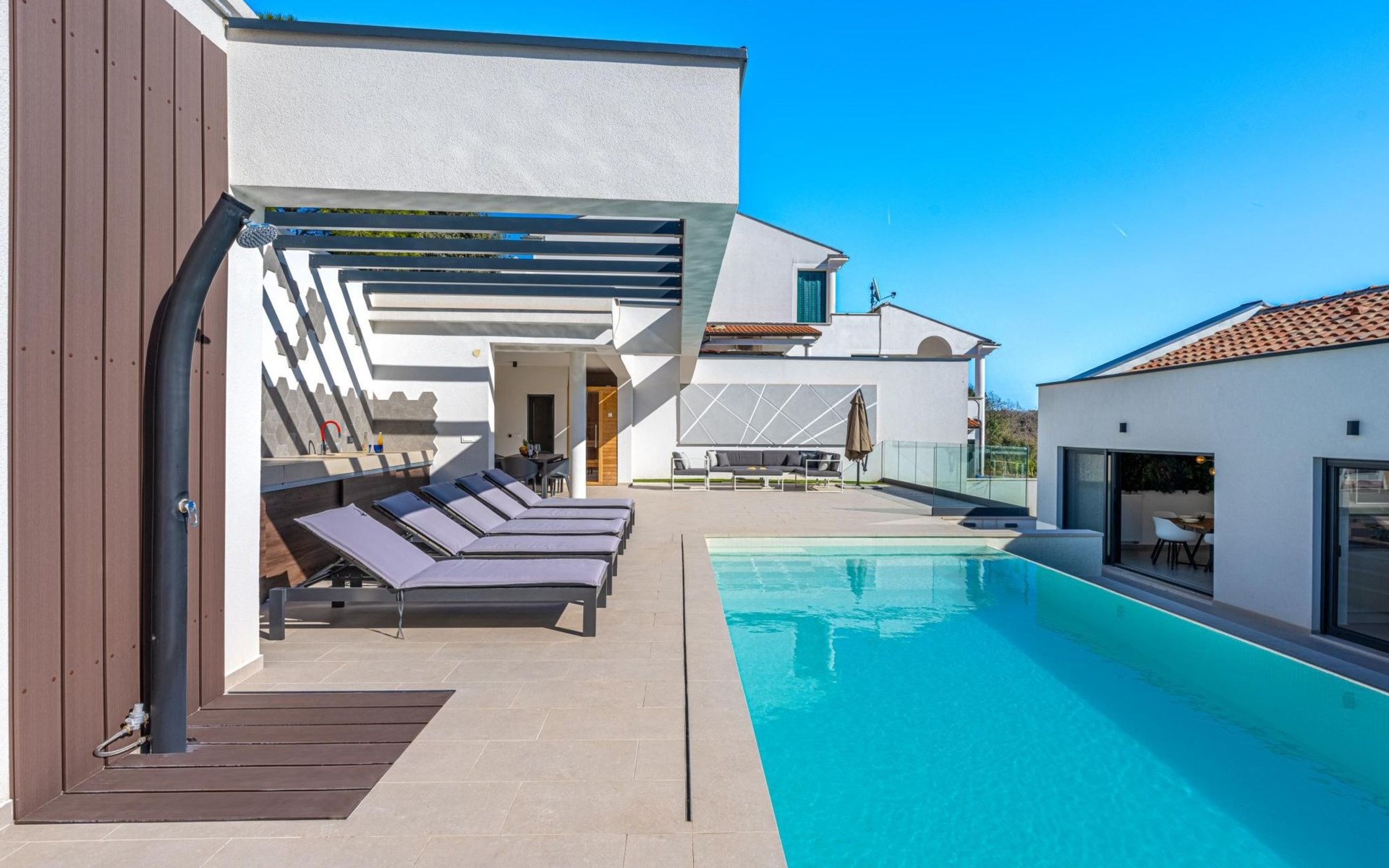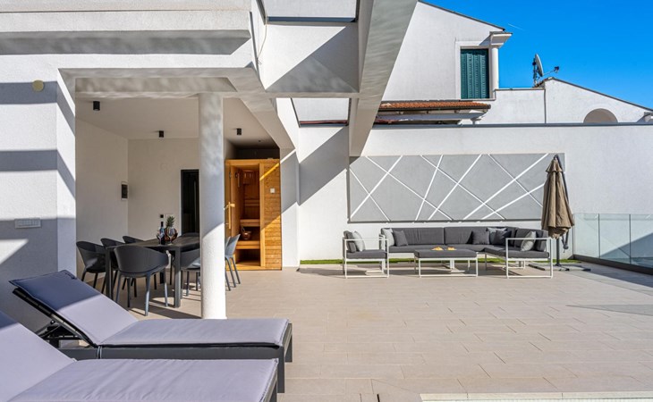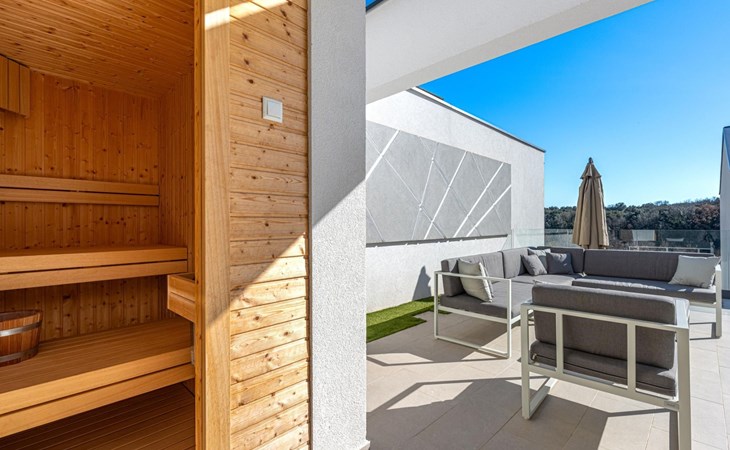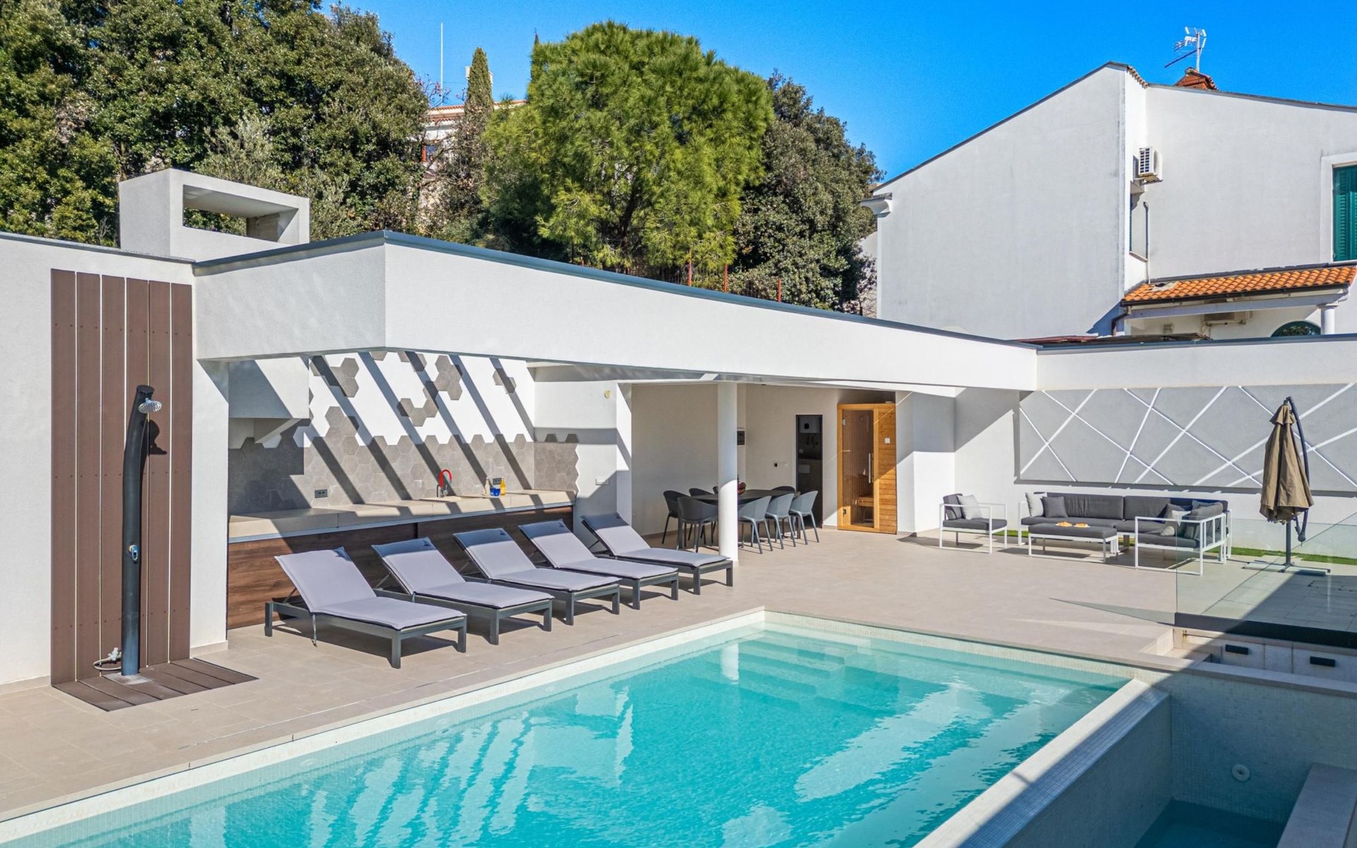 Im Garten befindet sich ein wunderschöner privater Pool mit einer Fläche von 30 m2, der mit bequemen Sonnenliegen und einer Außendusche ausgestattet ist. Außerdem können Sie sich im Lounge-Bereich auf der Terrasse entspannen oder die private Sauna nutzen. Direkt neben der Sauna befindet sich ein Badezimmer mit Dusche.