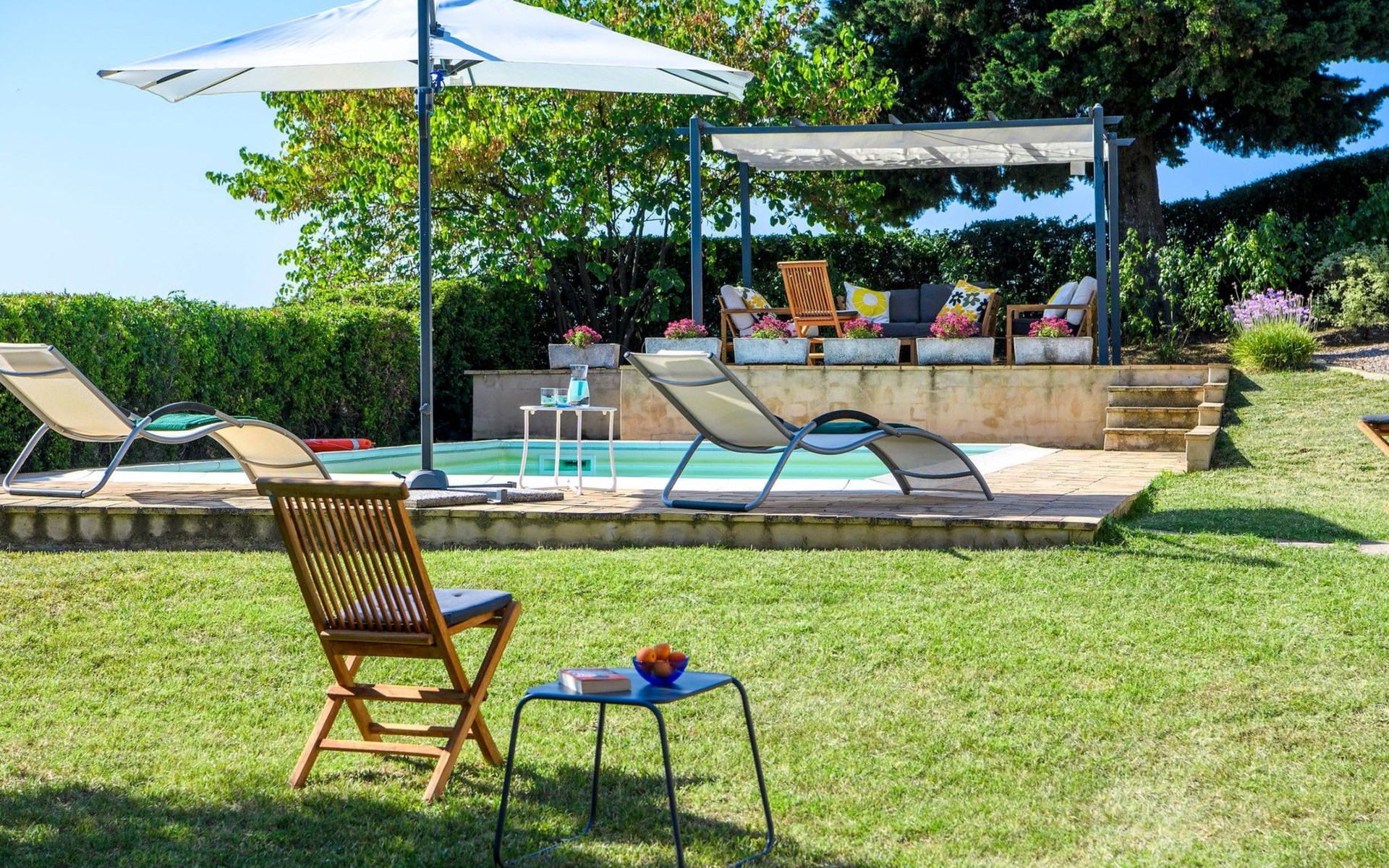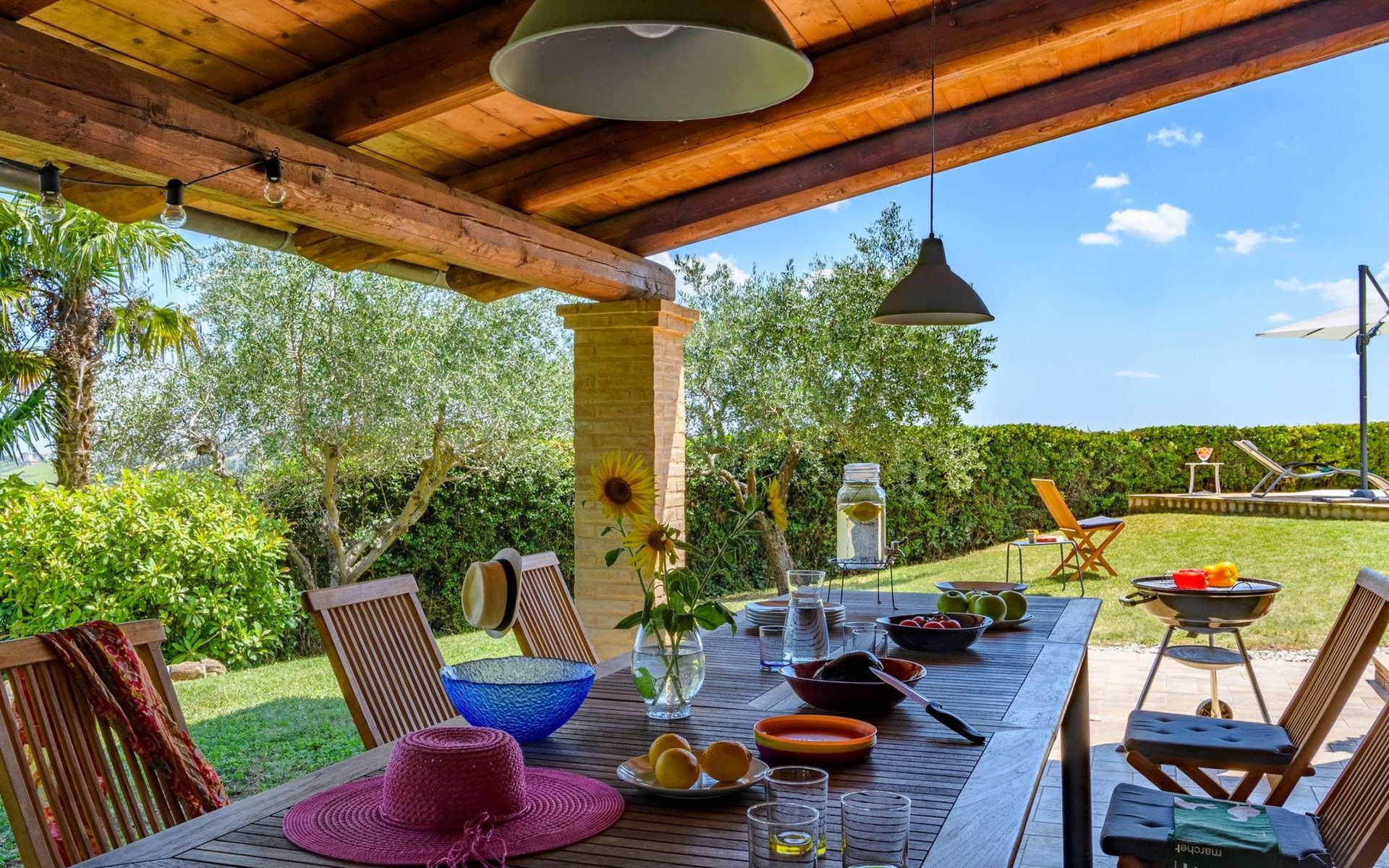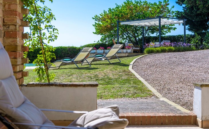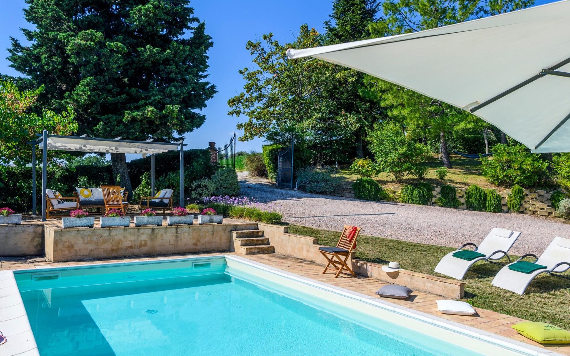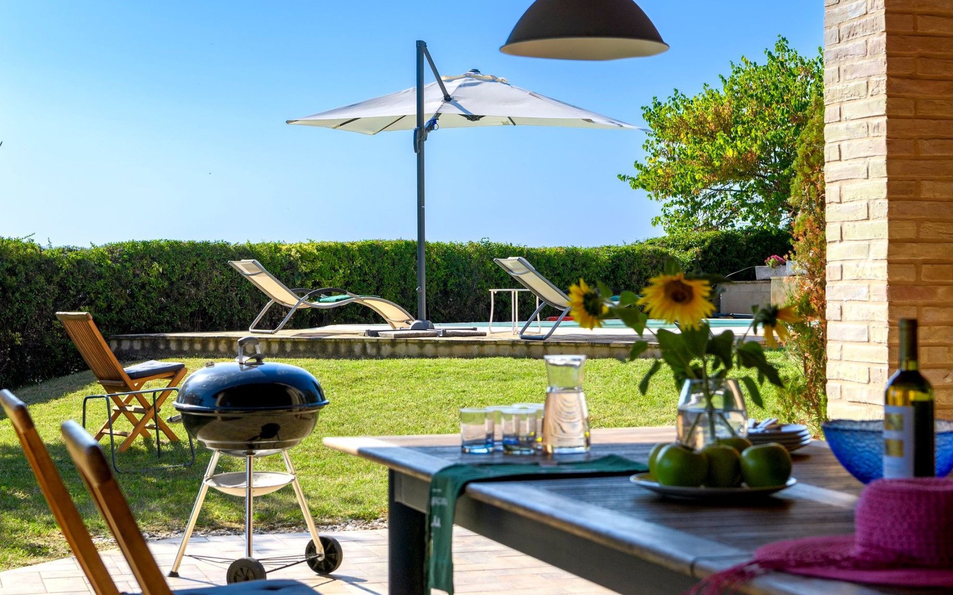Das Grundstück ist komplett eingezäunt, der Swimmingpool lädt zu einem erfrischenden Bad ein und unter dem Pavillon kann man sich auf den Sofas entspannen und die Aussicht genießen, oder für die Aktiven Tischtennis spielen. Auf der Rückseite des Hauses gibt es eine schöne Pergola, die von Weinreben beschattet wird, eine ruhige Ecke, die von Grün umgeben ist.